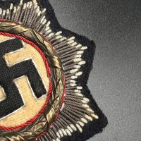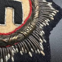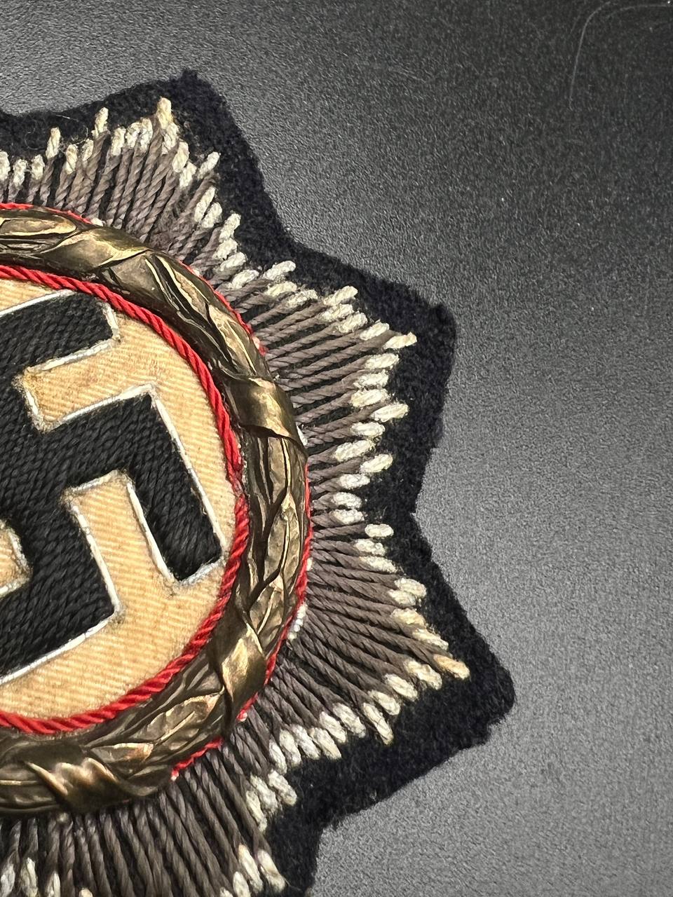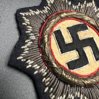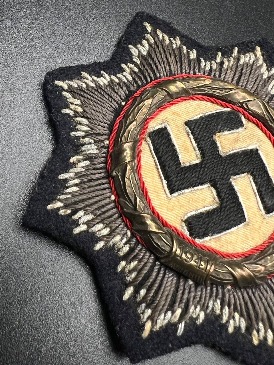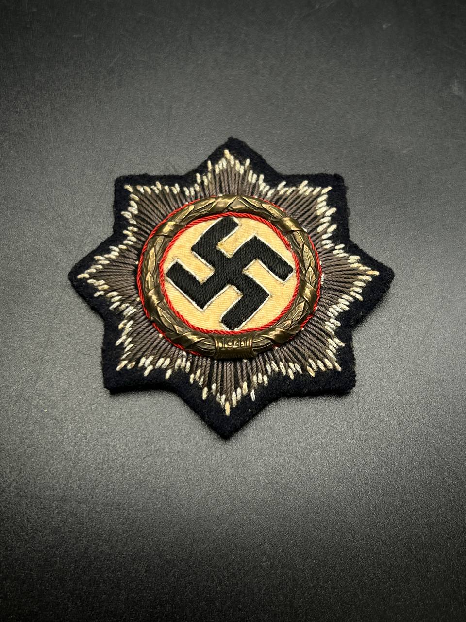 Original embroidered (cloth) version of the German Cross for the Kriegsmarine, intended for wear on field and service uniforms. Produced as an eight-pointed star with silver-embroidered rays on a black backing. The center shows a cloth swastika on a light field, surrounded by a wreath with red piping. The reverse is cloth-backed and displays typical period wear and stitch traces. An authentic wartime insignia with honest service wear and natural patina, unrestored.