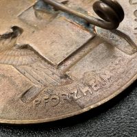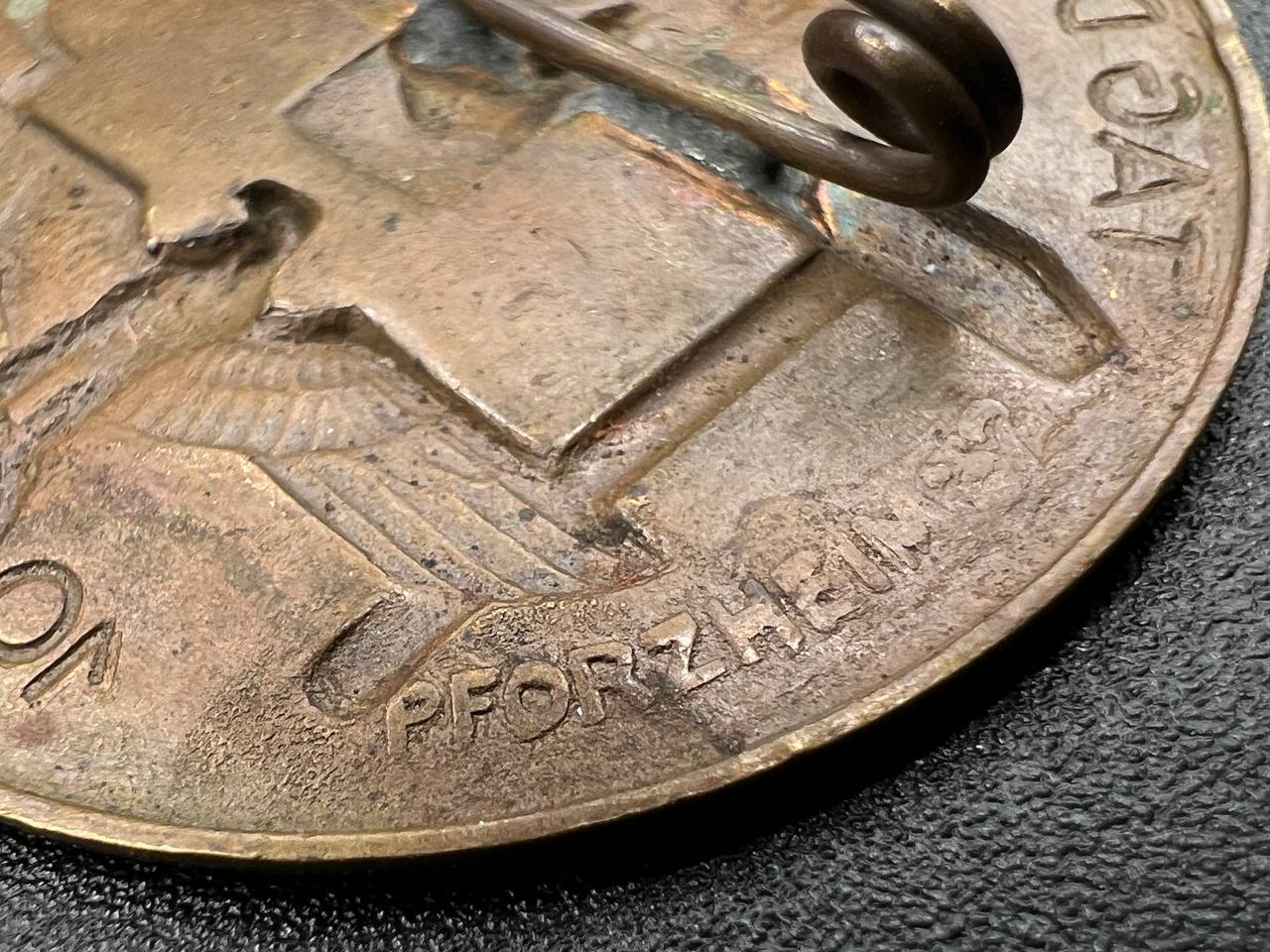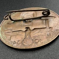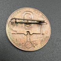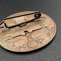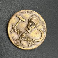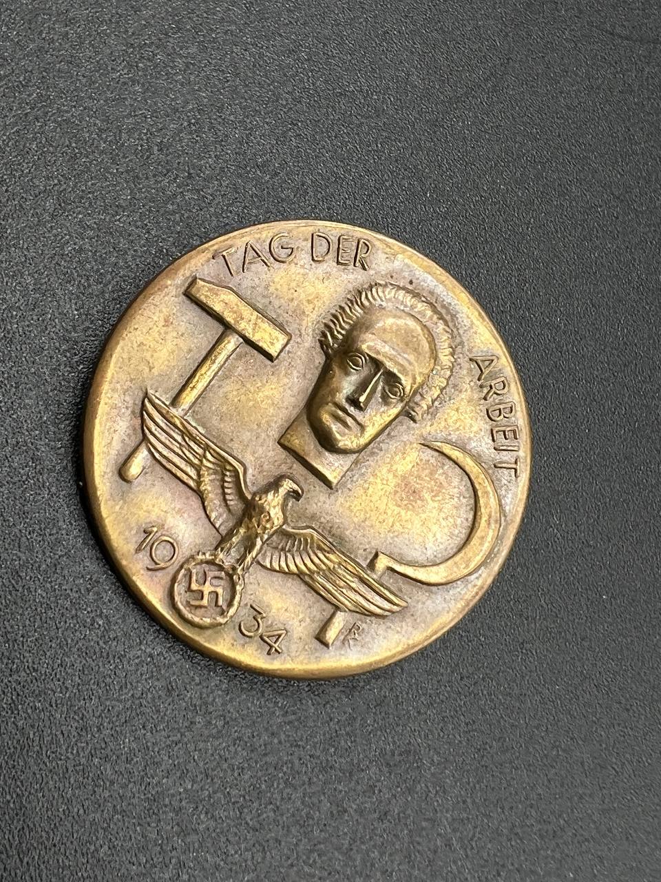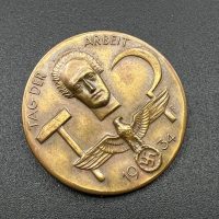 Original German event badge issued for the “Day of Labour” (Tag der Arbeit) celebrations on May 1st, 1934. Die-struck bronze-finished metal with pin-back fastening. The obverse depicts a worker’s head above hammer and sickle, with an eagle and swastika below, dated 1934. Issued to participants of the German Labour Front (Deutsche Arbeitsfront, DAF). Very good condition with even bronze patina.