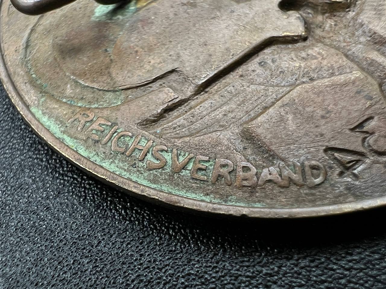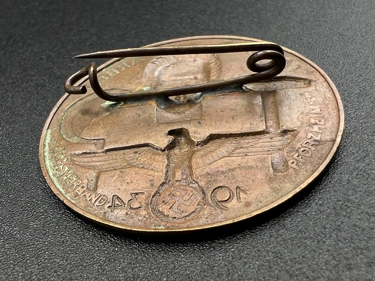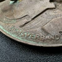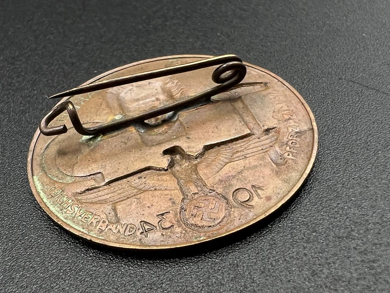 Original German event badge issued for the “Day of Labour” (Tag der Arbeit) celebrations on May 1st, 1934. Die-struck bronze-finished metal with pin-back fastening. The obverse depicts a worker’s head above hammer and sickle, with an eagle and swastika below, dated 1934. Issued to participants of the German Labour Front (Deutsche Arbeitsfront, DAF). Very good condition with even bronze patina.