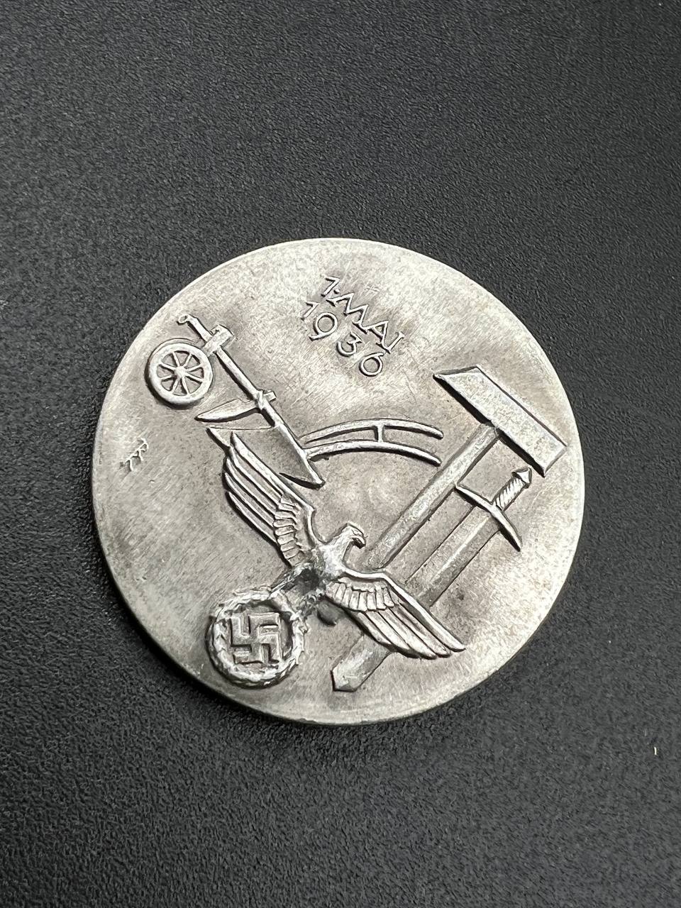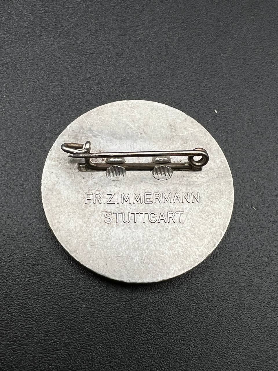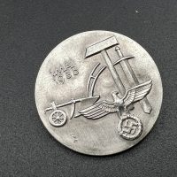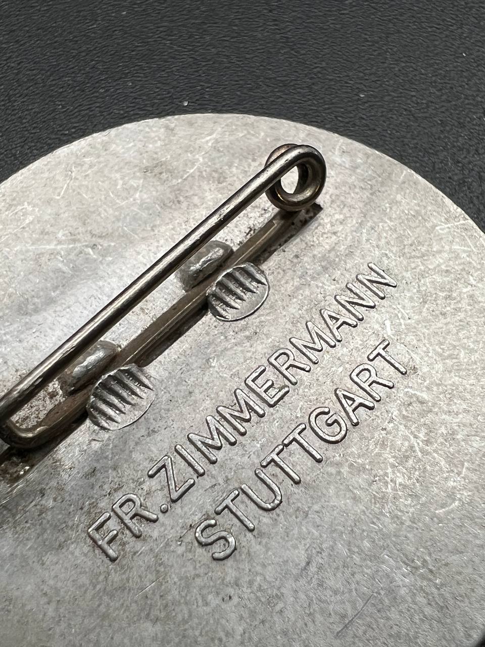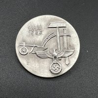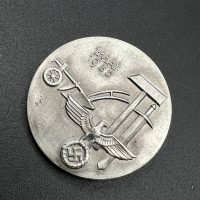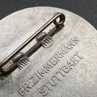 Original German event badge issued for the “Day of Labour” (Tag der Arbeit) celebrations on May 1st, 1936. Die-struck aluminum with pin-back fastening. The obverse depicts a plow, hammer, and sickle beneath a national eagle with swastika — symbolizing unity of workers, farmers, and the state. Reverse marked Fr. Zimmermann, Stuttgart. One of the finest designs in the “Day of Labour” tinnie series. Excellent condition.