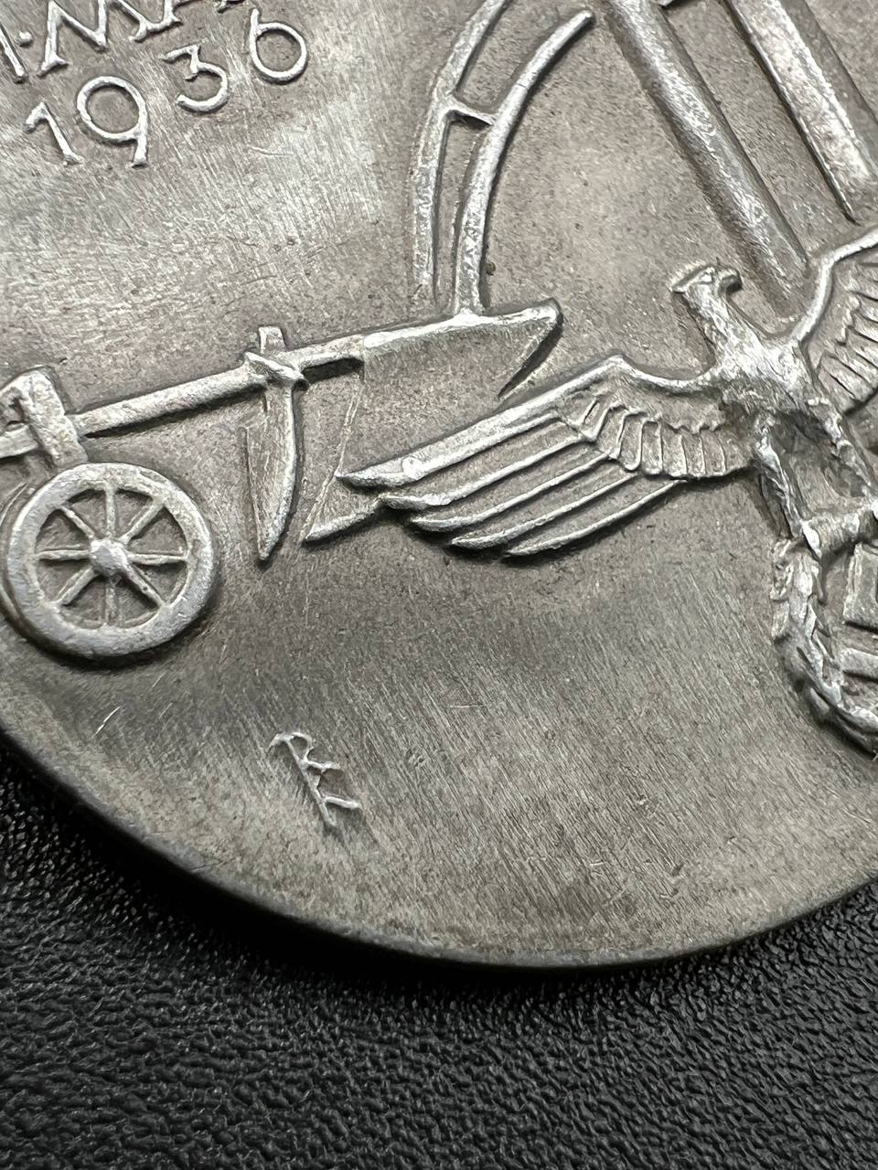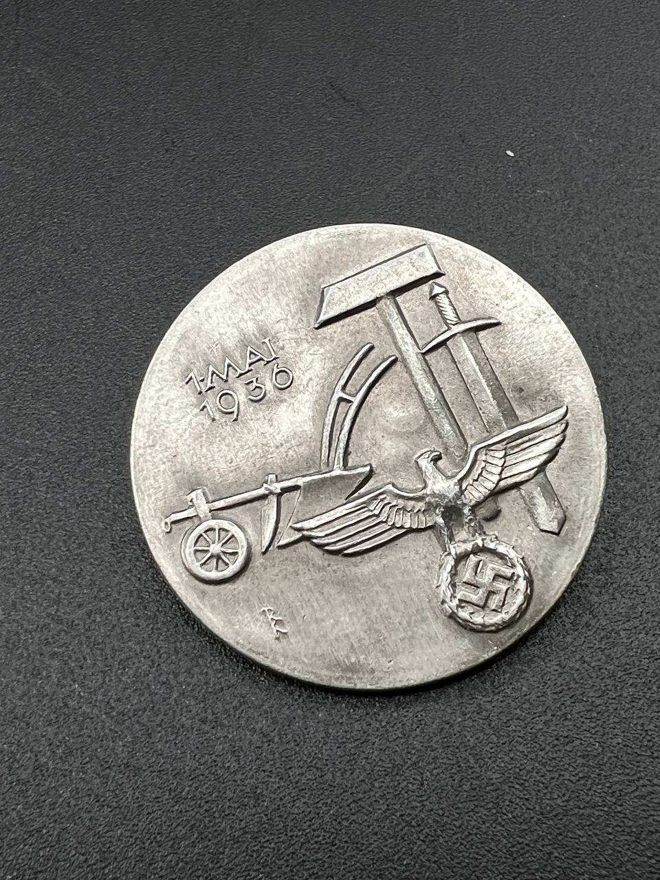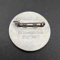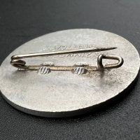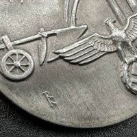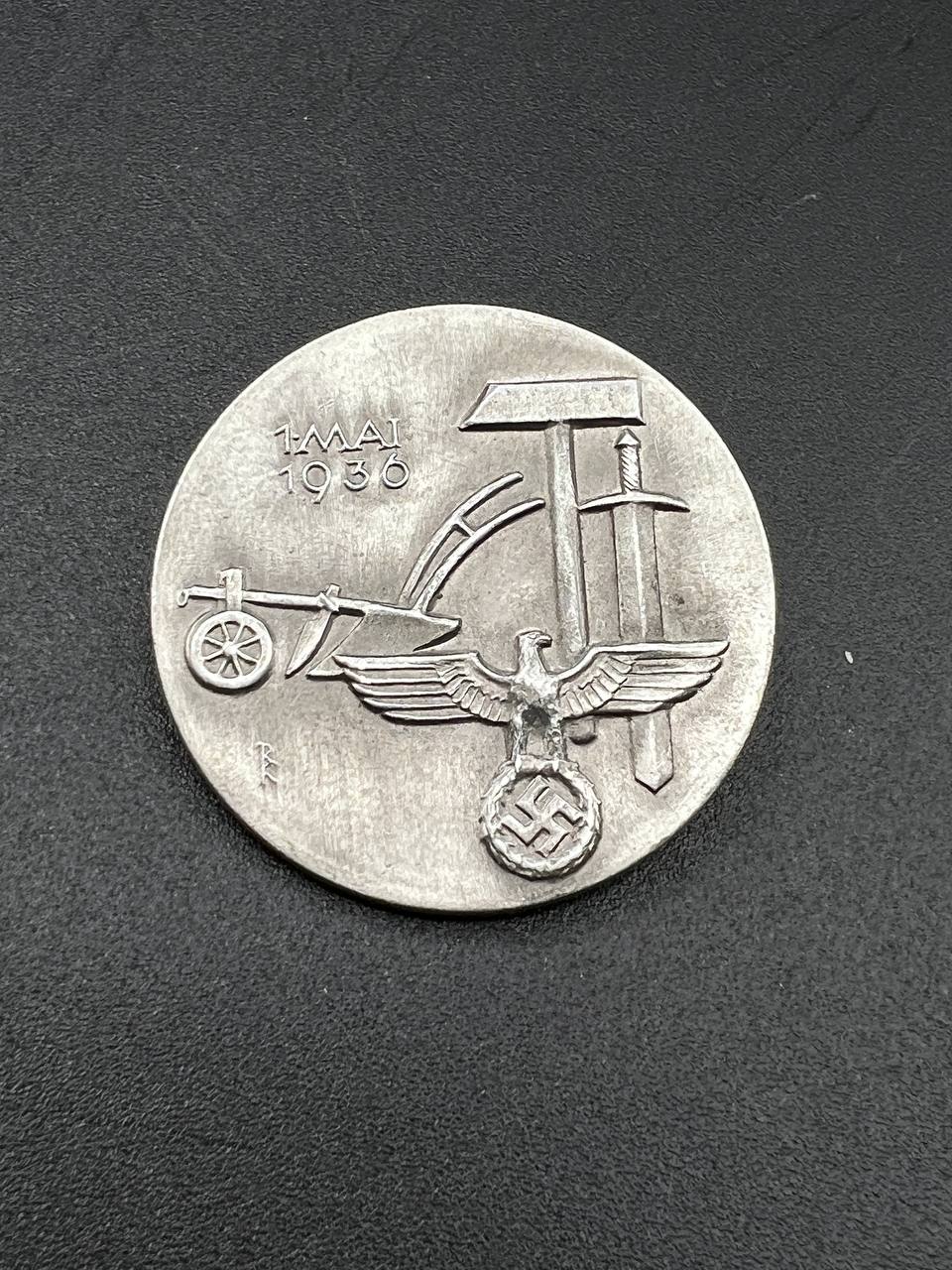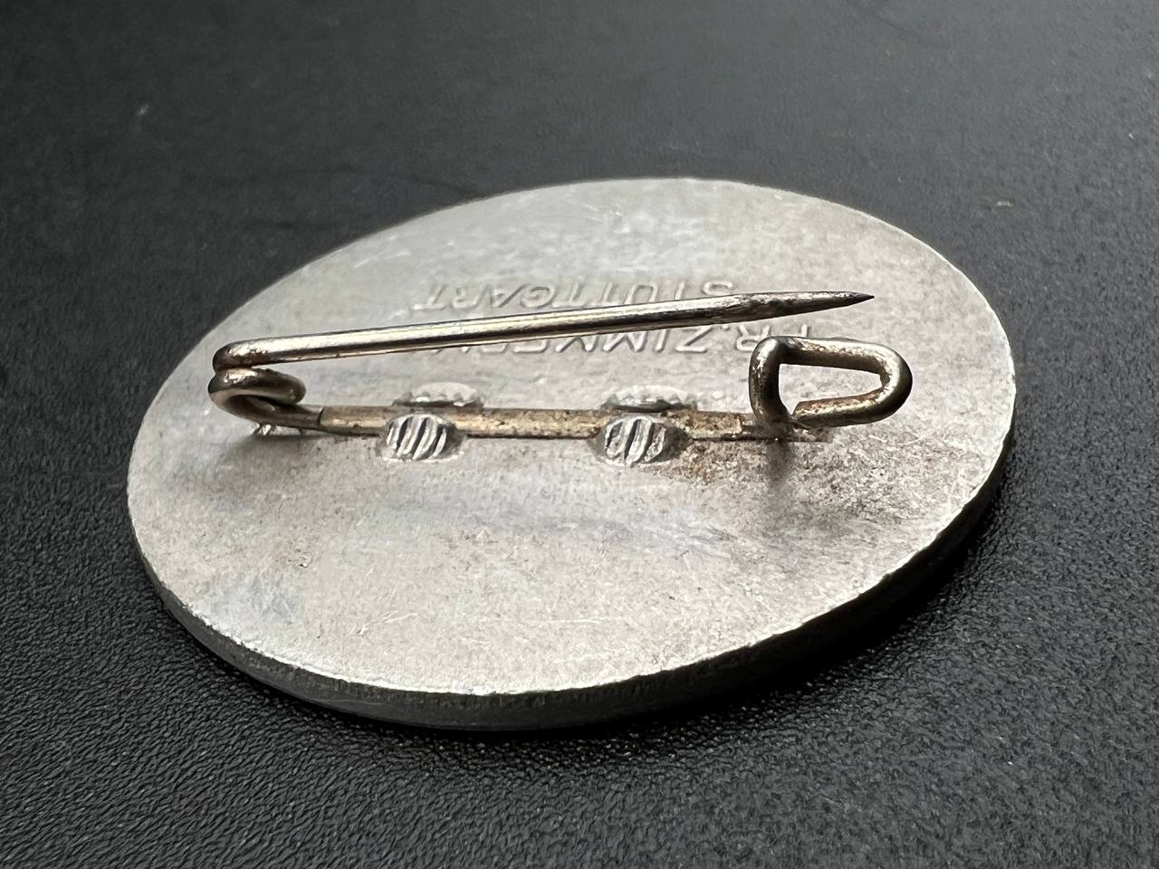 Original German event badge issued for the “Day of Labour” (Tag der Arbeit) celebrations on May 1st, 1936. Die-struck aluminum with pin-back fastening. The obverse depicts a plow, hammer, and sickle beneath a national eagle with swastika — symbolizing unity of workers, farmers, and the state. Reverse marked Fr. Zimmermann, Stuttgart. One of the finest designs in the “Day of Labour” tinnie series. Excellent condition.