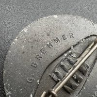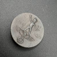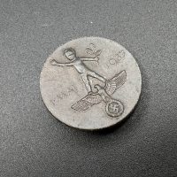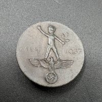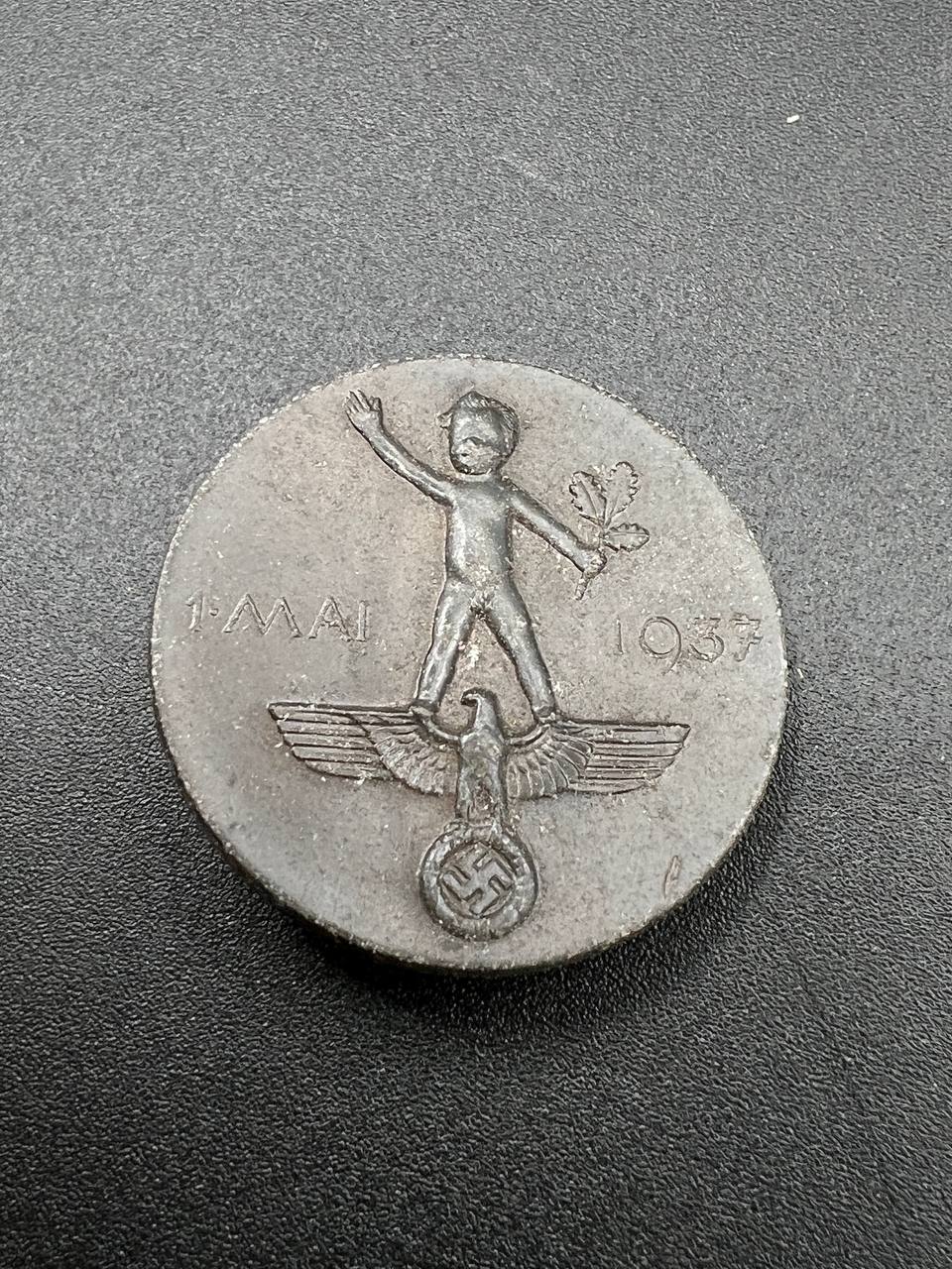 Original German event badge issued for the “Day of Labour” (Tag der Arbeit) on May 1st, 1937. Die-struck aluminum with pin-back fastening. The obverse depicts a child standing atop the national eagle holding an oak leaf — symbolizing Germany’s rebirth and future through labour. Reverse maker-marked G. Brehmer, Markneukirchen. One of the most artistic and distinctive designs in the “Day of Labour” series. Very good condition with mild age patina.