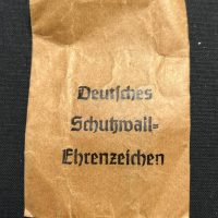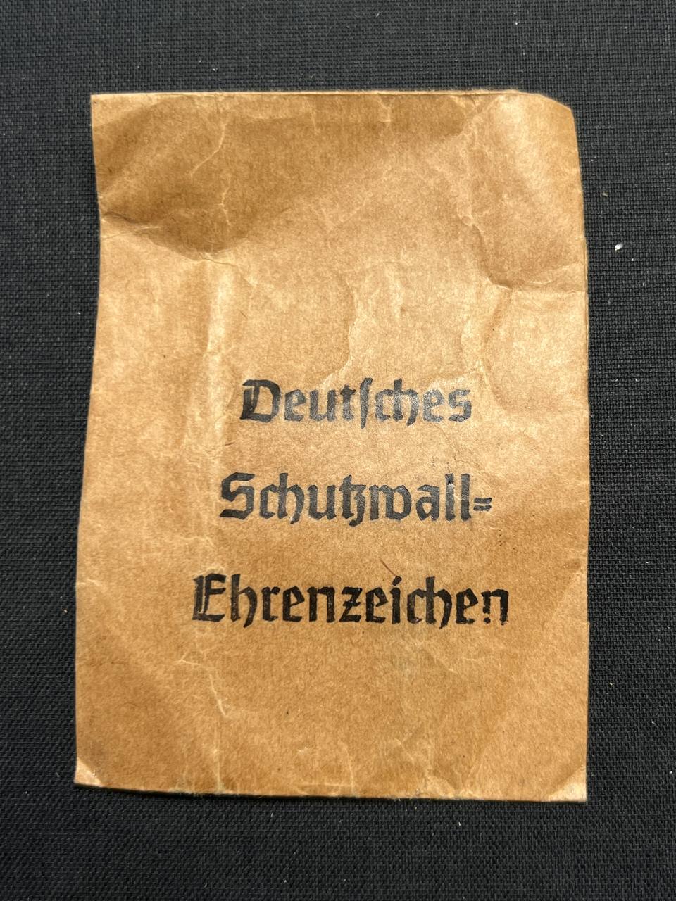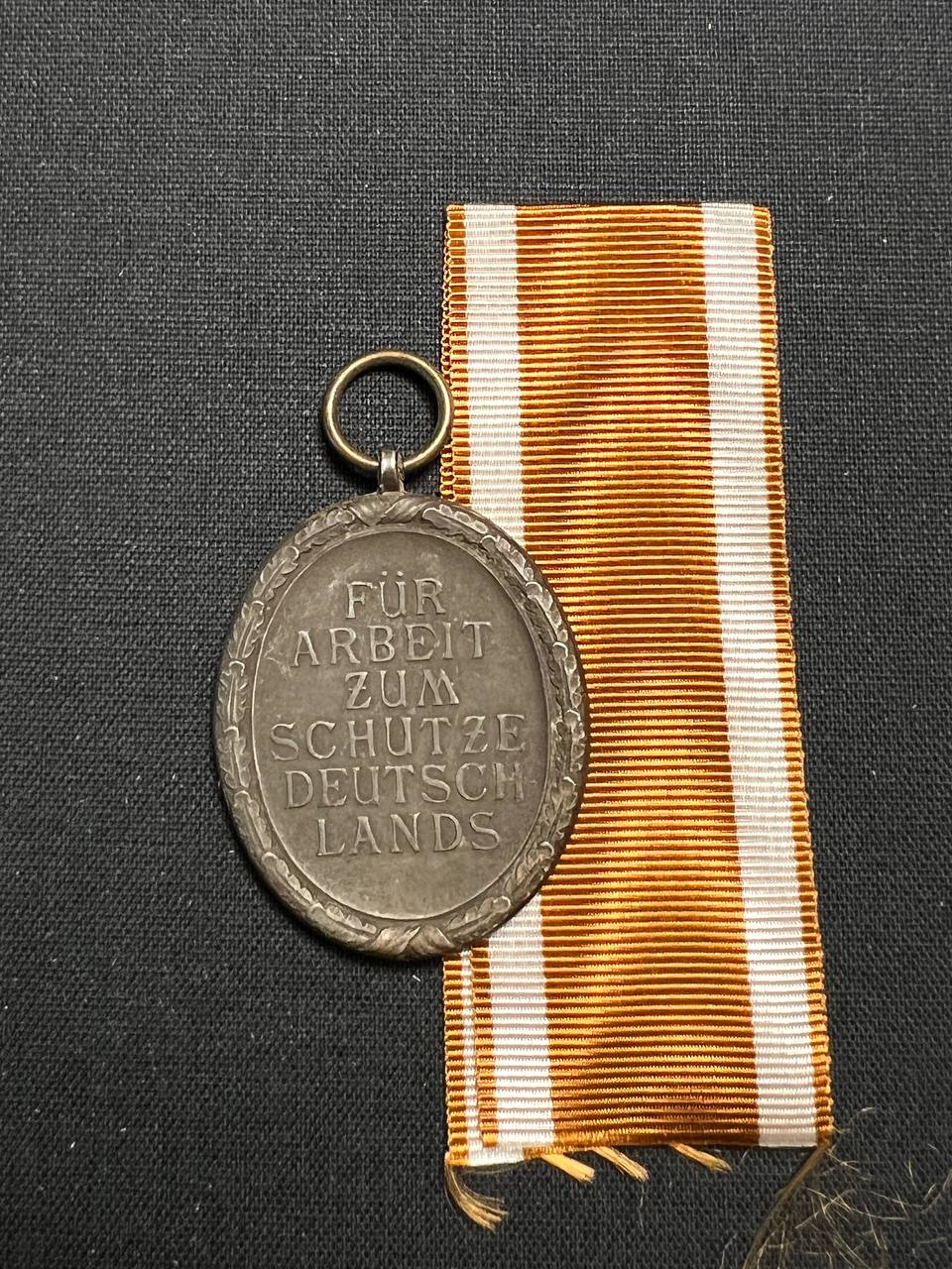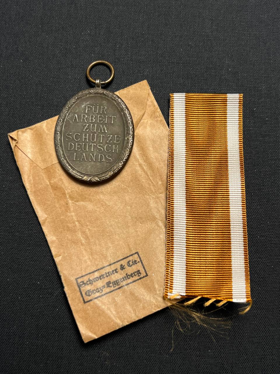 Oval medal with dark-silver finish and sharp relief; reverse marked “Für Arbeit zum Schutze Deutschlands”. Includes original ribbon and maker-marked paper packet (Schworzin & Cie, Graz-Eggenberg). Good collectible condition.
