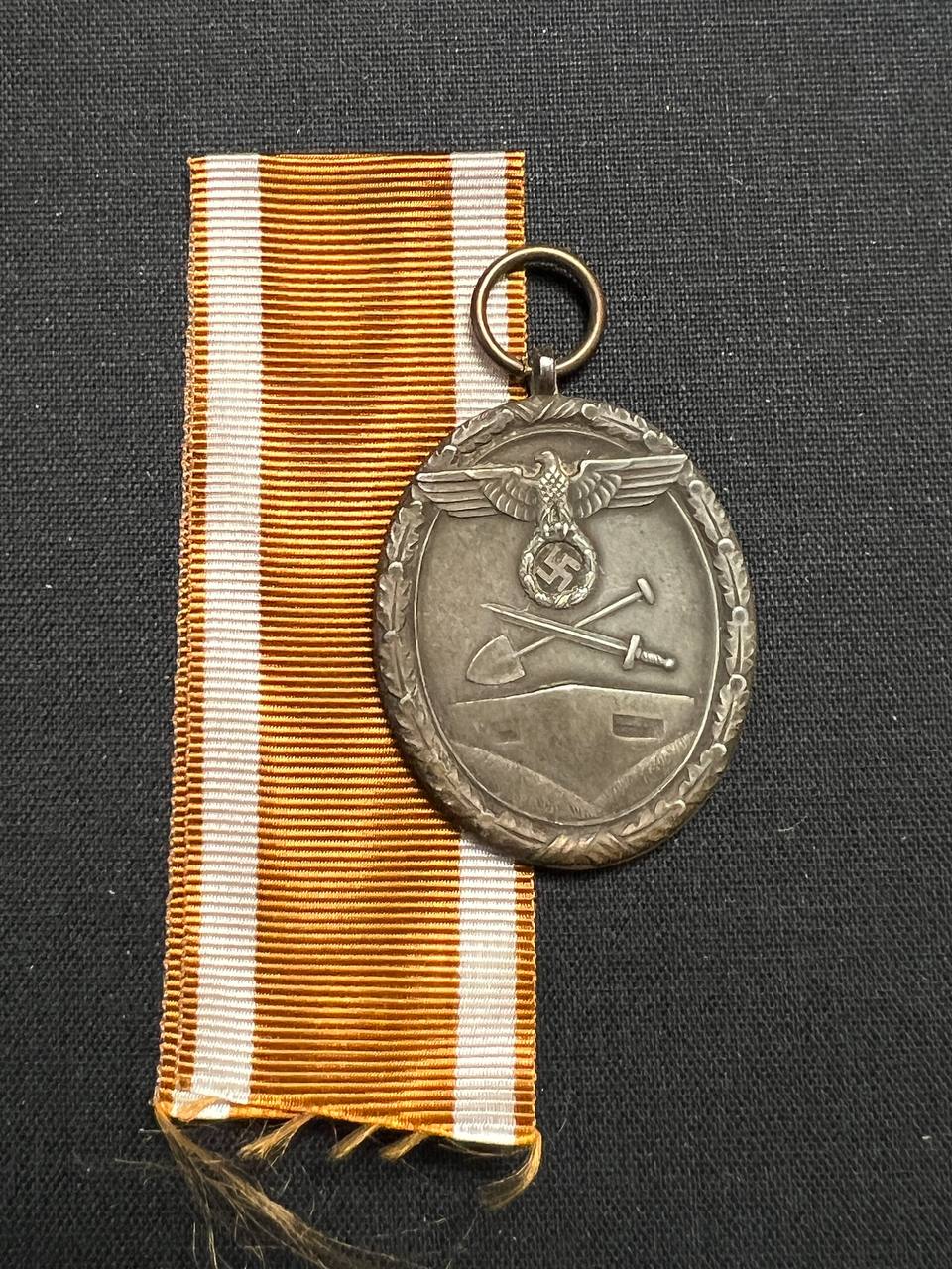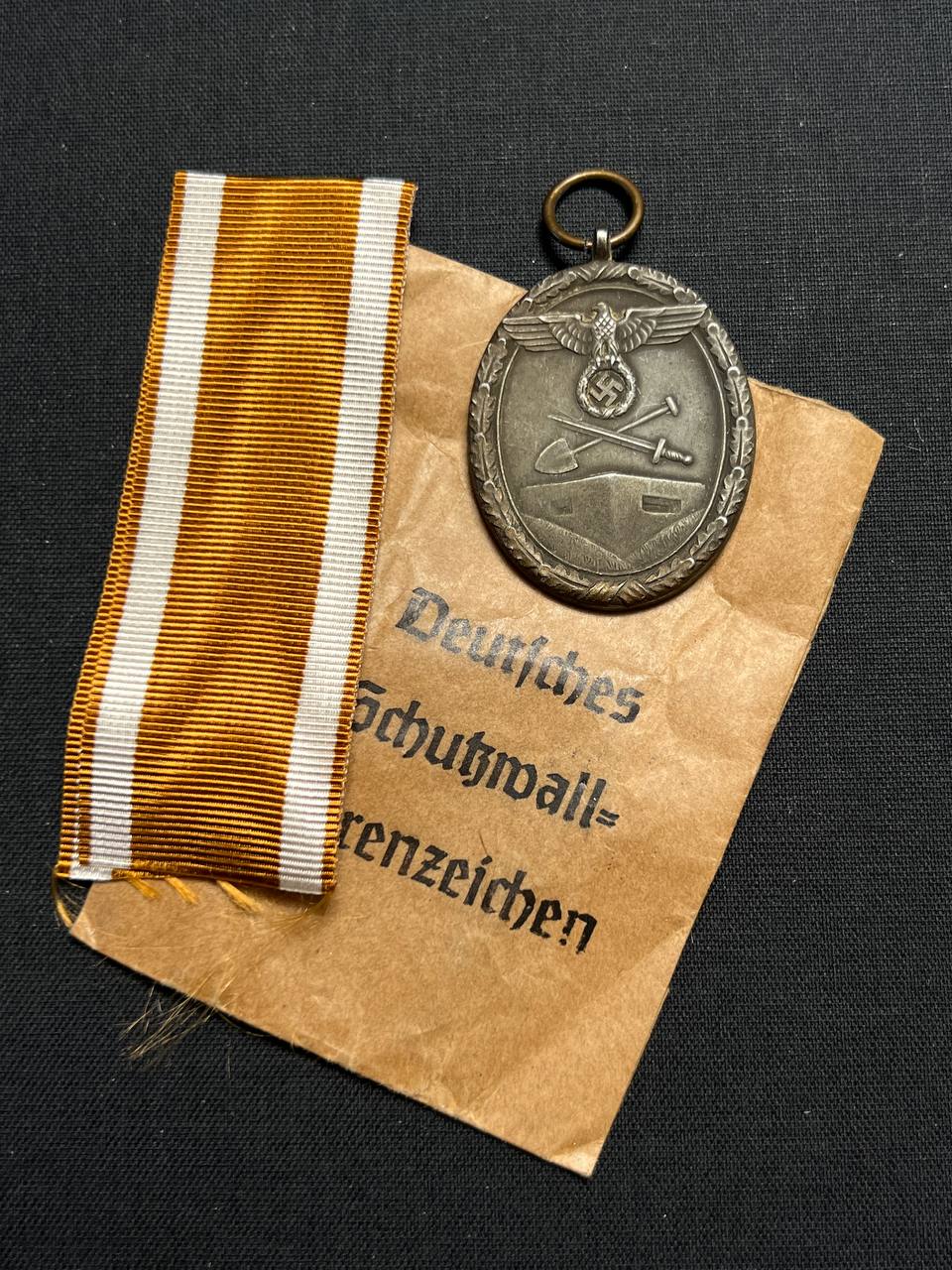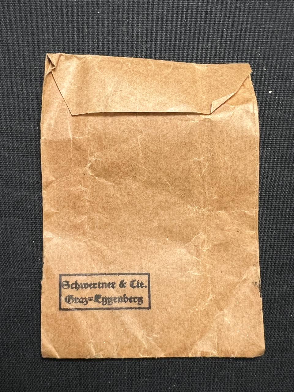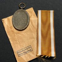 Oval medal with dark-silver finish and sharp relief; reverse marked “Für Arbeit zum Schutze Deutschlands”. Includes original ribbon and maker-marked paper packet (Schworzin & Cie, Graz-Eggenberg). Good collectible condition.
