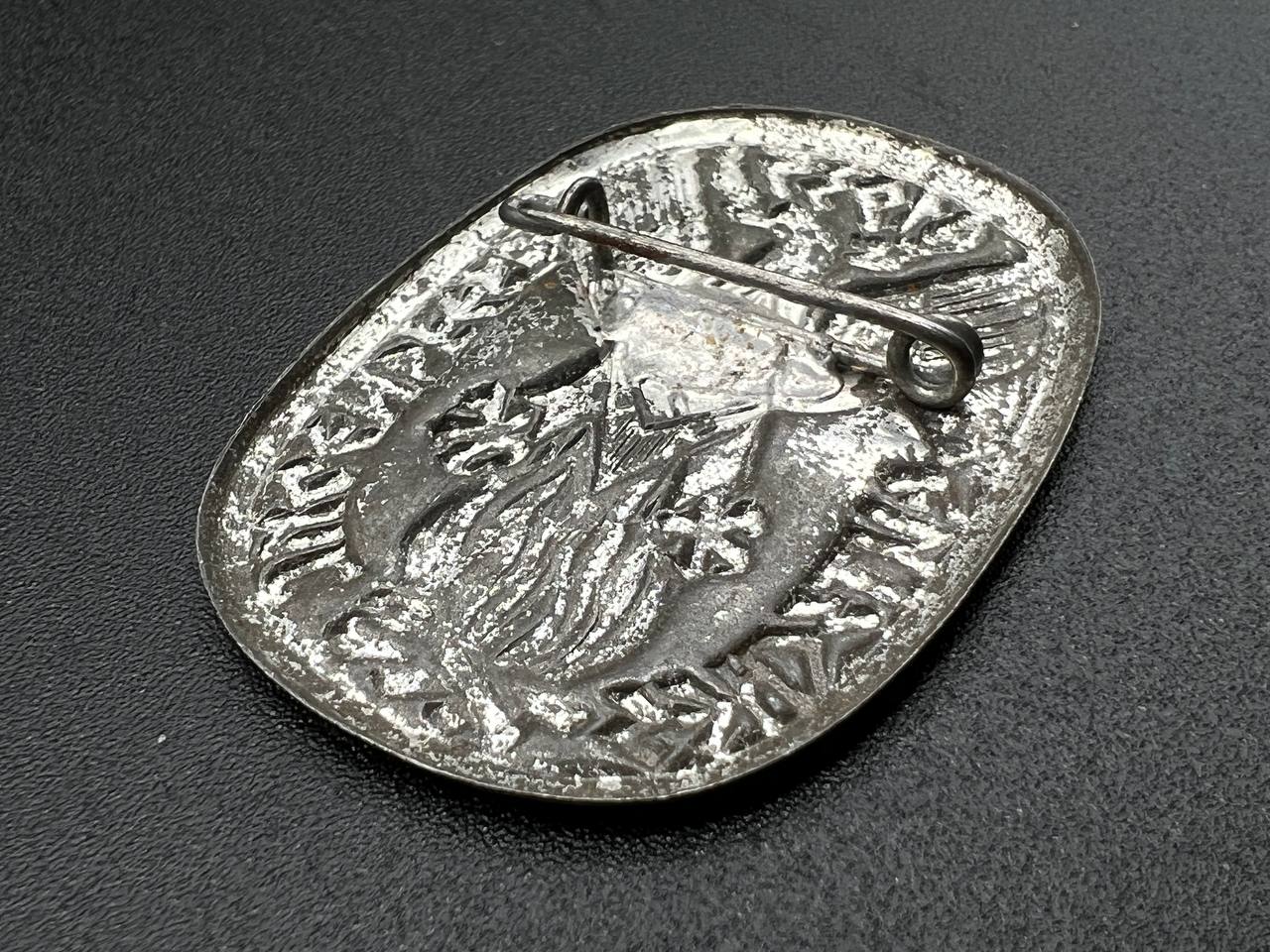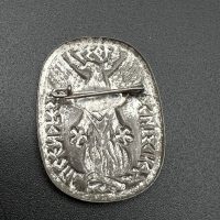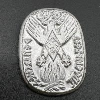 Original Hitler Youth commemorative badge issued for the Jugendfest (Youth Festival) of 1937. Die-struck aluminum alloy construction with pin-back fastening. The obverse depicts an eagle clutching the Hitlerjugend diamond above a campfire, surrounded by the inscription “Jugendfest 1937” in runic script. Typical propaganda tinnie of the Third Reich period. Good condition with light age wear.