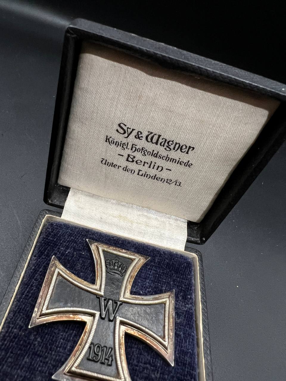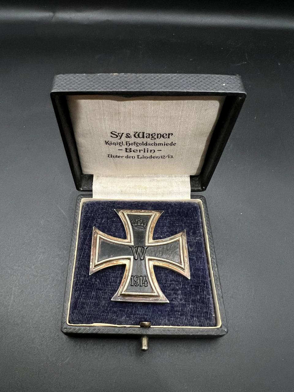 A premium early Iron Cross 1st Class (EK1 1914) manufactured by Sy & Wagner, the Royal Court Goldsmiths of Berlin (Sy & Wagner – Königl. Hofgoldschmiede – Berlin, Unter den Linden 12/13). One of the most desirable and scarce First World War EK1 variants.