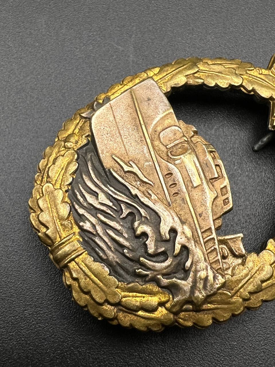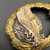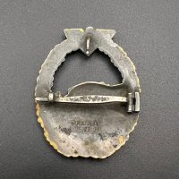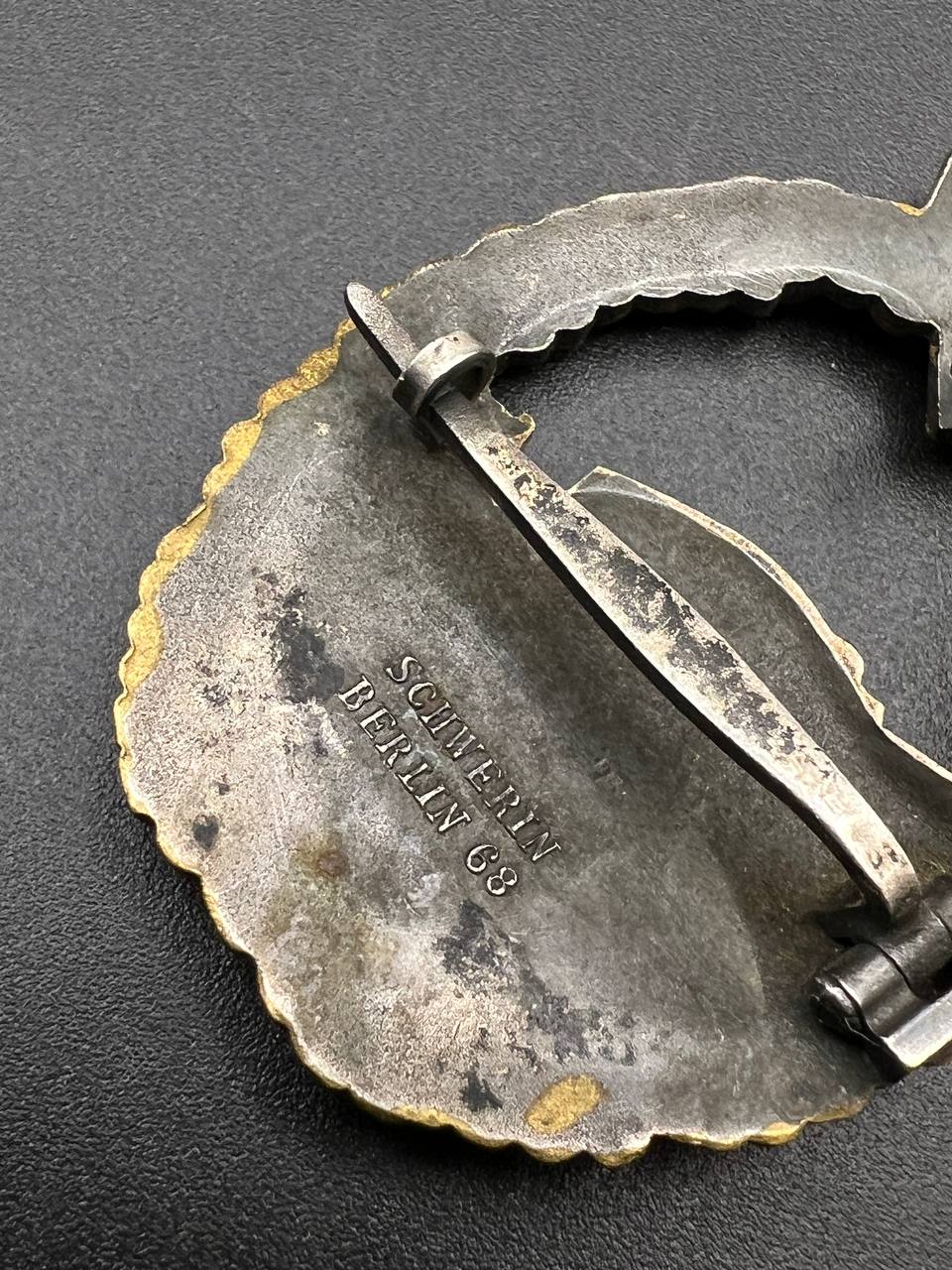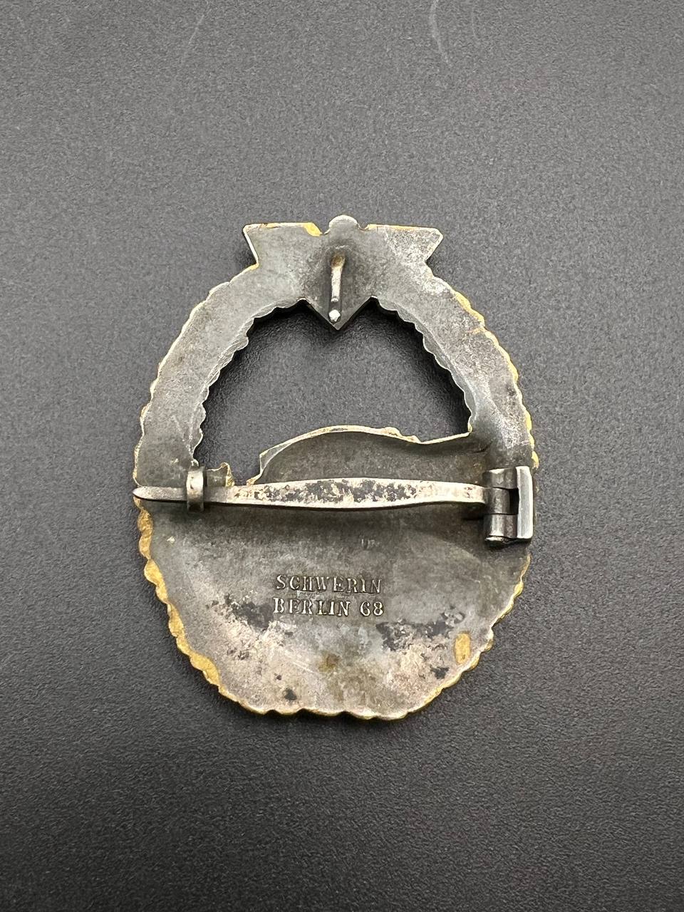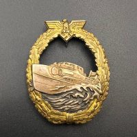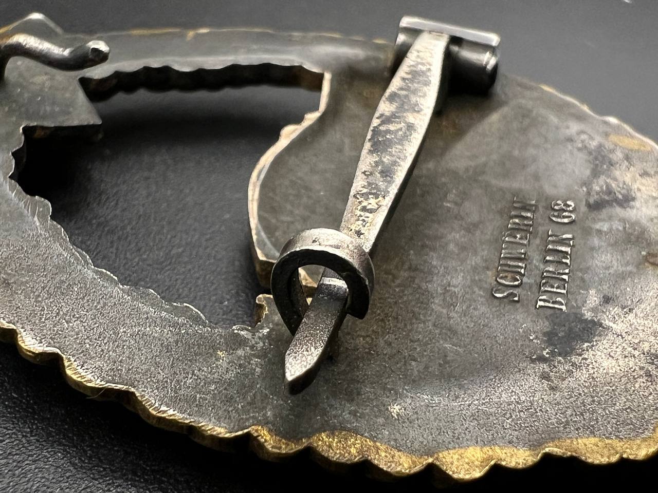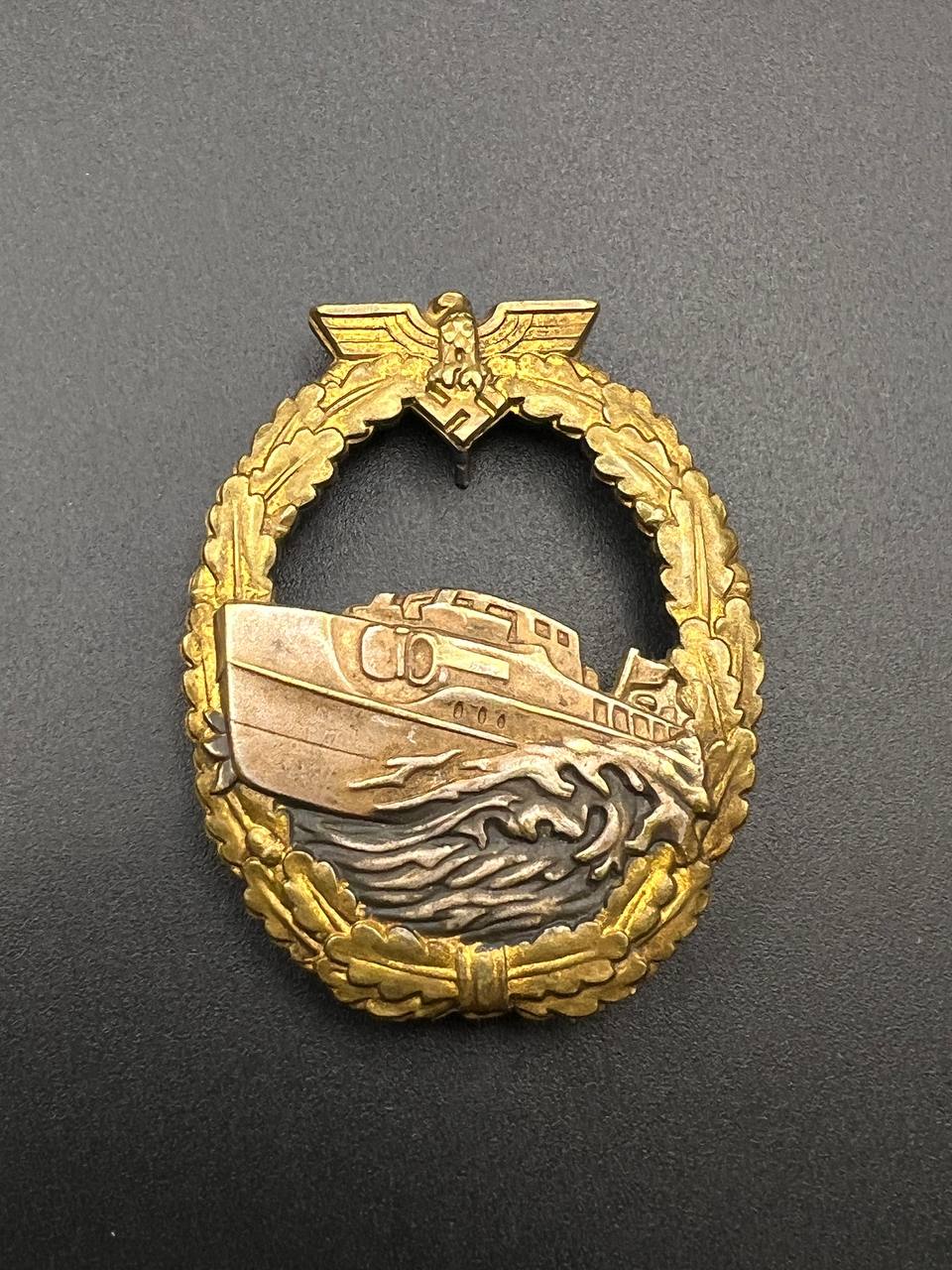 Original Kriegsmarine Torpedo Boat Crew Badge (Schnellboot-Kriegsabzeichen), instituted in 1941. Awarded to officers and enlisted crew members of fast torpedo boats for operational service and combat missions. The badge features an oval laurel wreath topped by the national eagle with swastika and a fast attack craft cutting through waves at the center. Manufactured in tombak with traces of original gilding. The reverse shows a pinback configuration and a clearly struck maker mark “SCHWERIN / BERLIN 68”. Good collectible condition with honest wear and age.