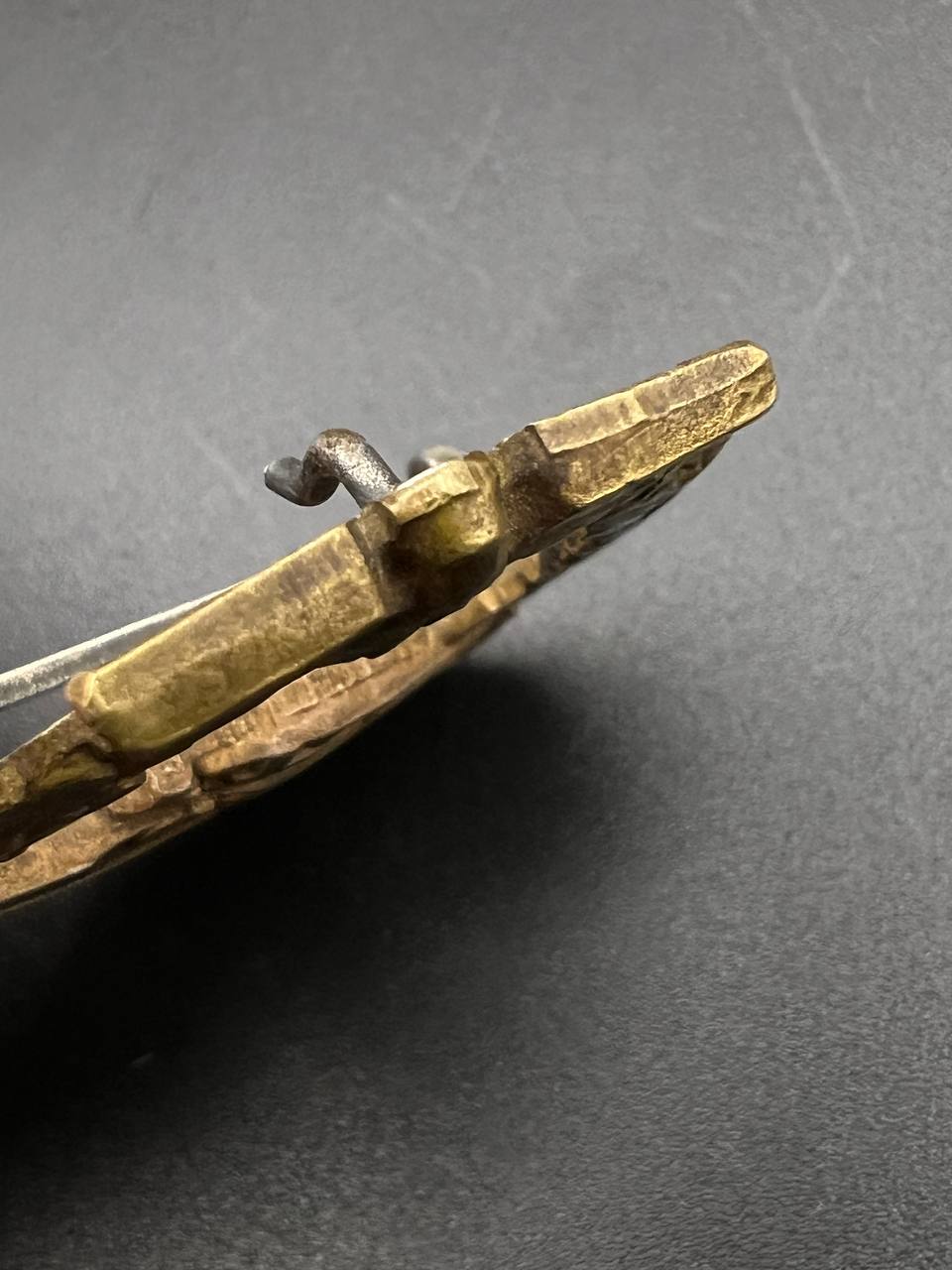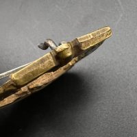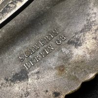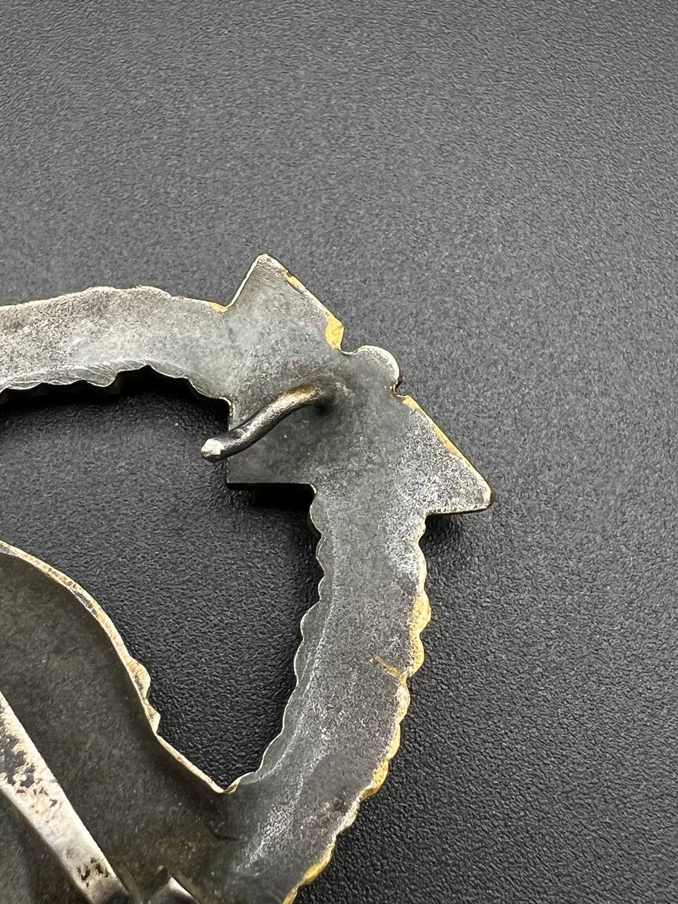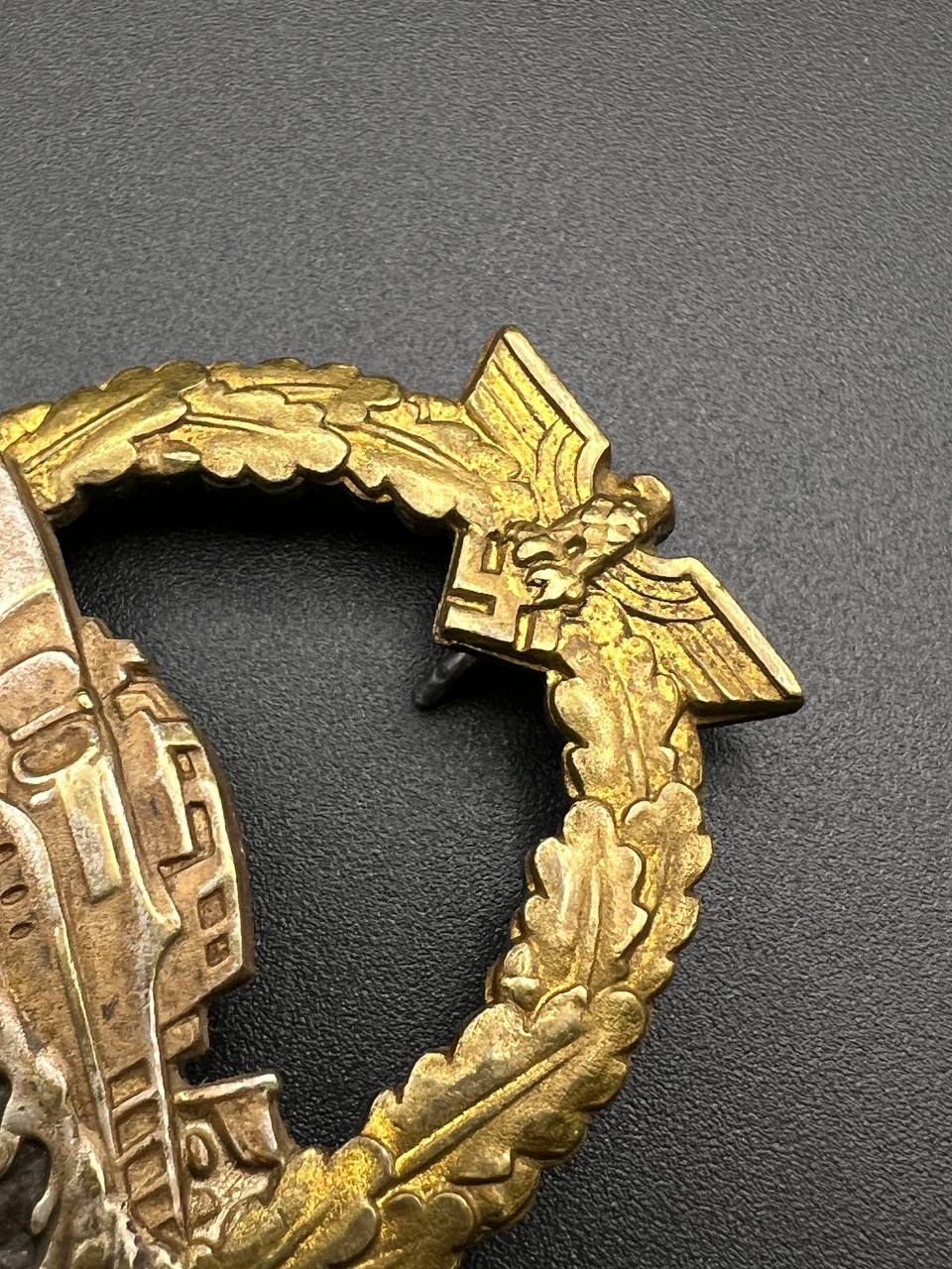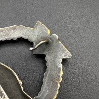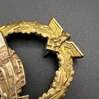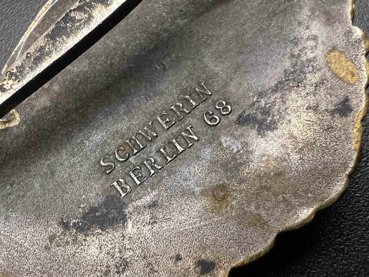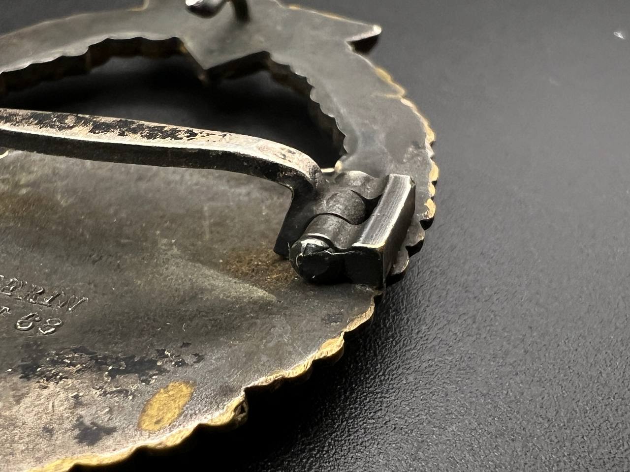 Original Kriegsmarine Torpedo Boat Crew Badge (Schnellboot-Kriegsabzeichen), instituted in 1941. Awarded to officers and enlisted crew members of fast torpedo boats for operational service and combat missions. The badge features an oval laurel wreath topped by the national eagle with swastika and a fast attack craft cutting through waves at the center. Manufactured in tombak with traces of original gilding. The reverse shows a pinback configuration and a clearly struck maker mark “SCHWERIN / BERLIN 68”. Good collectible condition with honest wear and age.