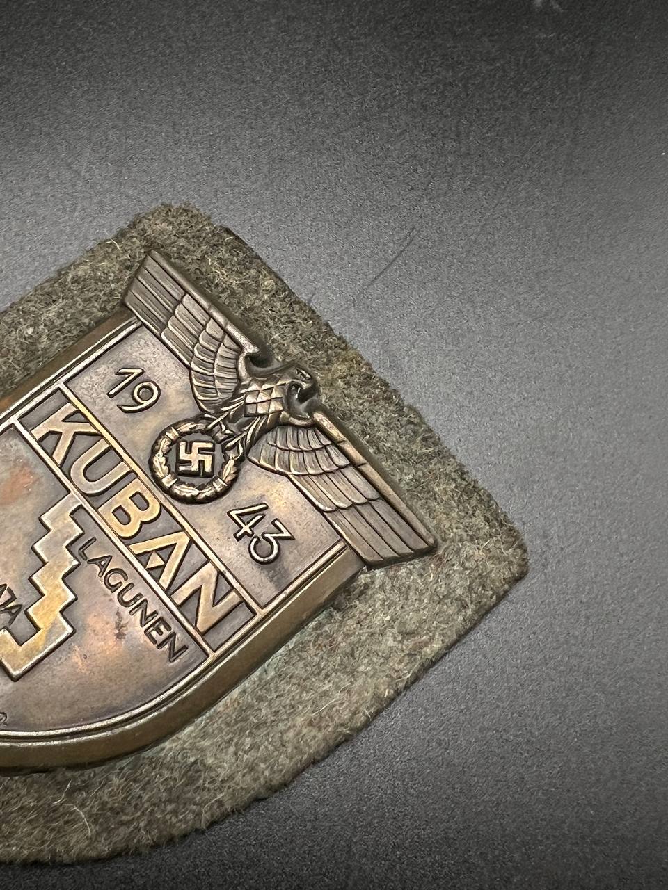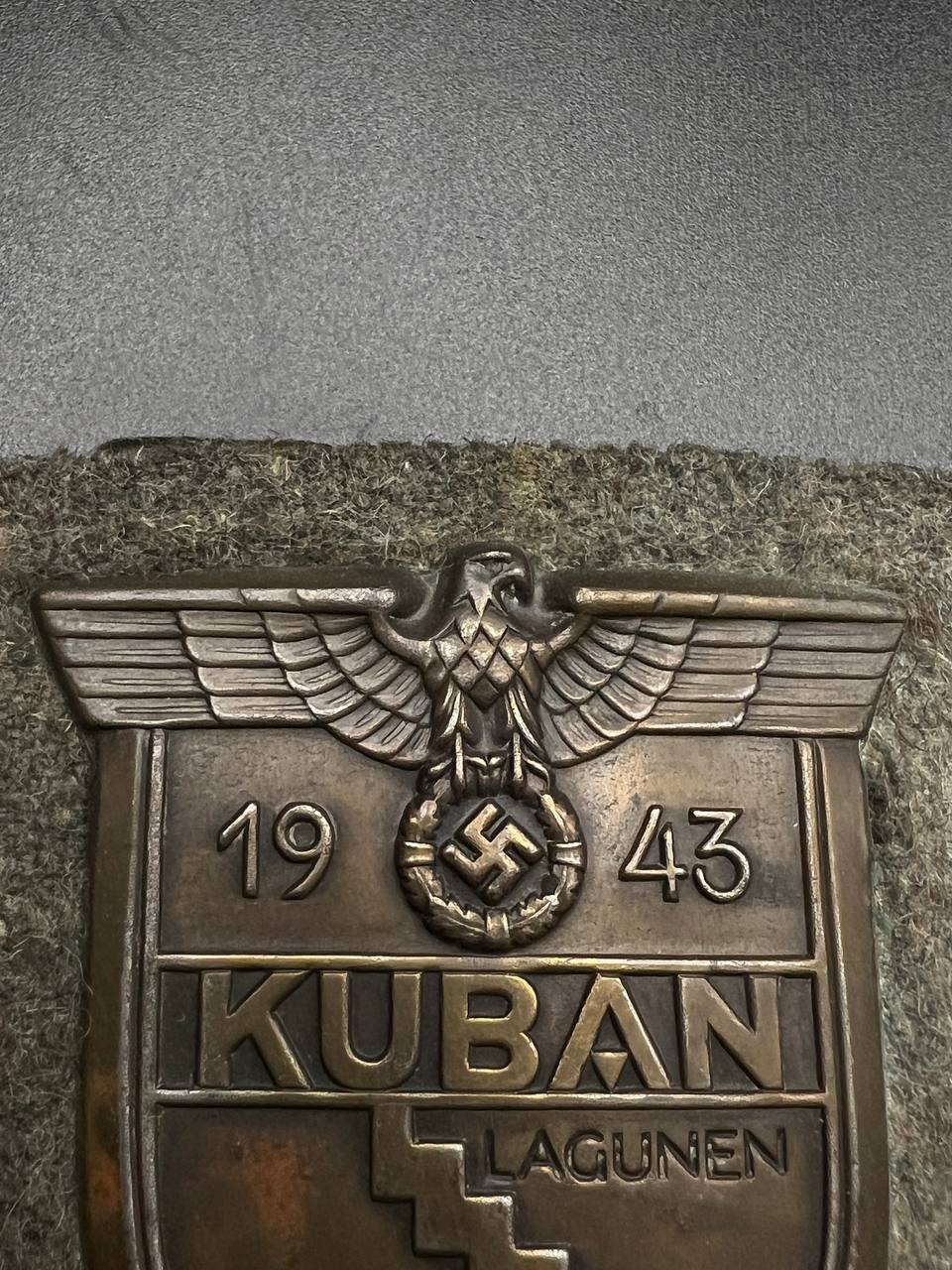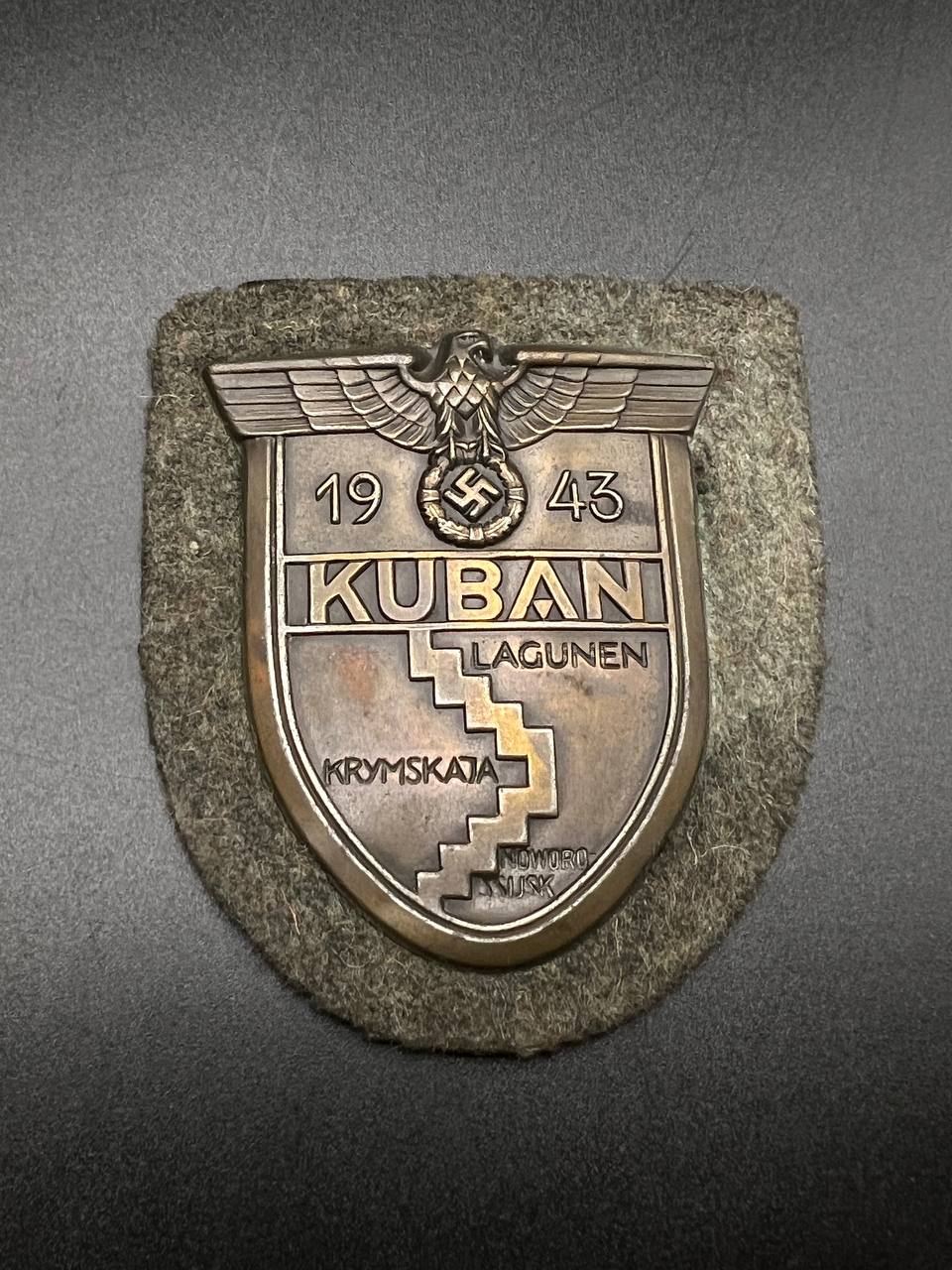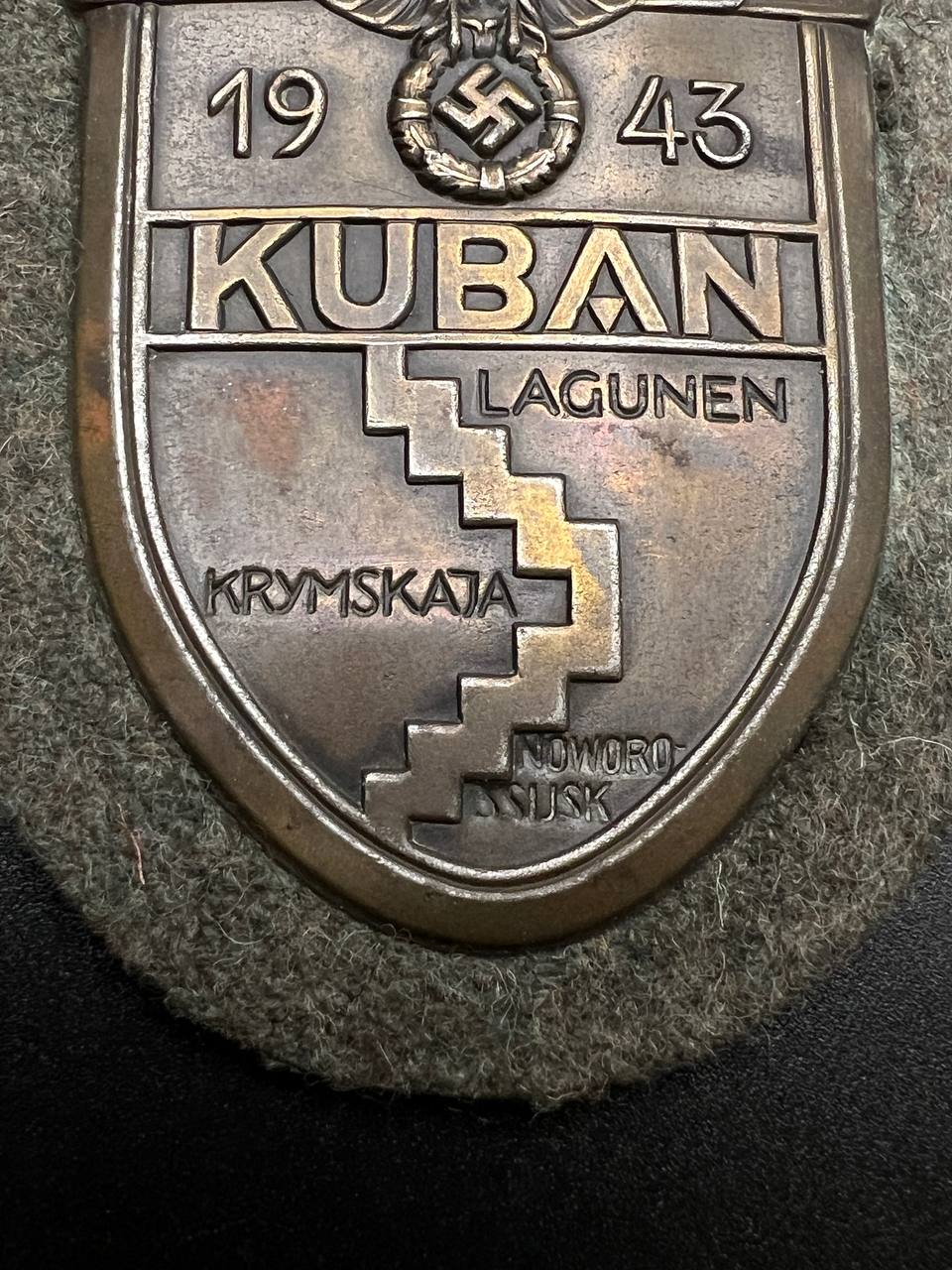 Sharp relief throughout — including the eagle, the “1943” date, “KUBAN”, “LAGUNEN”, and the sector names “KRYMSKAJA” and “NOWOROSSIJSK”. Attractive untouched patina, no restoration. Fully original piece.
