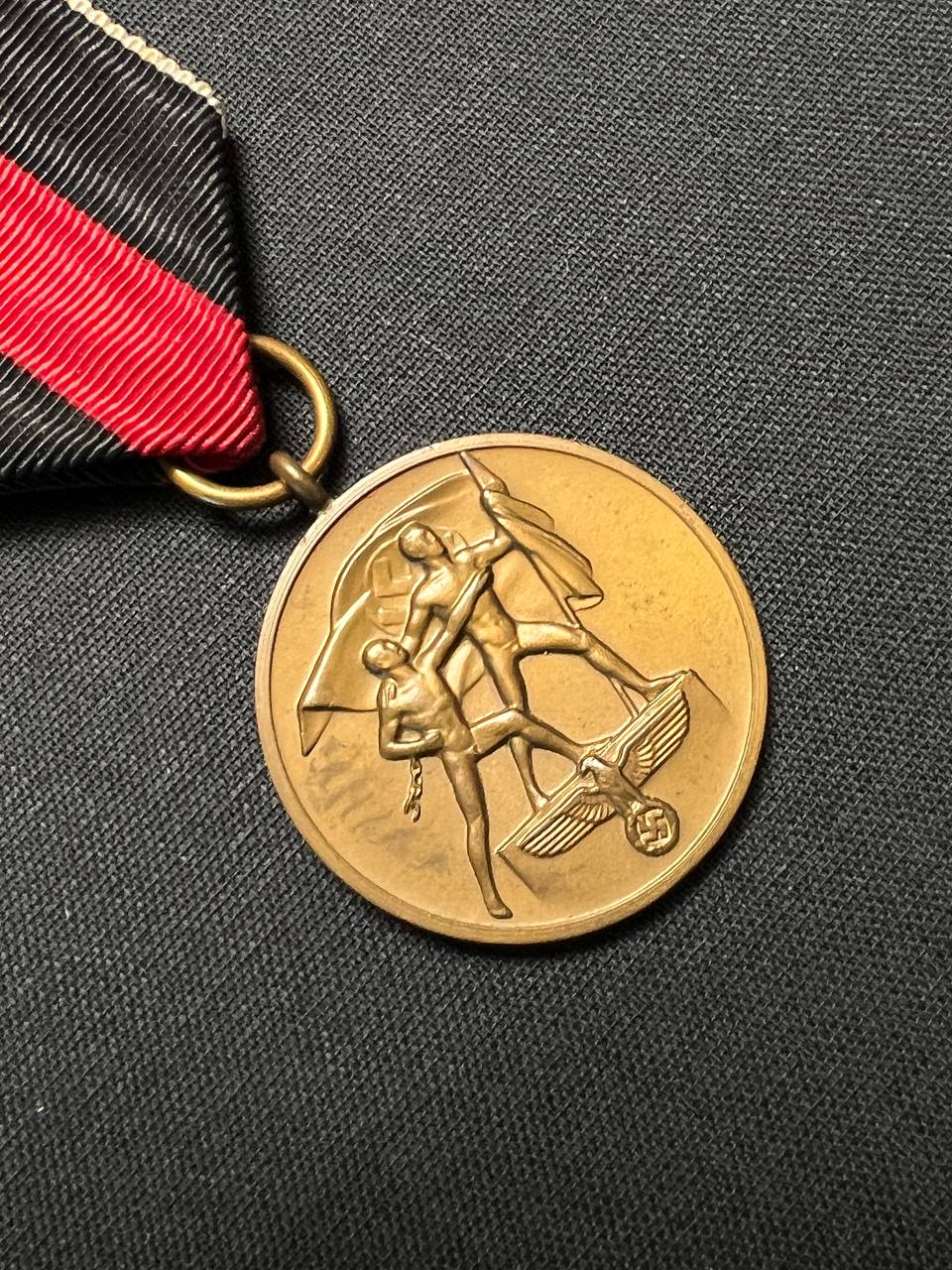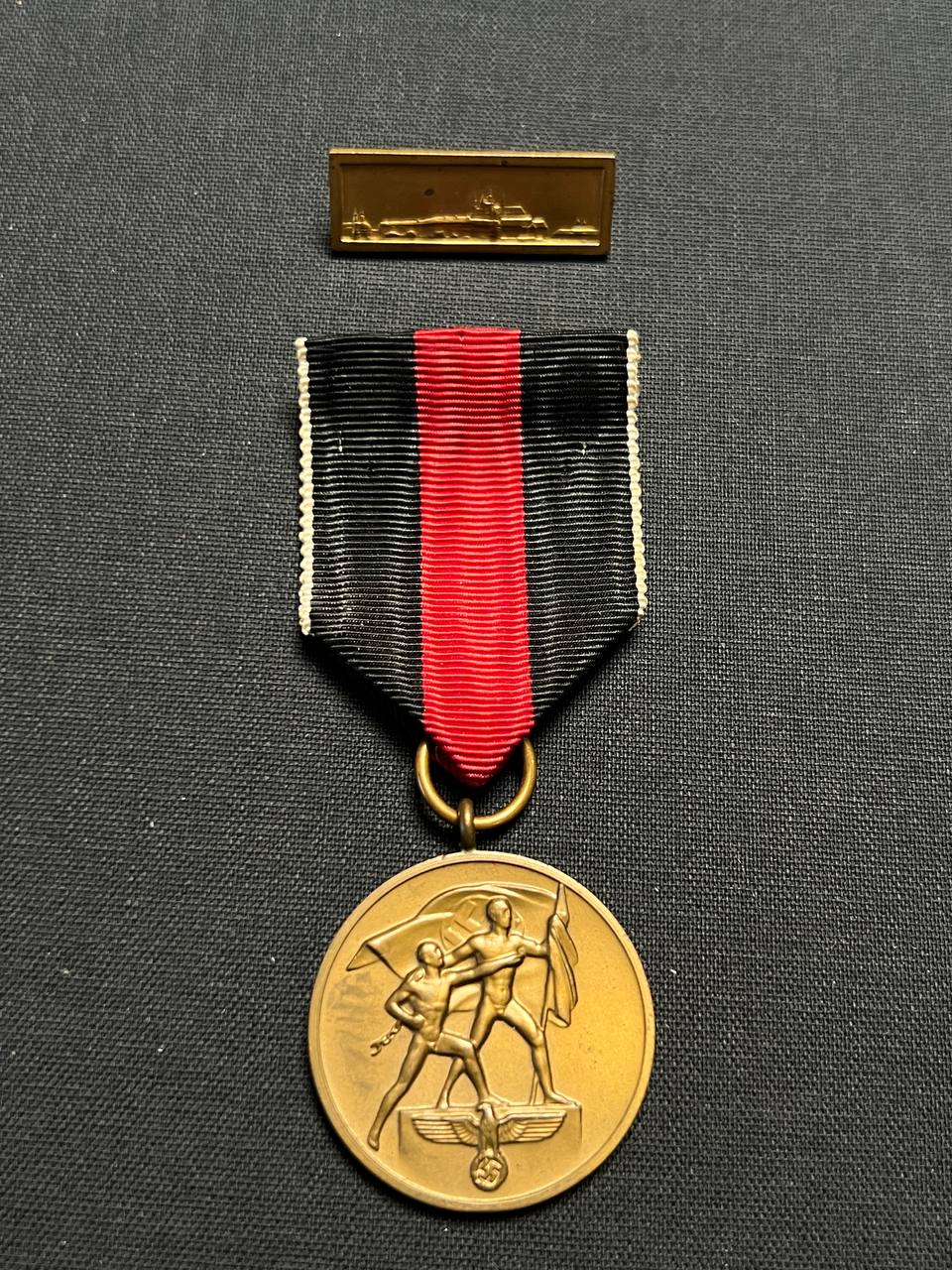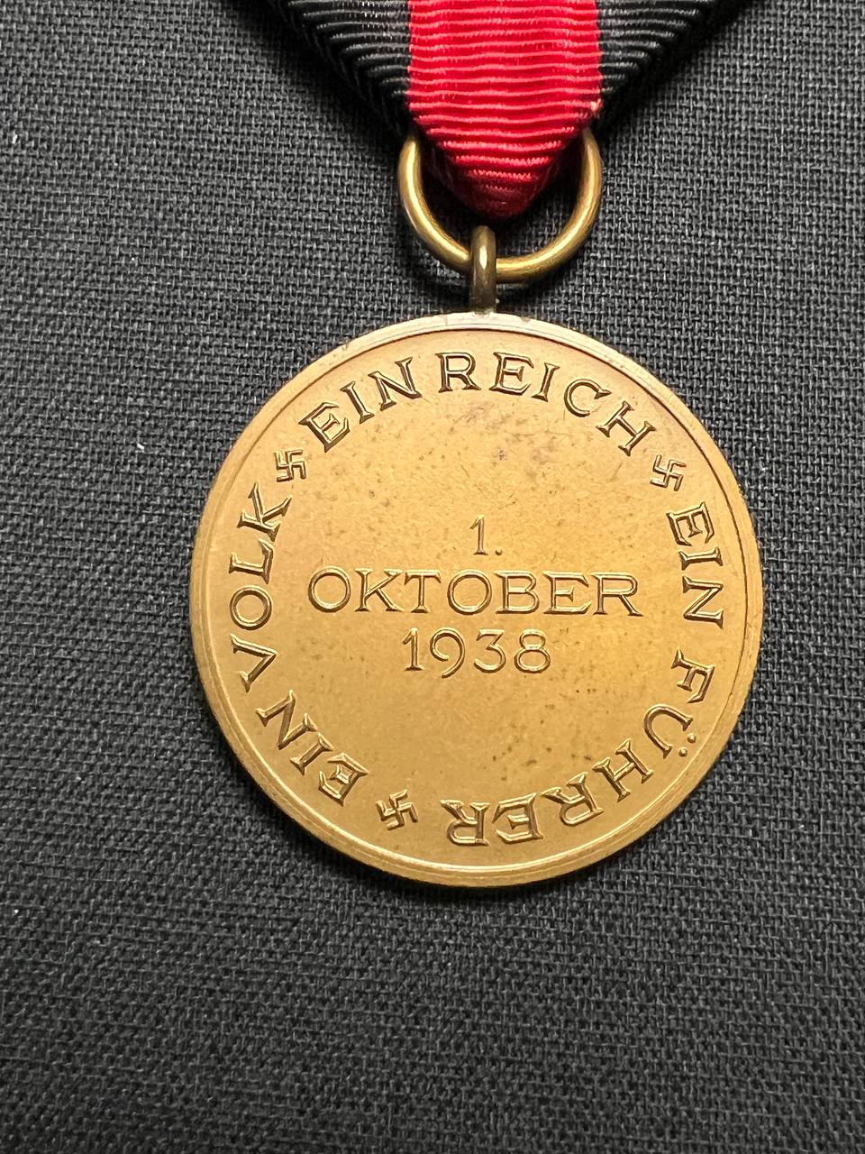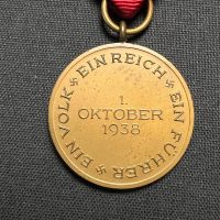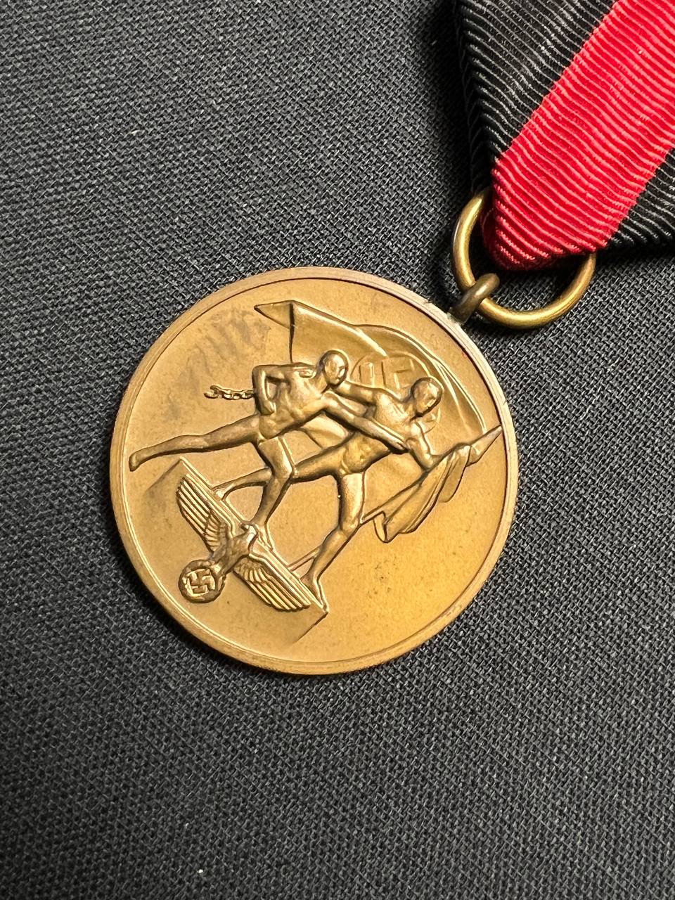 Instituted on October 18, 1938. Awarded to participants in the annexation of the Sudetenland into Germany, including members of the armed forces and civilians who contributed to the operation. The obverse shows two male figures — one helping the other onto a podium bearing the German eagle with a swastika, with a flag in the background. The reverse reads: “EIN VOLK • EIN REICH • EIN FÜHRER • 1. OKTOBER 1938” (“One People, One Empire, One Leader, 1 October 1938”).