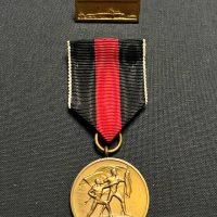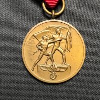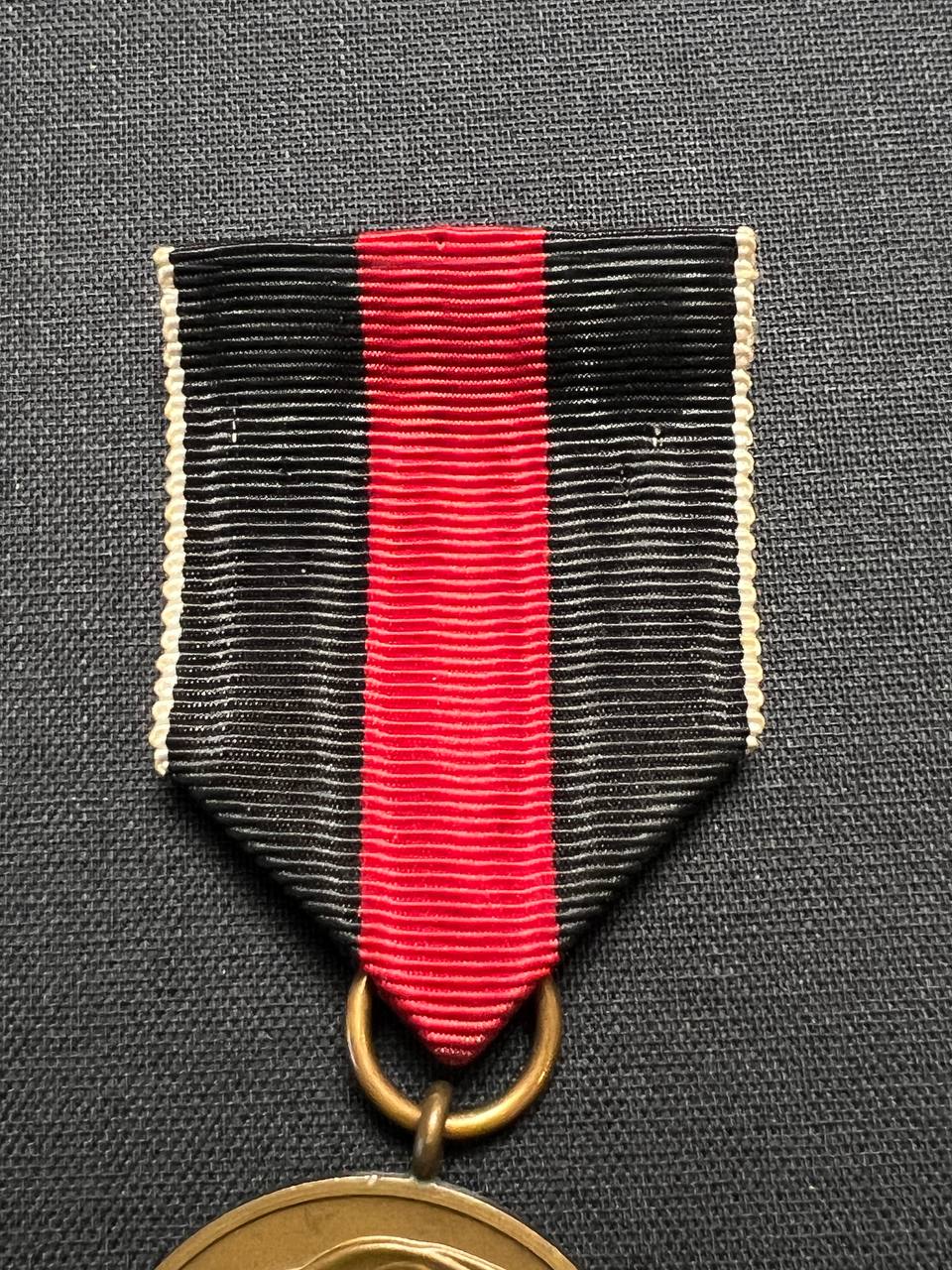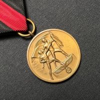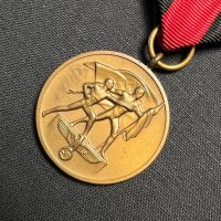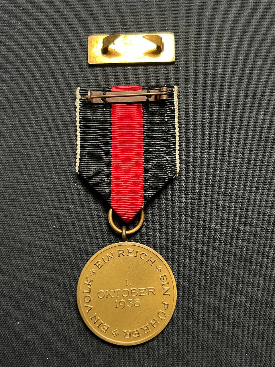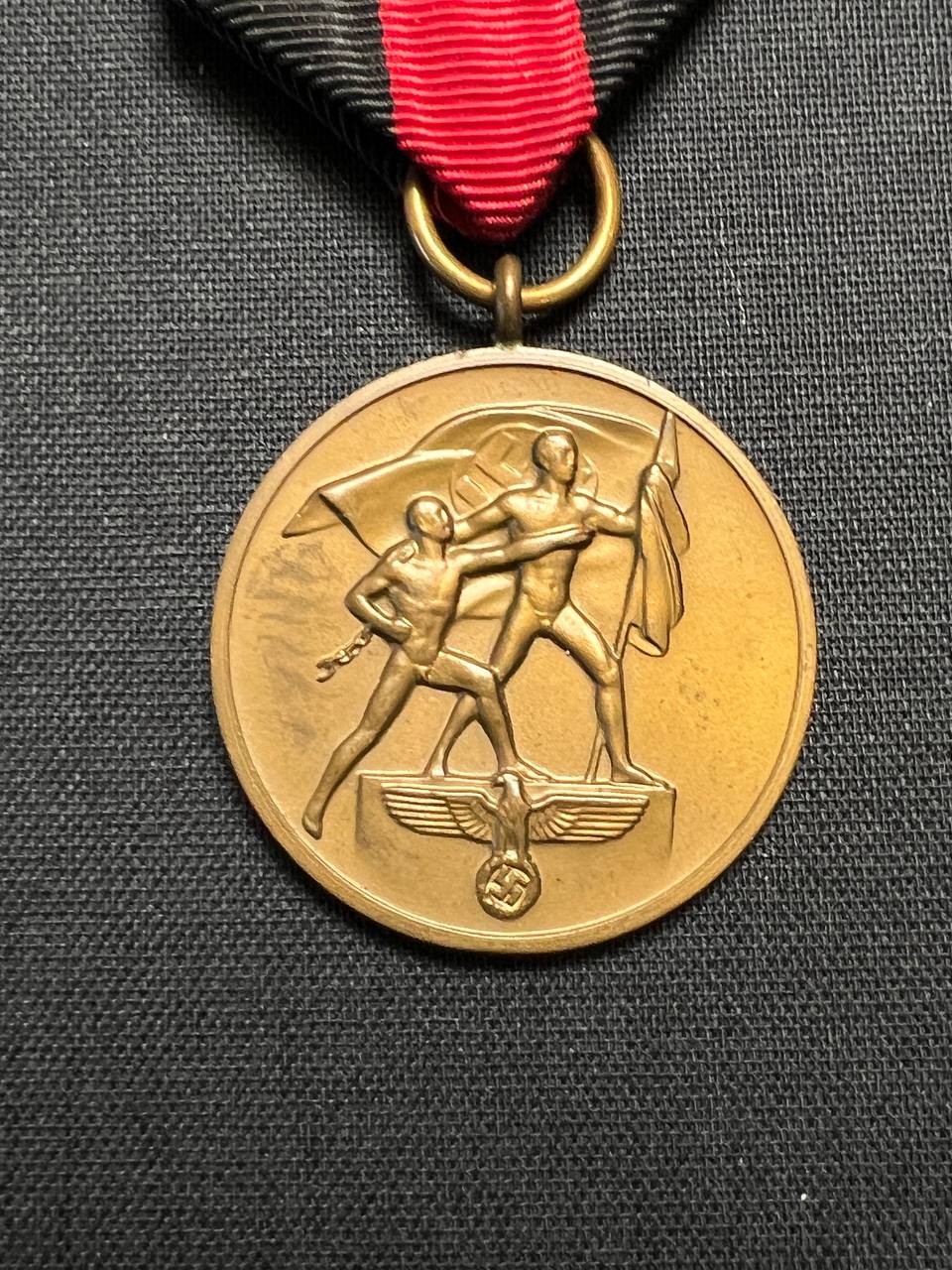 Instituted on October 18, 1938. Awarded to participants in the annexation of the Sudetenland into Germany, including members of the armed forces and civilians who contributed to the operation. The obverse shows two male figures — one helping the other onto a podium bearing the German eagle with a swastika, with a flag in the background. The reverse reads: “EIN VOLK • EIN REICH • EIN FÜHRER • 1. OKTOBER 1938” (“One People, One Empire, One Leader, 1 October 1938”).