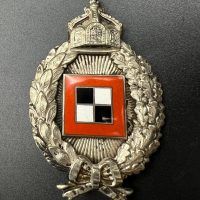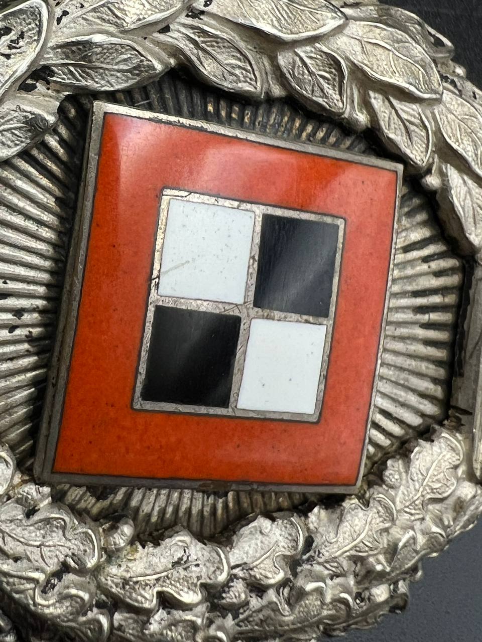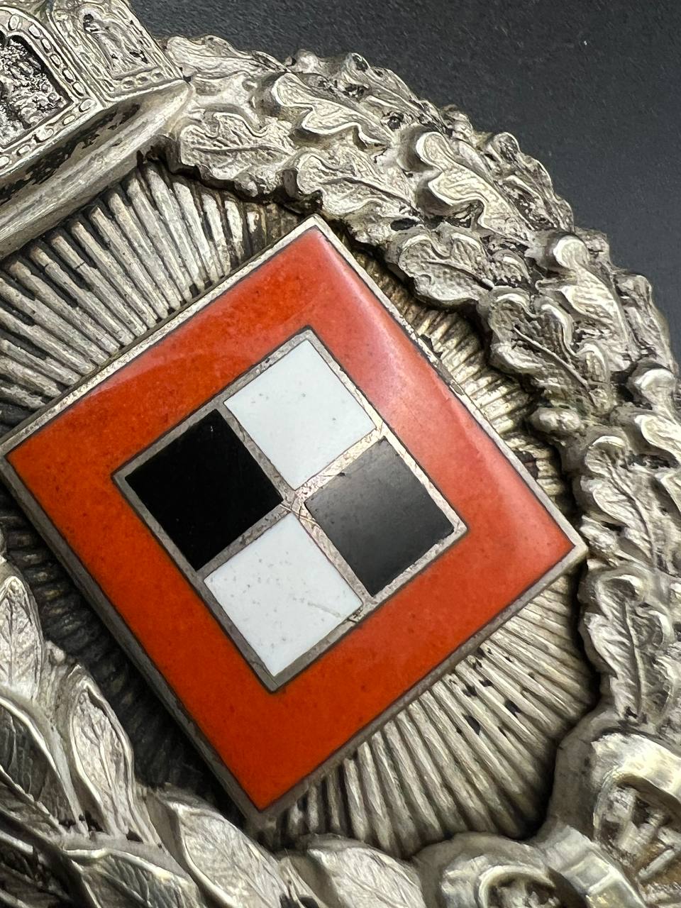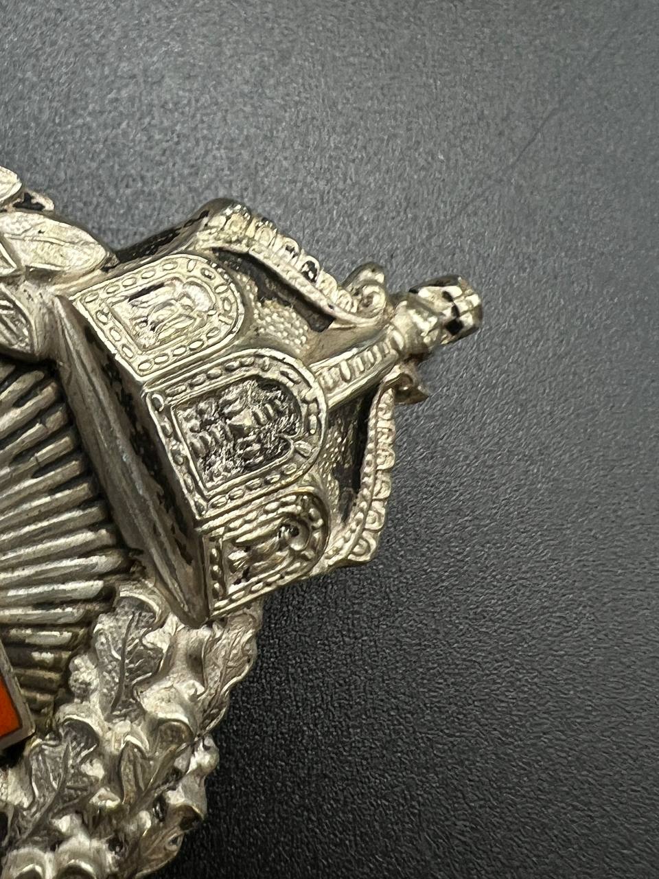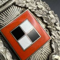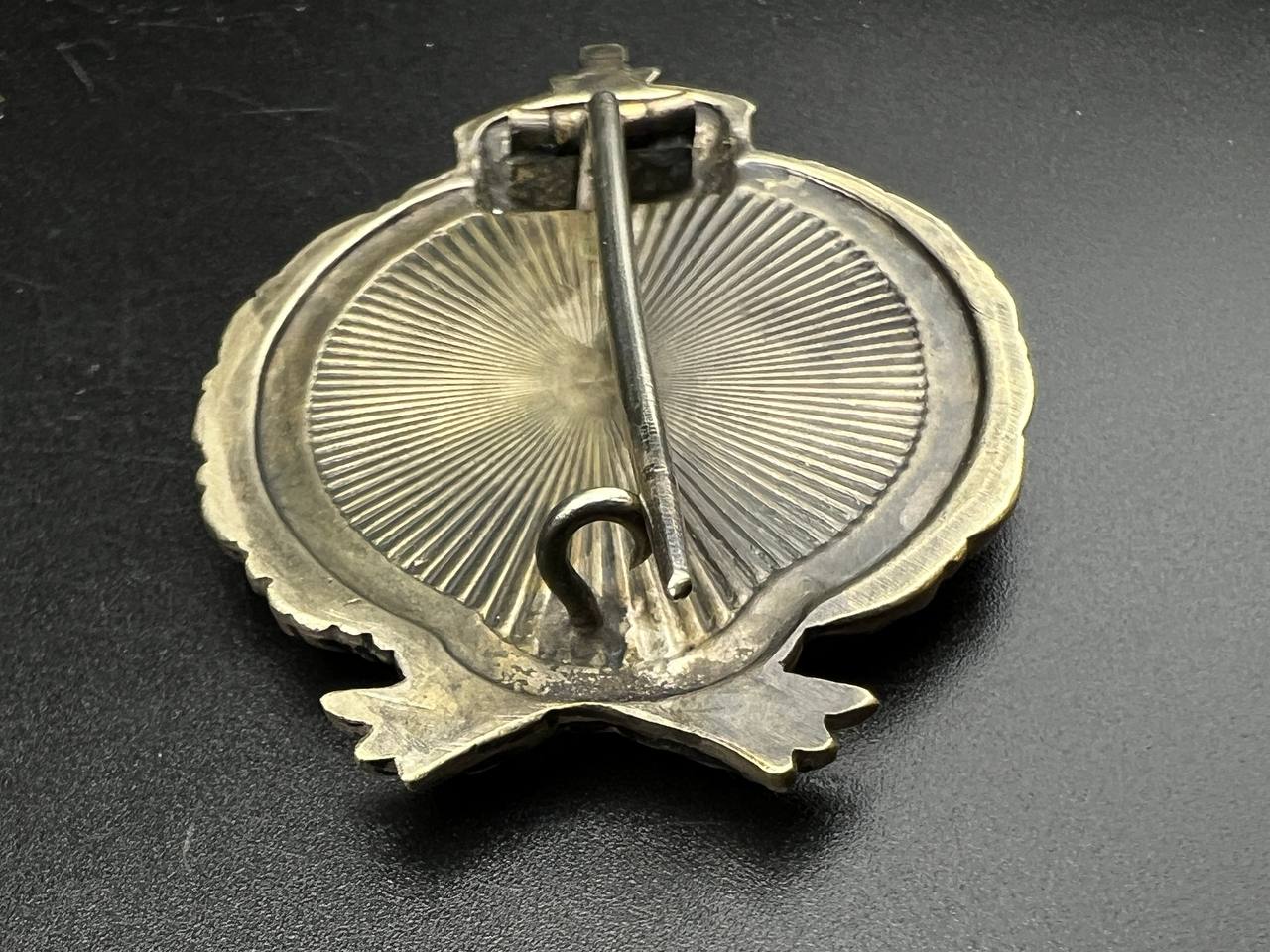 Very fine example manufactured by C.E. Juncker Berlin. Silver-plated base metal, hollow-embossed, reverse with sunburst plate. Without maker mark.
