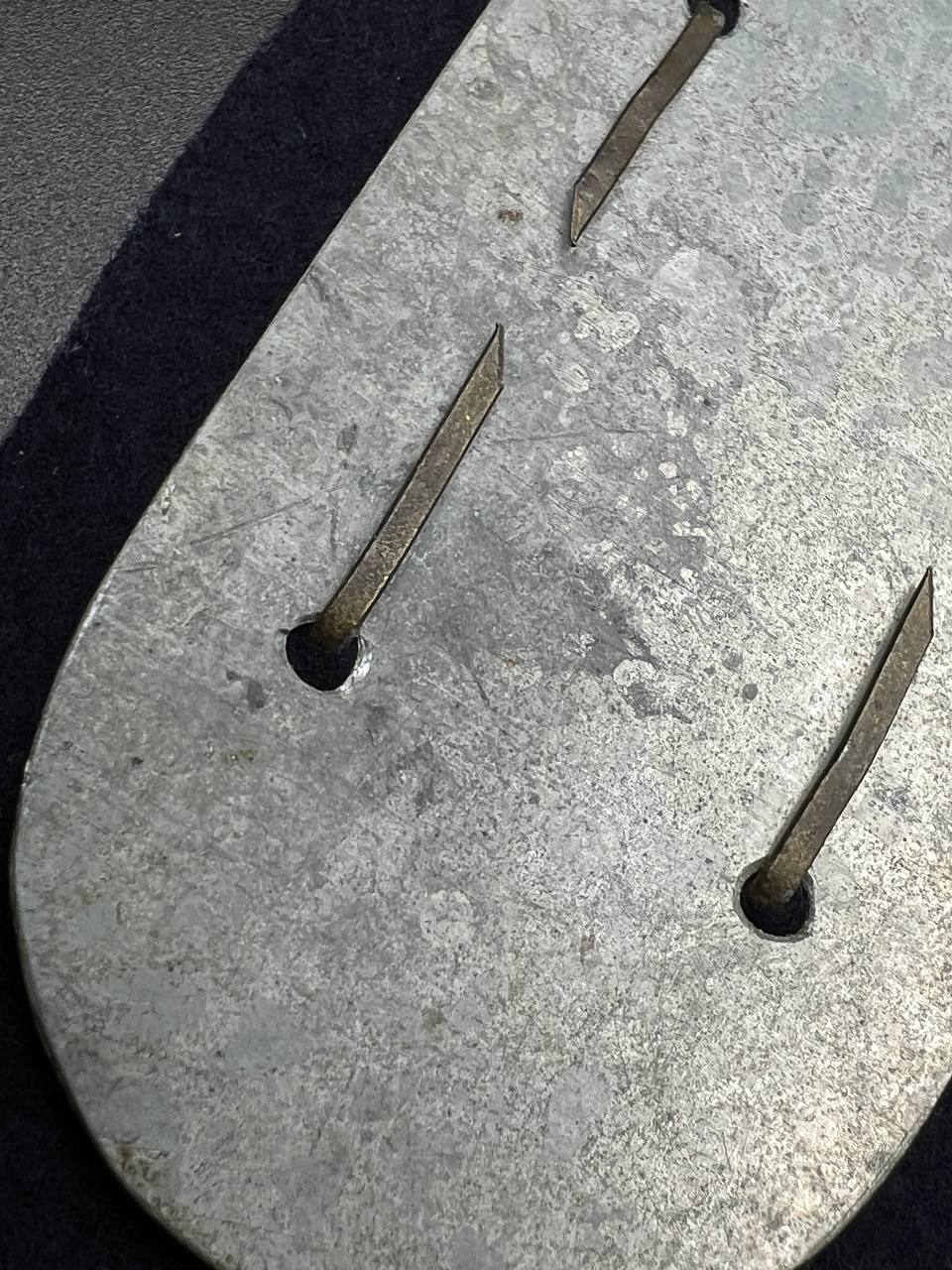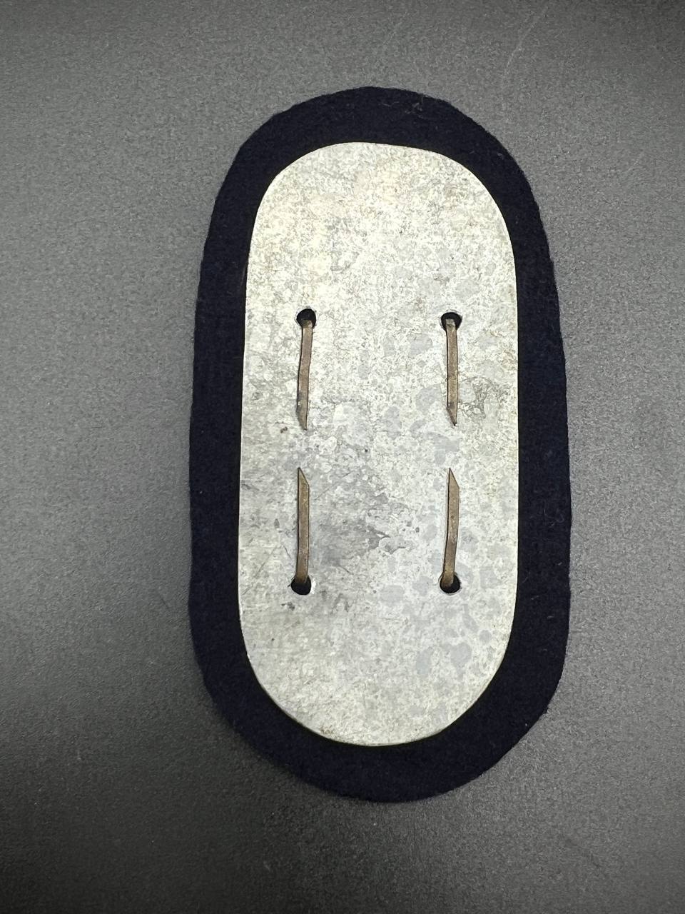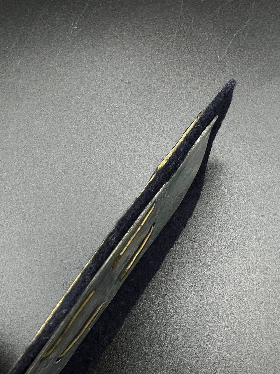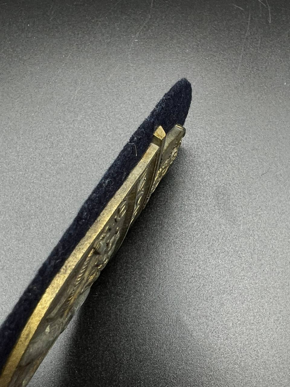 Construction of gilt zinc alloy, mounted on blue uniform cloth, with backing plate.