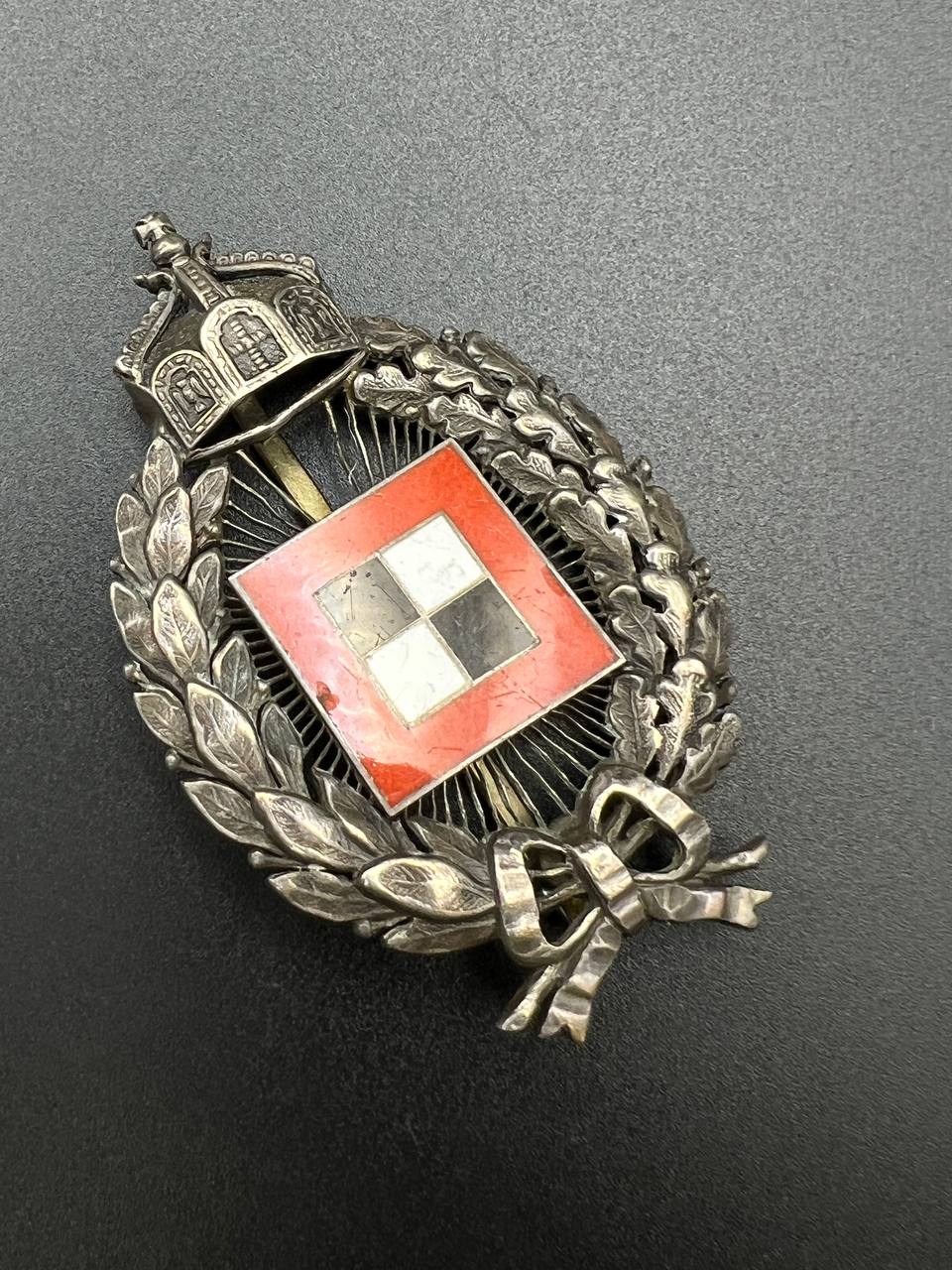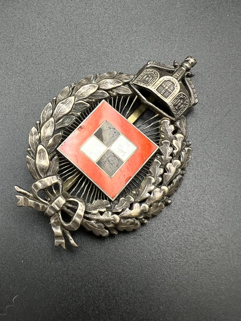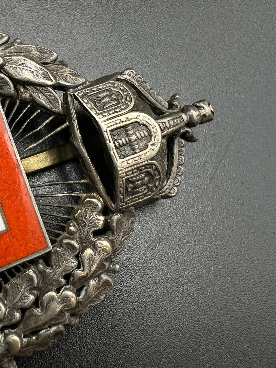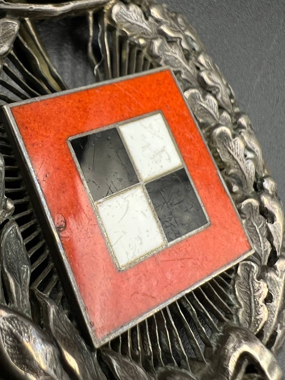 This is an extravagant special manufacture by the firm “C.E. Juncker Berlin”. Silver, hollow embossed, on reverse with ray plate, without maker’s mark. The badge was completely hand-sawed and openwork after completion: the crown, the surrounding laurel/oak leaf wreath with bow, as well as the ray plate behind the enameled field! Worn piece, on reverse with wide pin. In good condition, with very attractive patina.