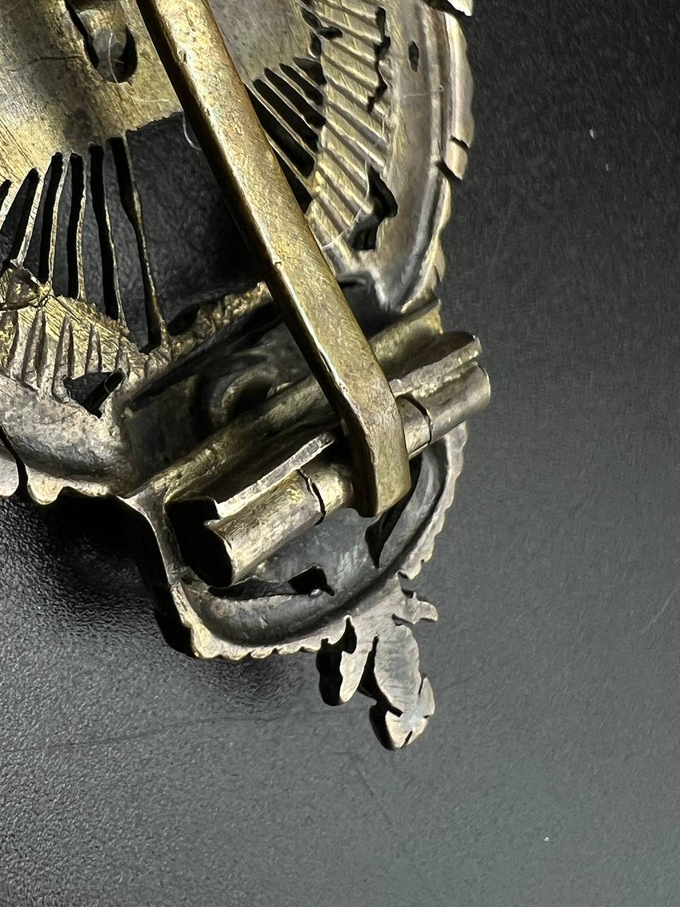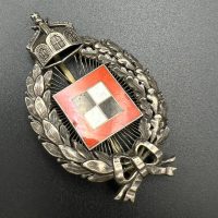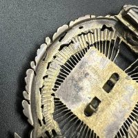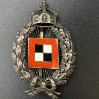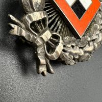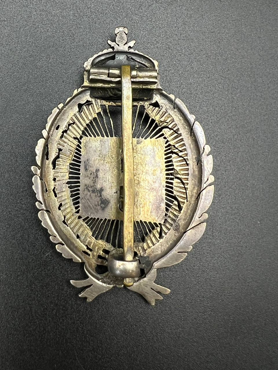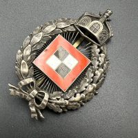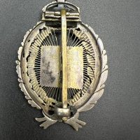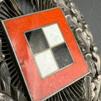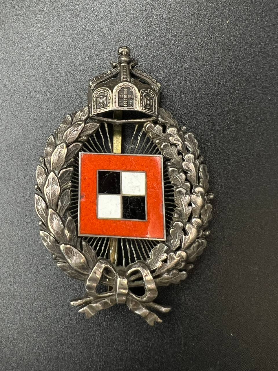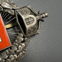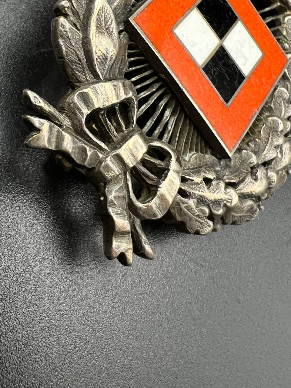 This is an extravagant special manufacture by the firm “C.E. Juncker Berlin”. Silver, hollow embossed, on reverse with ray plate, without maker’s mark. The badge was completely hand-sawed and openwork after completion: the crown, the surrounding laurel/oak leaf wreath with bow, as well as the ray plate behind the enameled field! Worn piece, on reverse with wide pin. In good condition, with very attractive patina.