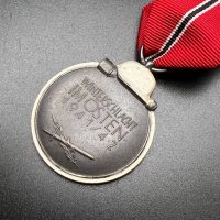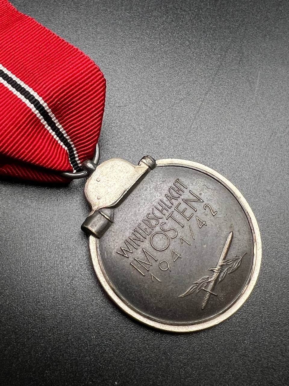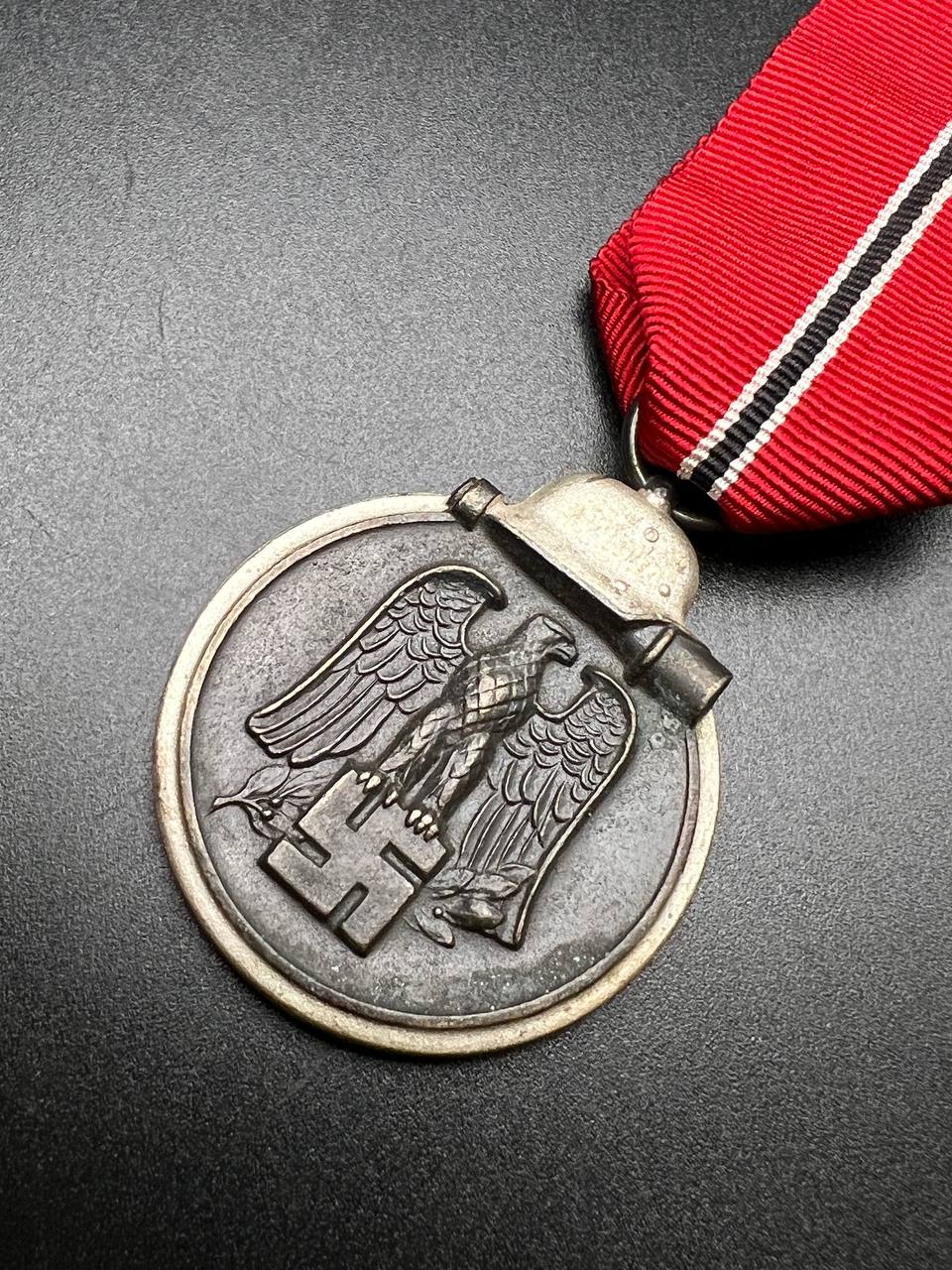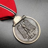 Original Eastern Front Medal “Ostmedaille” 1941/42, early suspension ring stamped with clear maker’s code “88”. Medal shows attractive patina and comes with its correct period red-white ribbon. Reverse features the inscription WINTERSCHLACHT IM OSTEN 1941/42 with crossed sword and branch. Sharp details on the eagle and helmet, with light, honest wear.