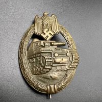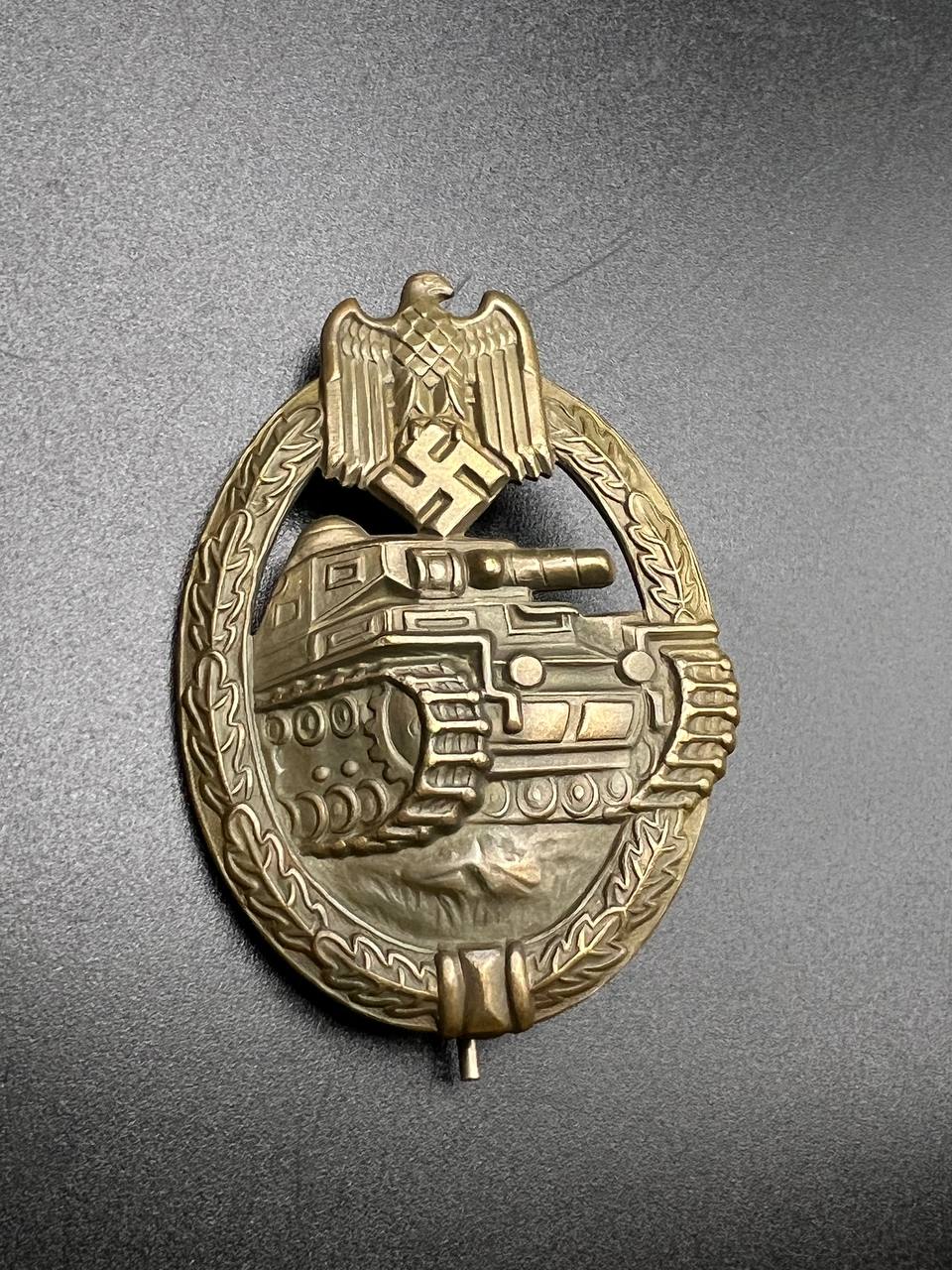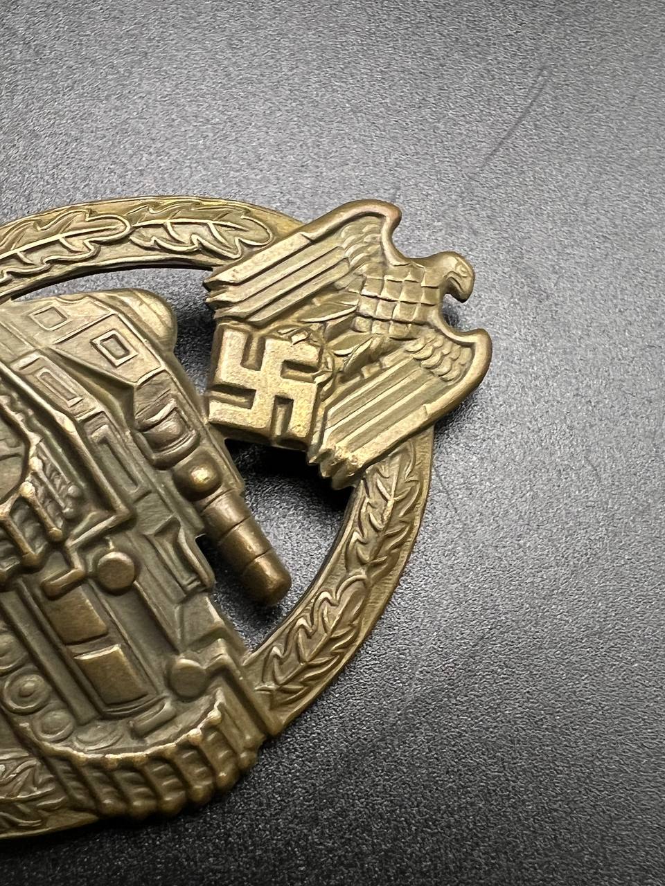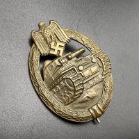 An unmarked bronze Panzer Assault Badge, typical of private-maker production from the early wartime period. The badge features a sharply detailed depiction of a Panzer IV with well-defined tracks, road wheels, and turret, framed by a deep-relief laurel wreath. The bronze finish remains evenly preserved with a natural patina and no signs of cleaning.