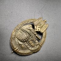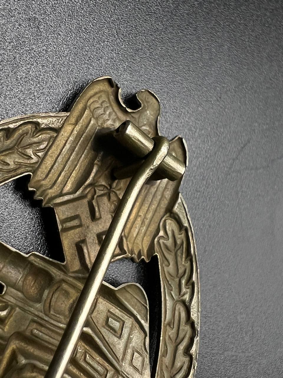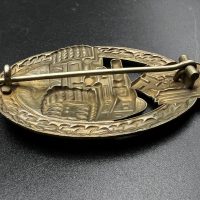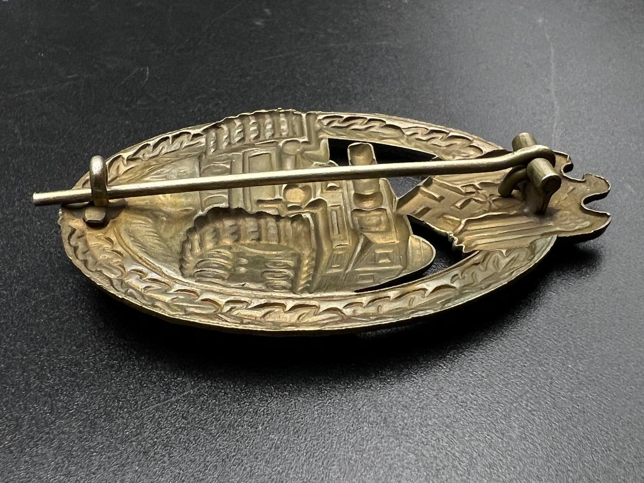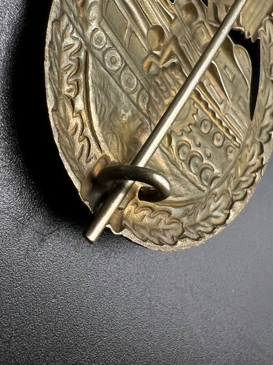 The reverse shows the characteristic early hardware setup: tubular hinge, long curved pin, and a solid block catch—fully consistent with authentic early-to-mid war construction. Made of a heavy alloy with crisp detailing, free of repairs or damage. A strong collectible example of an bronze assault badge.