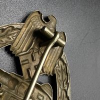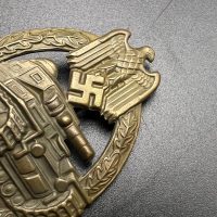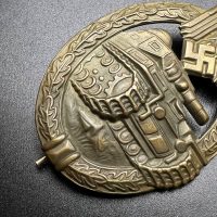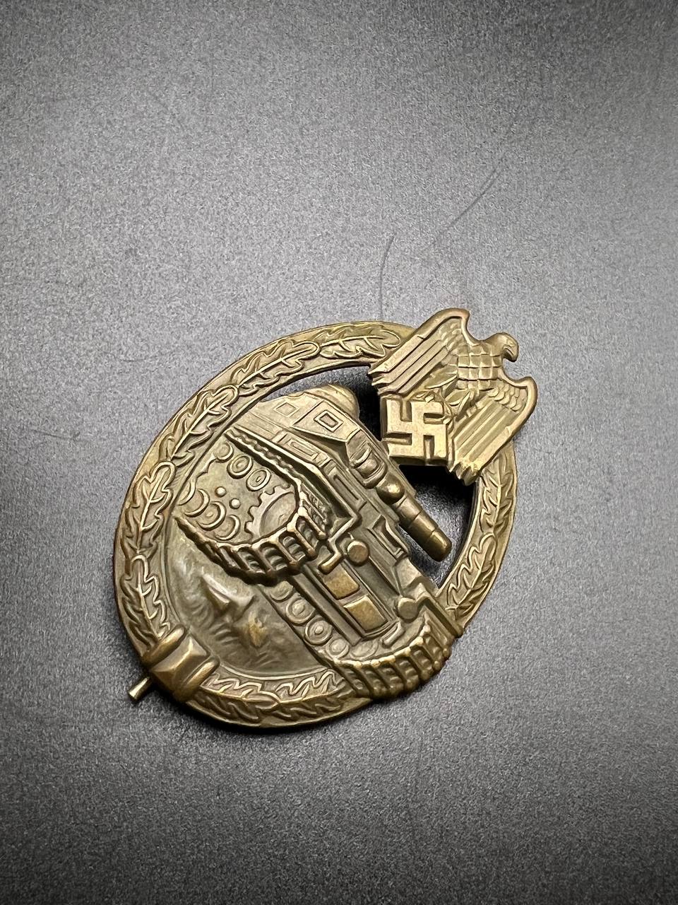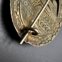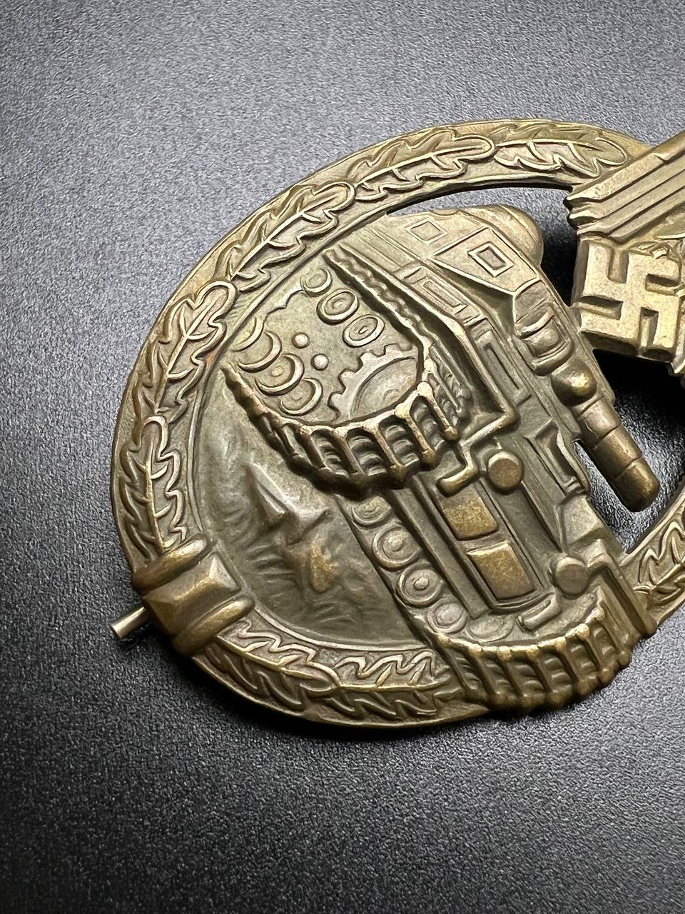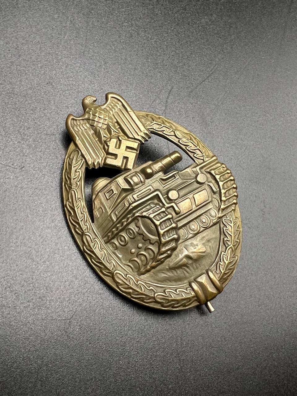 The reverse shows the characteristic early hardware setup: tubular hinge, long curved pin, and a solid block catch—fully consistent with authentic early-to-mid war construction. Made of a heavy alloy with crisp detailing, free of repairs or damage. A strong collectible example of an bronze assault badge.
