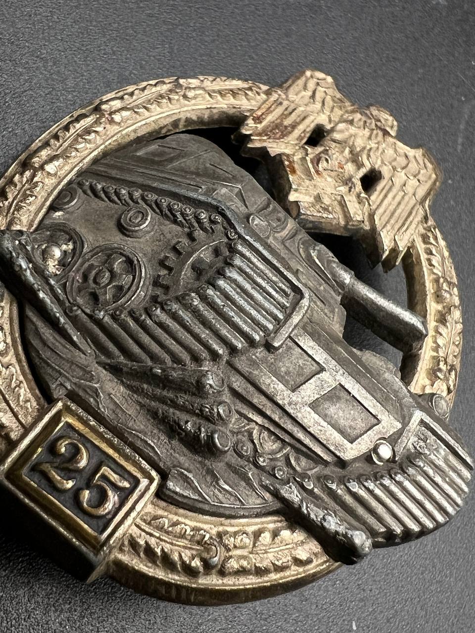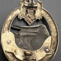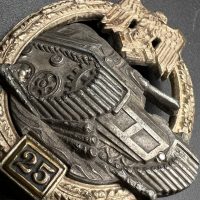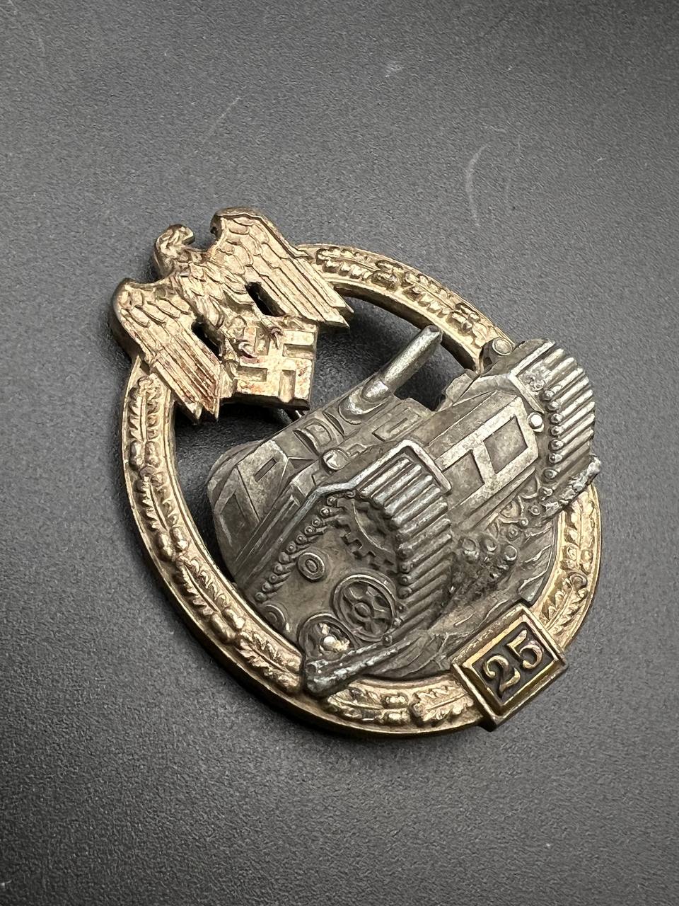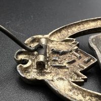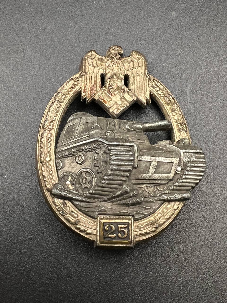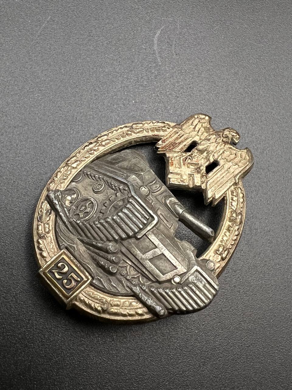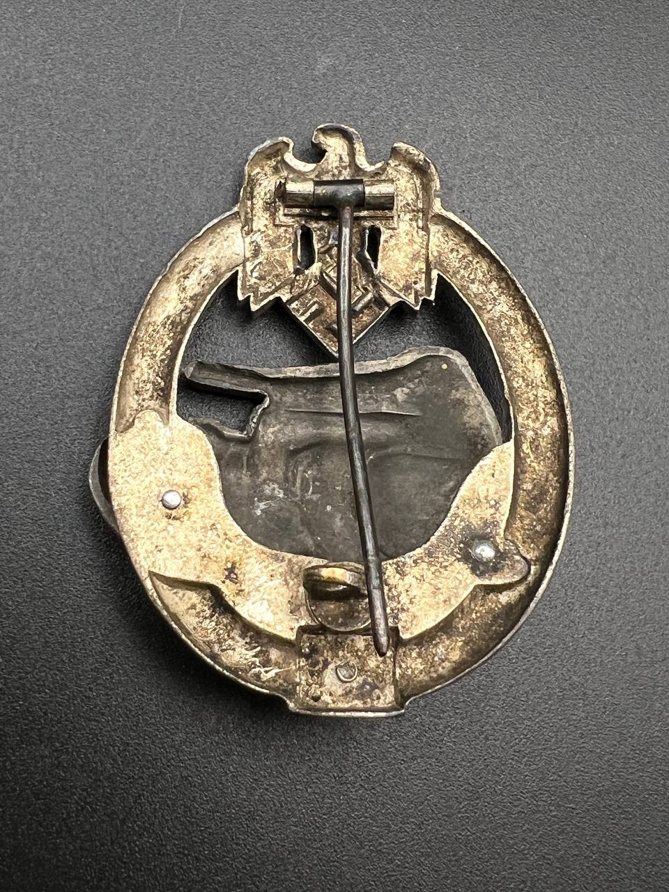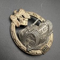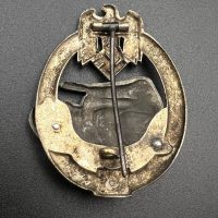 Fine zinc, semi-hollow construction; the tank finished in a lighter tone; the tank section riveted to the wreath with two aluminum rivets. The silvering on the wreath remains over 80% intact. Reverse fitted with a round magnetic pin, with the magnetic pin plate soldered in place.