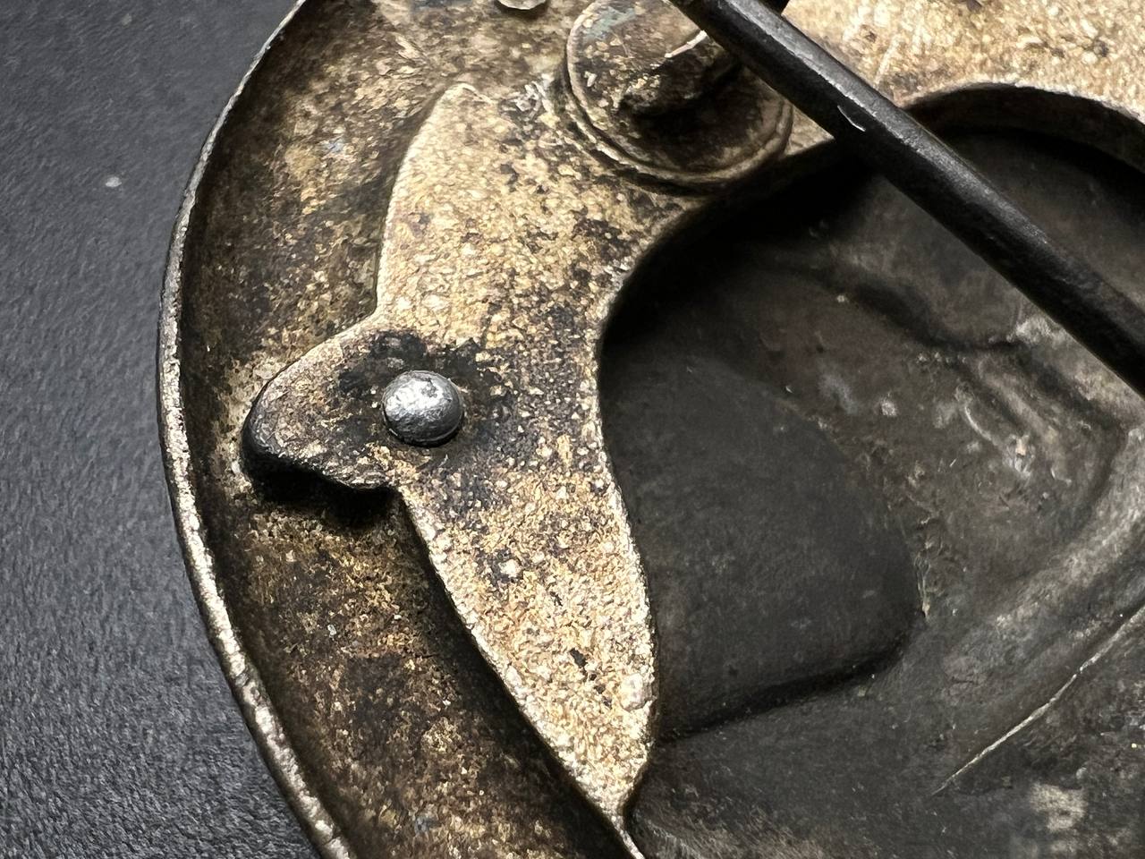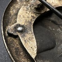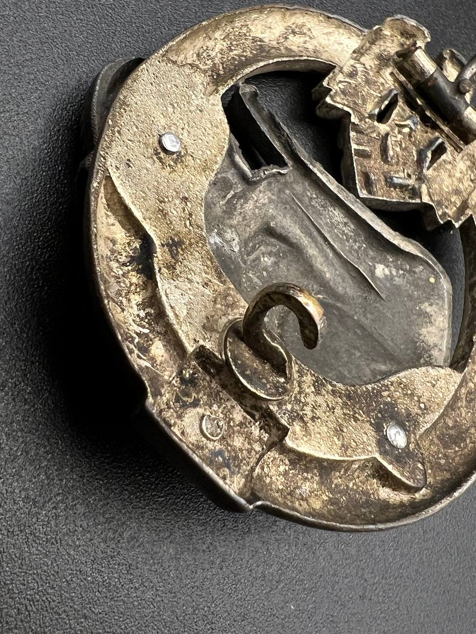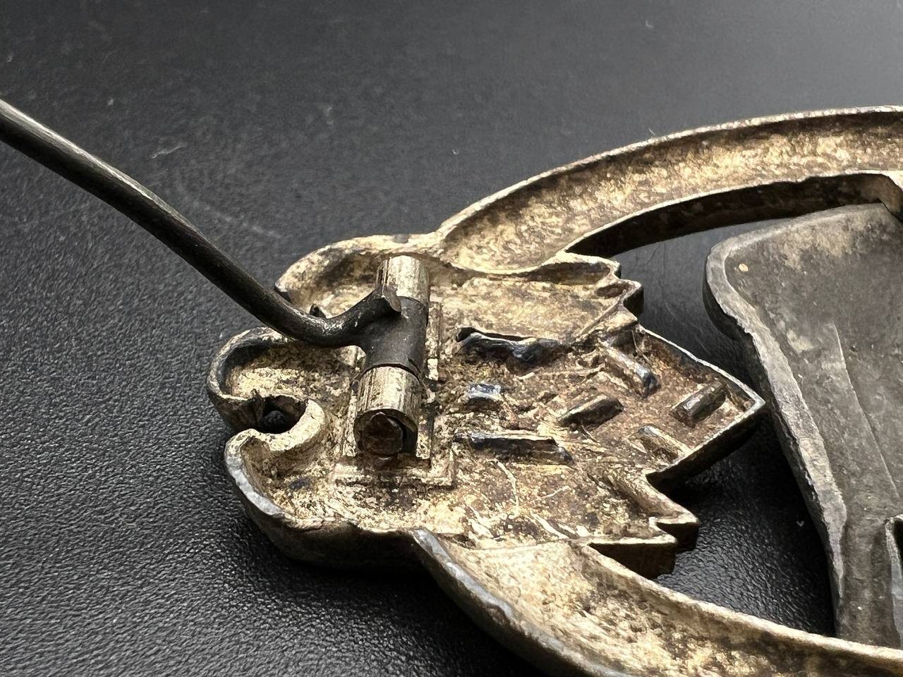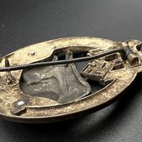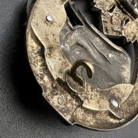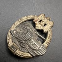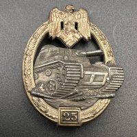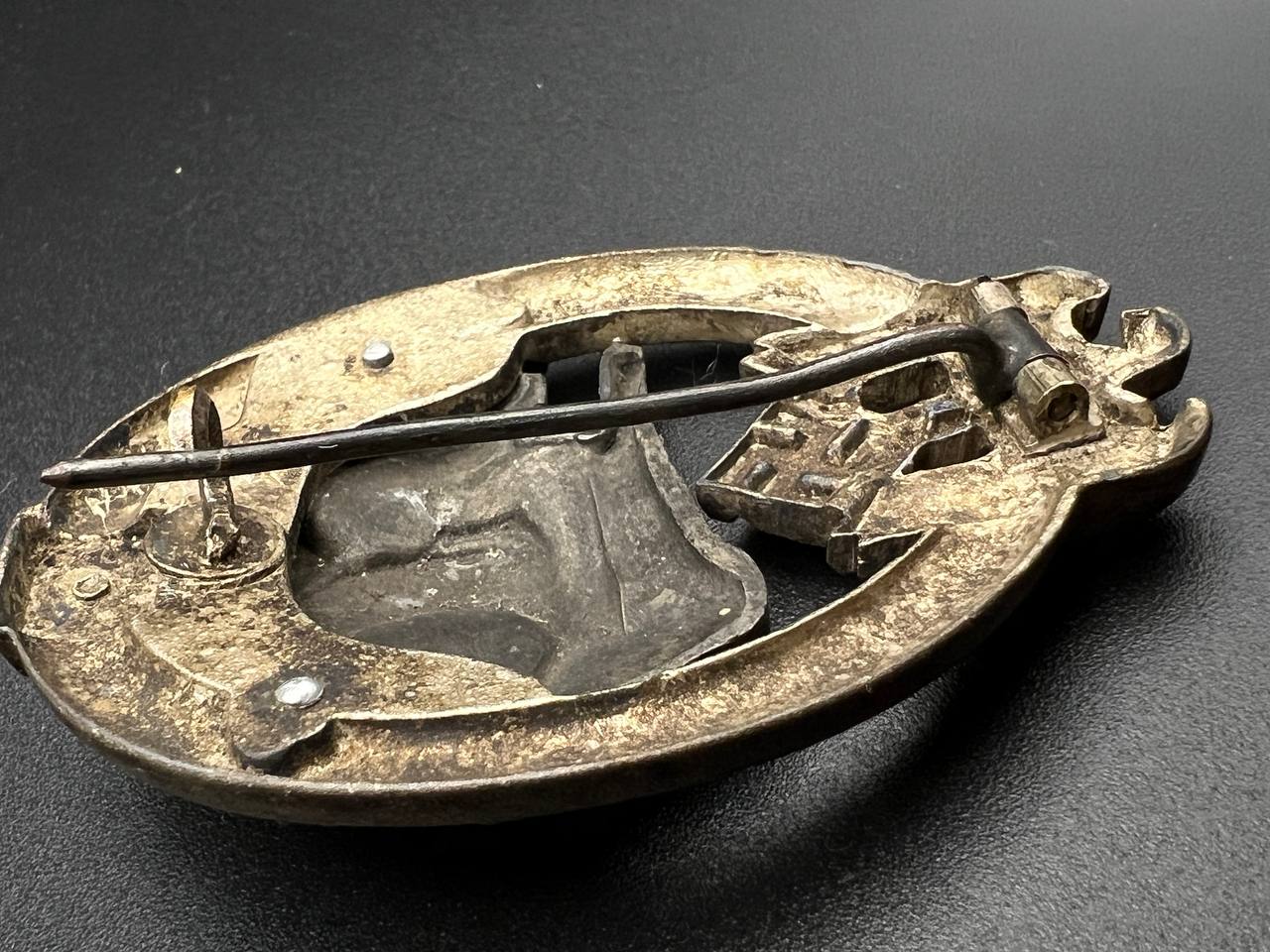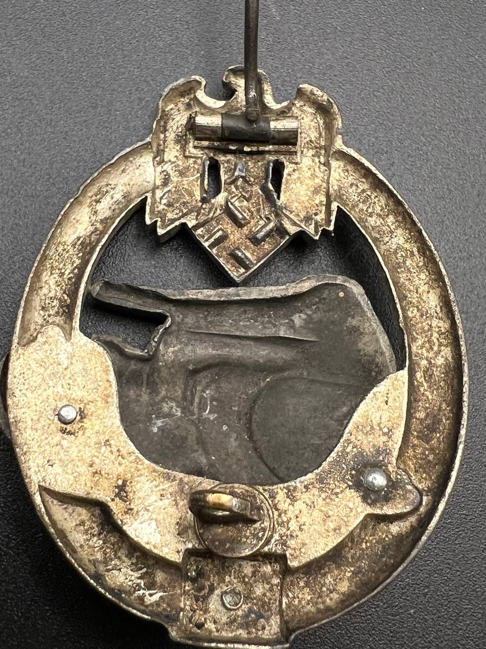 Fine zinc, semi-hollow construction; the tank finished in a lighter tone; the tank section riveted to the wreath with two aluminum rivets. The silvering on the wreath remains over 80% intact. Reverse fitted with a round magnetic pin, with the magnetic pin plate soldered in place.