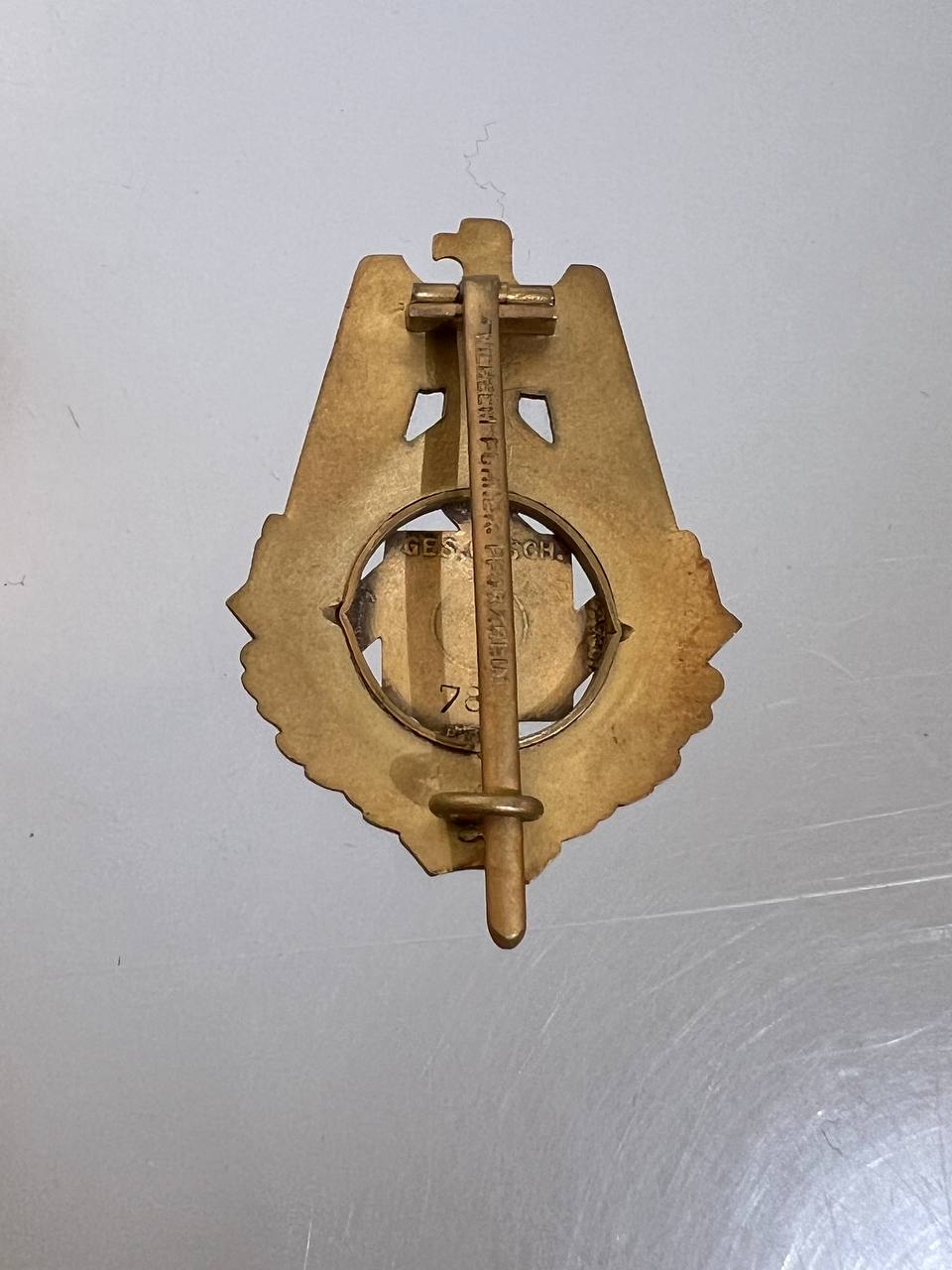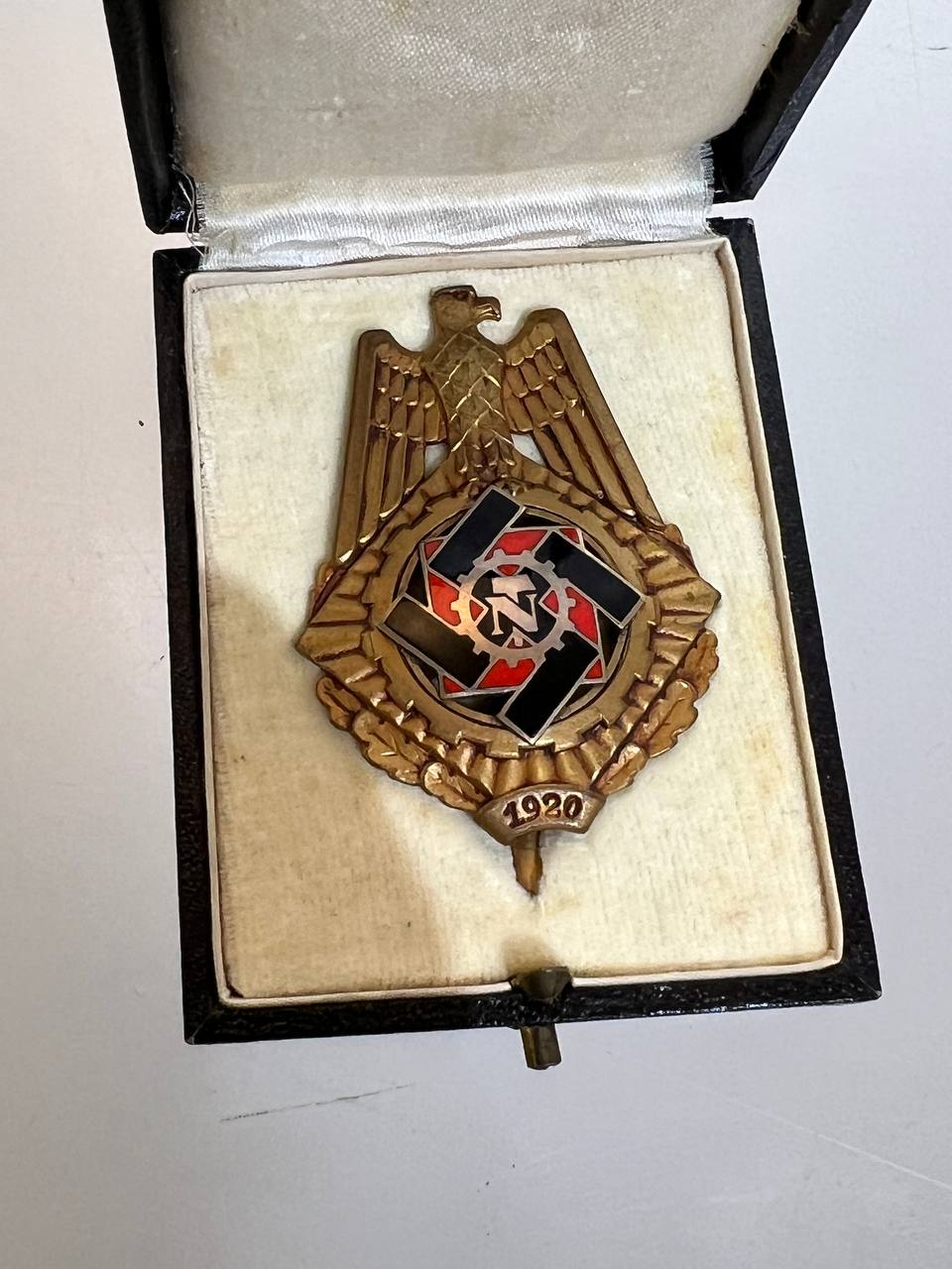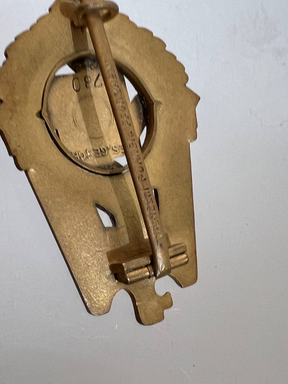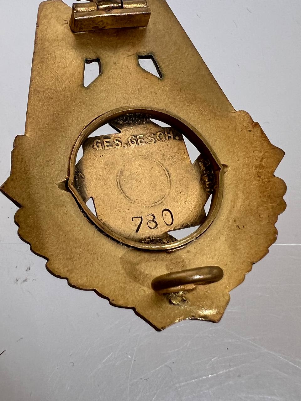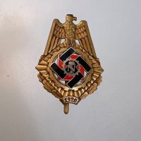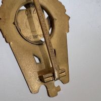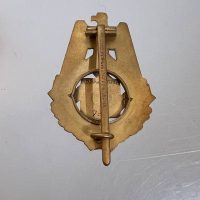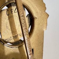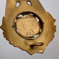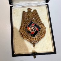 Pin-back badge, toned base metal, enameled center. Reverse of pin marked with maker “Wilhelm Fühner, Pforzheim”, award number 780. Complete in original presentation case, underside with affixed vignette and matching award number 780.