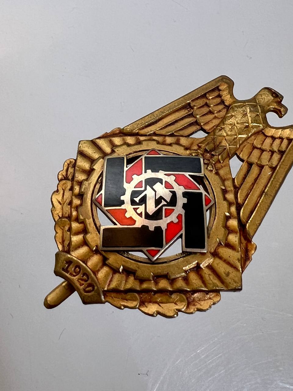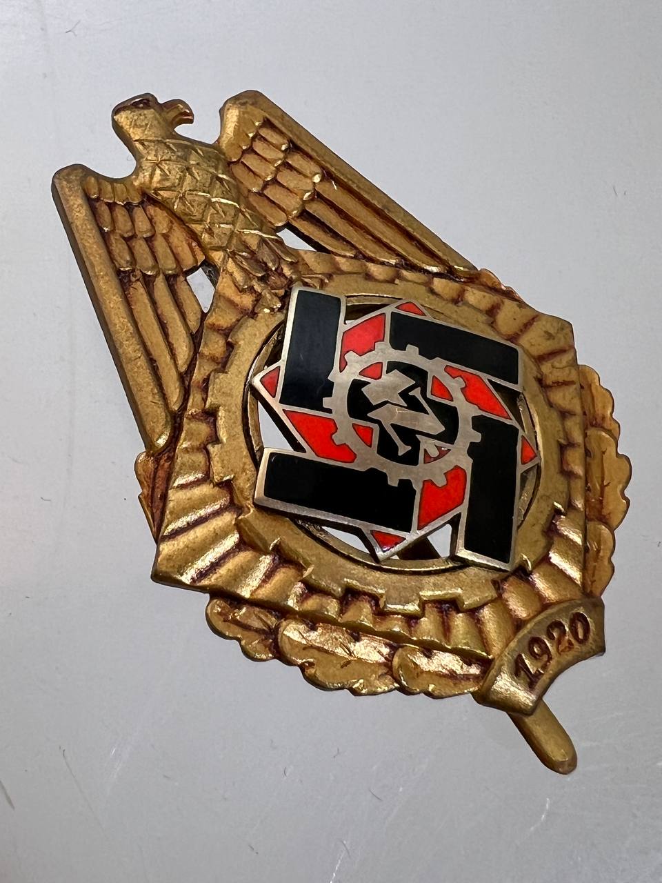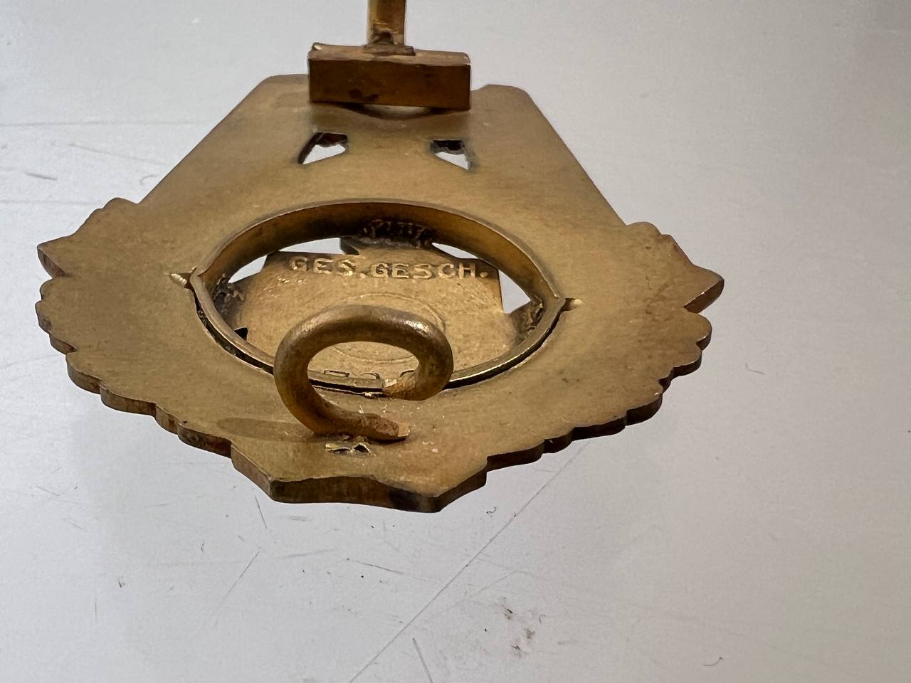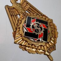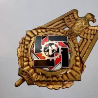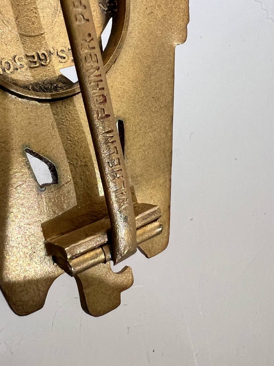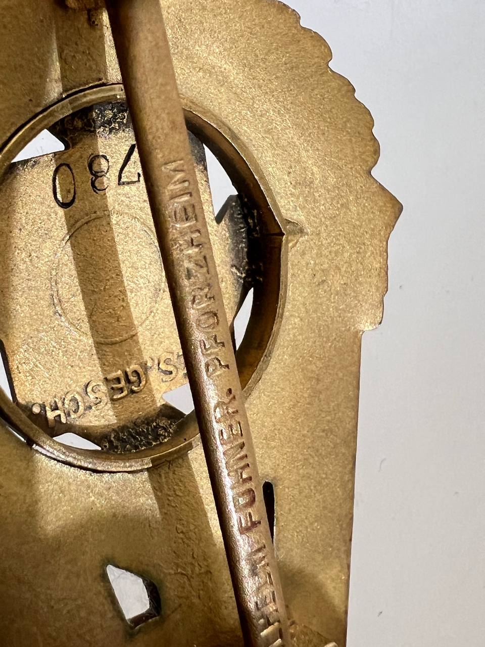 Pin-back badge, toned base metal, enameled center. Reverse of pin marked with maker “Wilhelm Fühner, Pforzheim”, award number 780. Complete in original presentation case, underside with affixed vignette and matching award number 780.