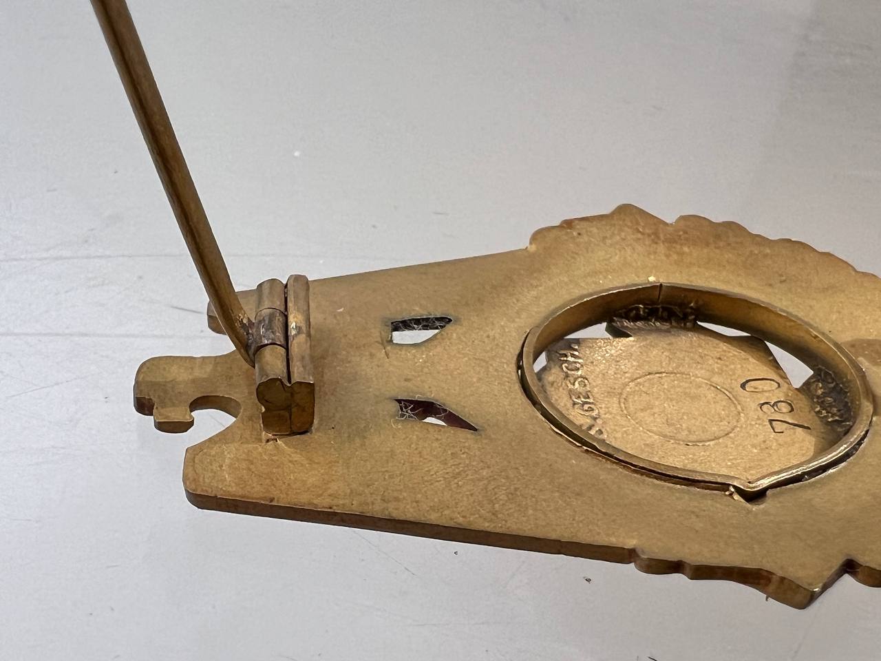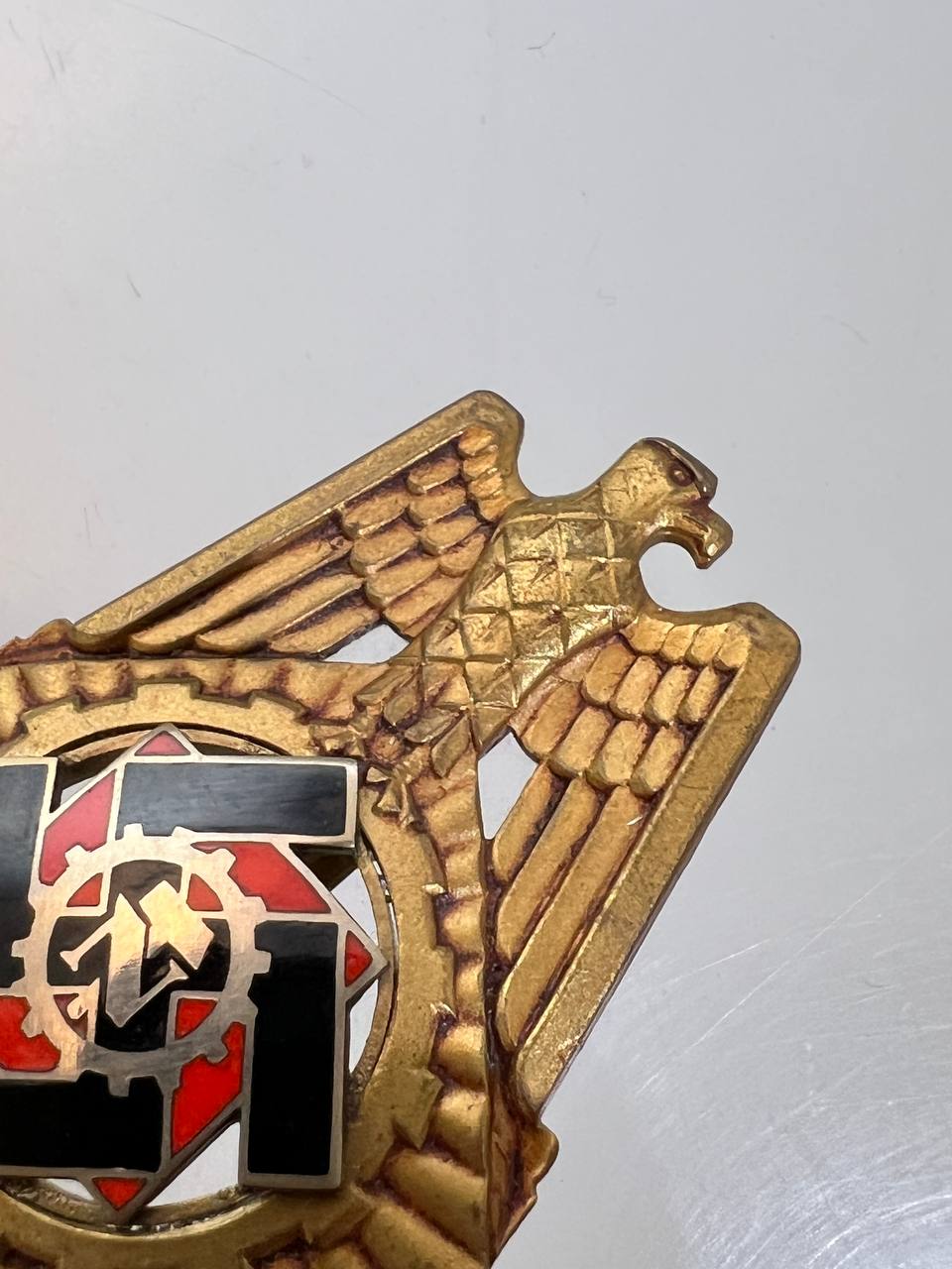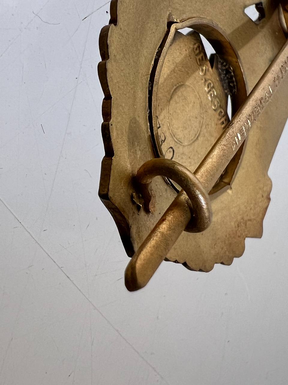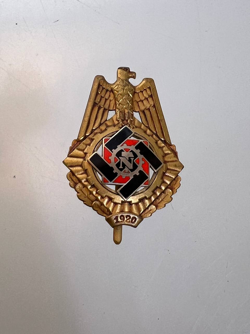 Pin-back badge, toned base metal, enameled center. Reverse of pin marked with maker “Wilhelm Fühner, Pforzheim”, award number 780. Complete in original presentation case, underside with affixed vignette and matching award number 780.