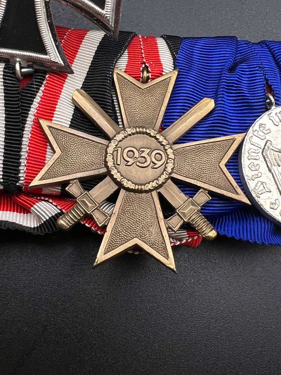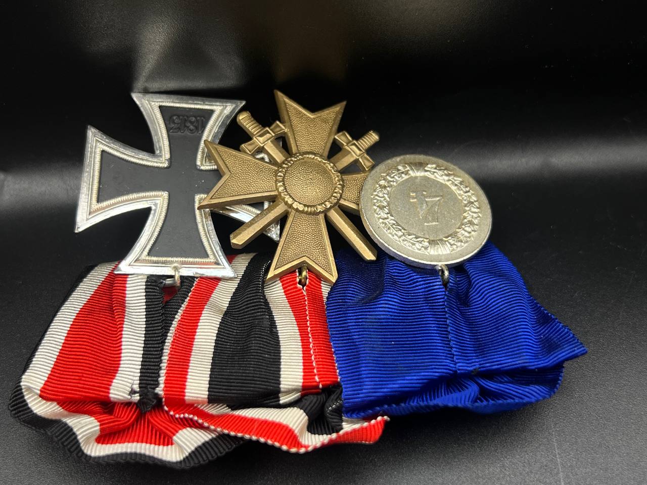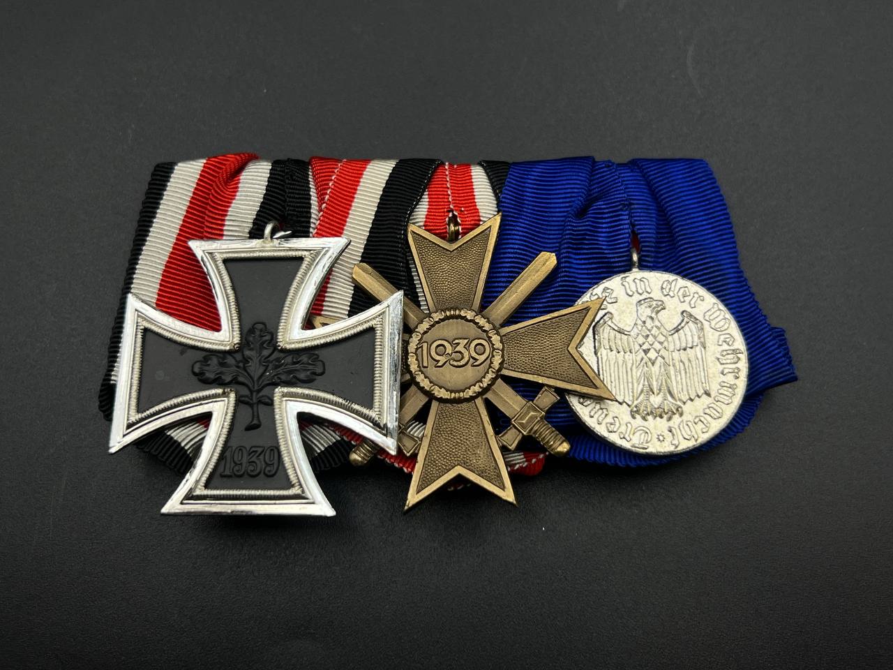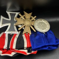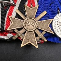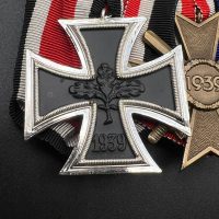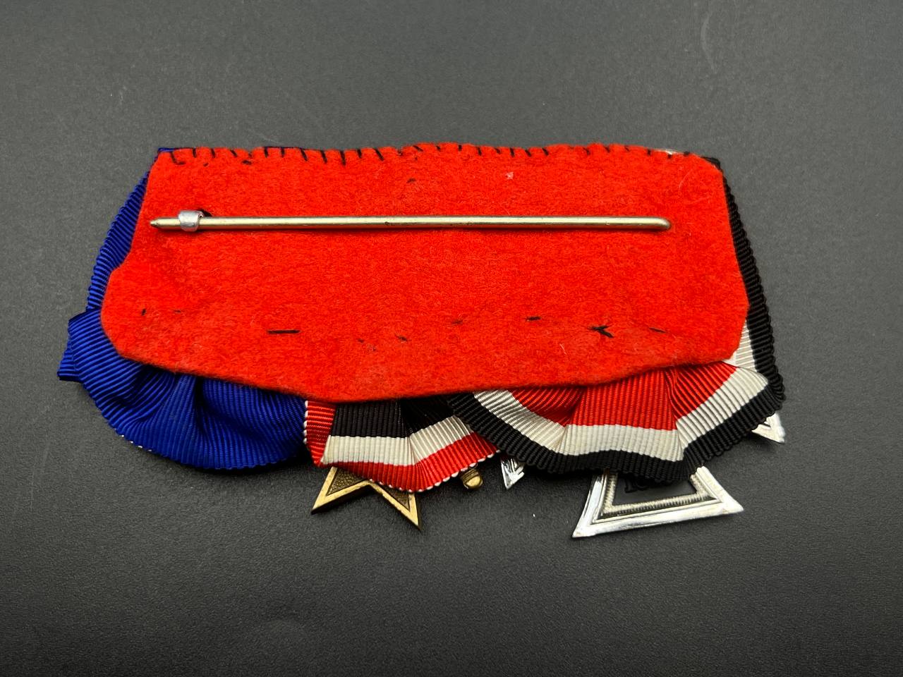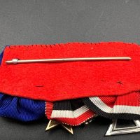 A post-war medal bar assembled in accordance with the 1957 German law permitting veterans to wear “denazified” versions of wartime decorations, redesigned without prohibited symbols. The bar includes: