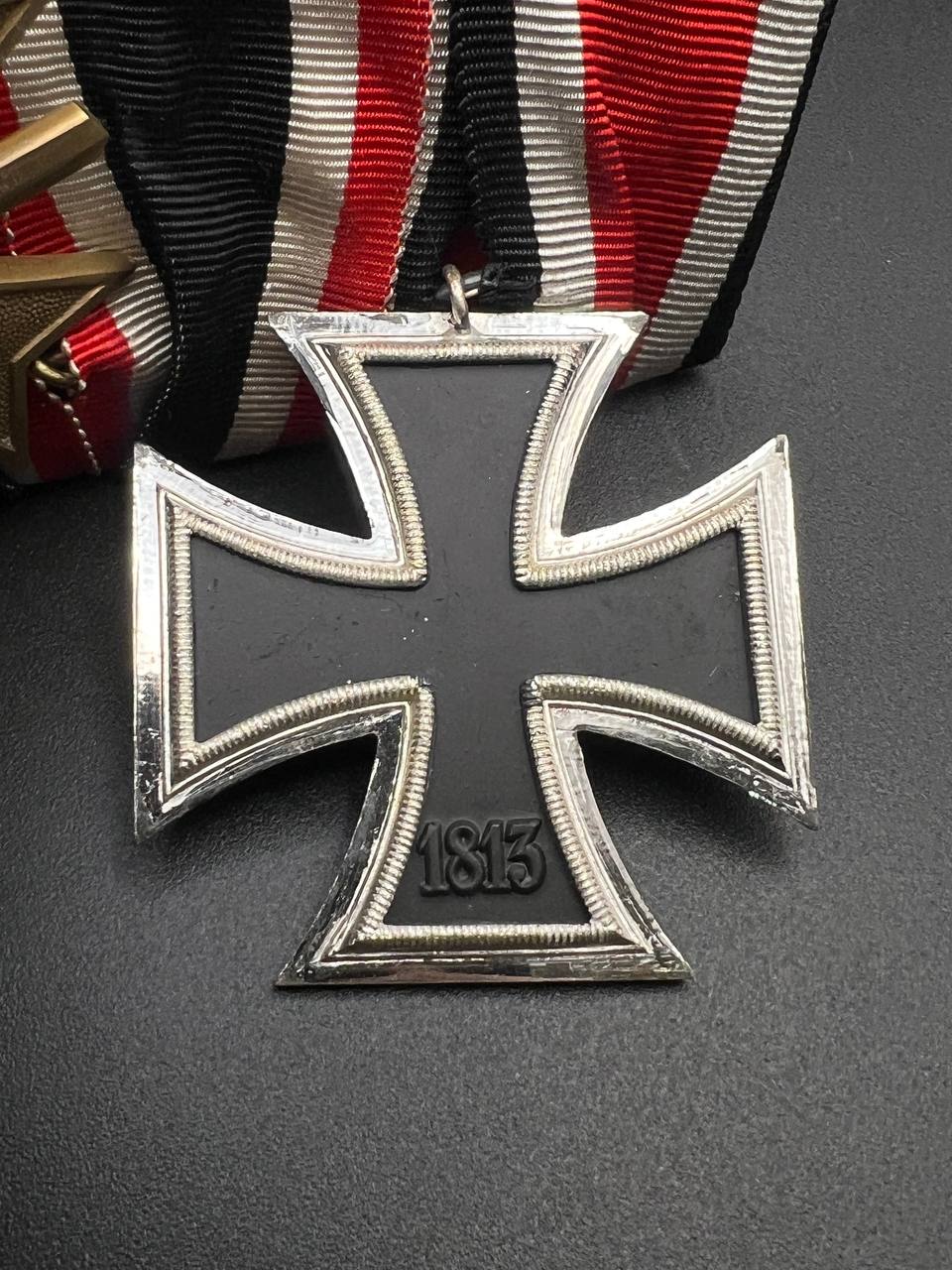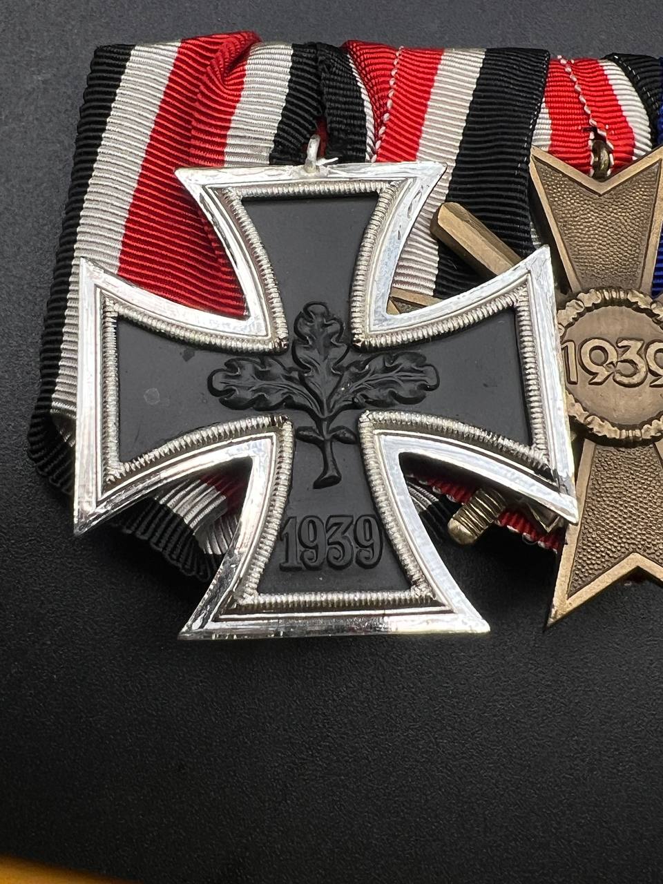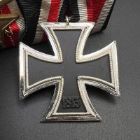 1. Iron Cross 2nd Class, 1957 Issue (Eisernes Kreuz 2. Klasse, 1957 pattern) — redesigned without the swastika, featuring oak leaves in the center. Nickel-plated frame, black core, original red-white-black ribbon.