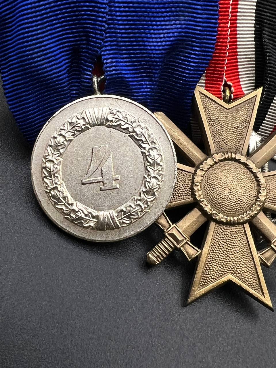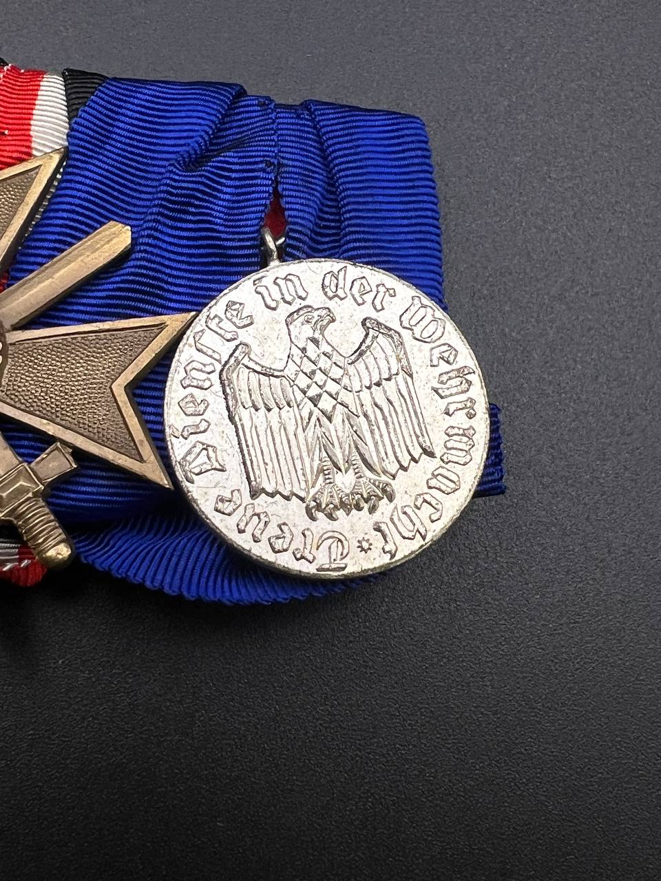 3. Wehrmacht Long Service Medal, 4th Class, 1957 Issue (Wehrmacht Dienstauszeichnung 4. Klasse, 1957 pattern) — silvered medal with the legal FRG design, on the correct blue ribbon.