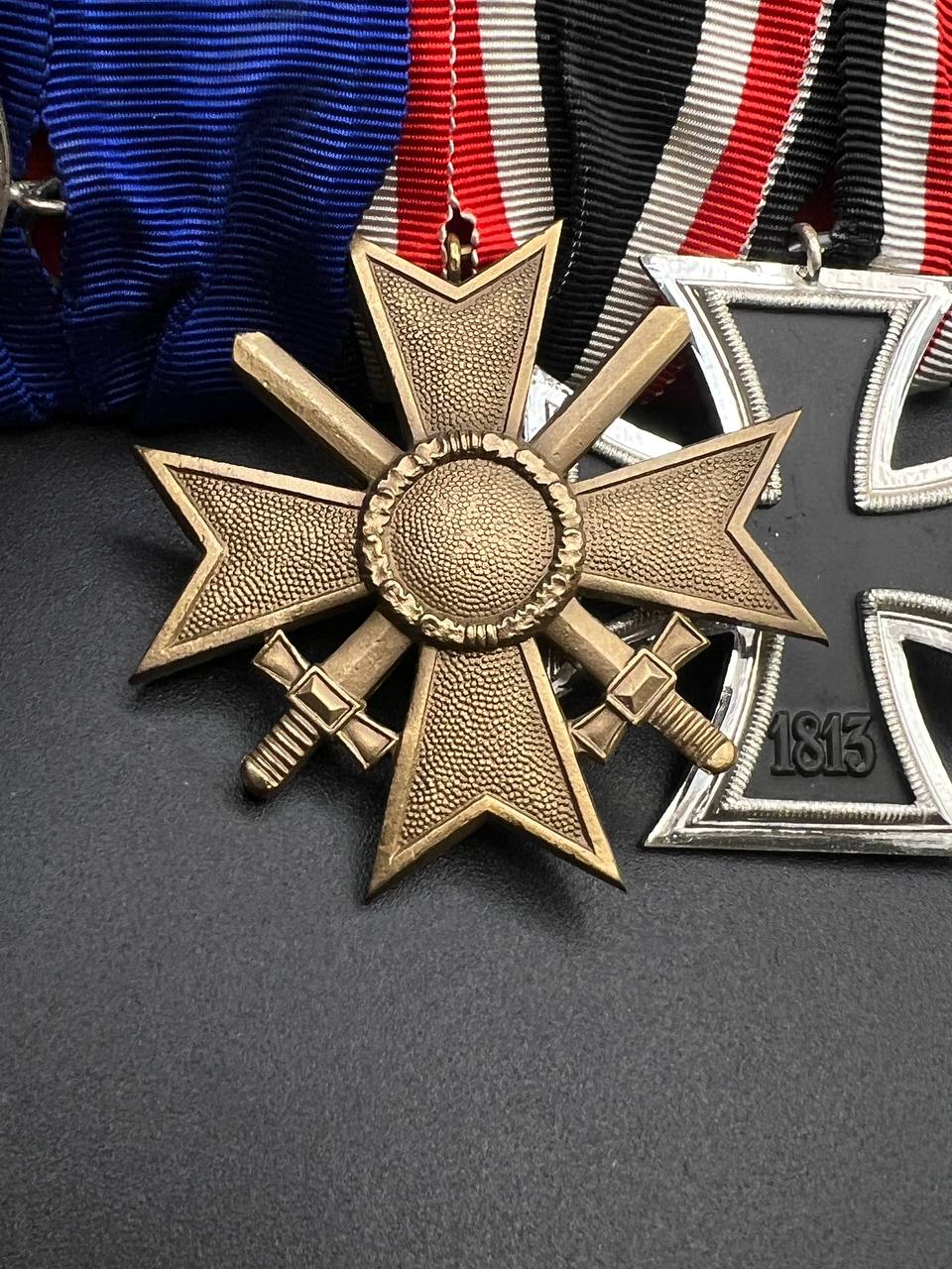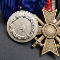 2. War Merit Cross 2nd Class with Swords, 1957 Issue (Kriegsverdienstkreuz 2. Klasse mit Schwertern, 1957 pattern) — denazified version in bronze finish, original ribbon.