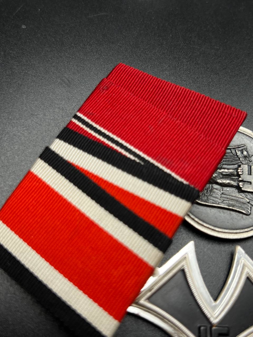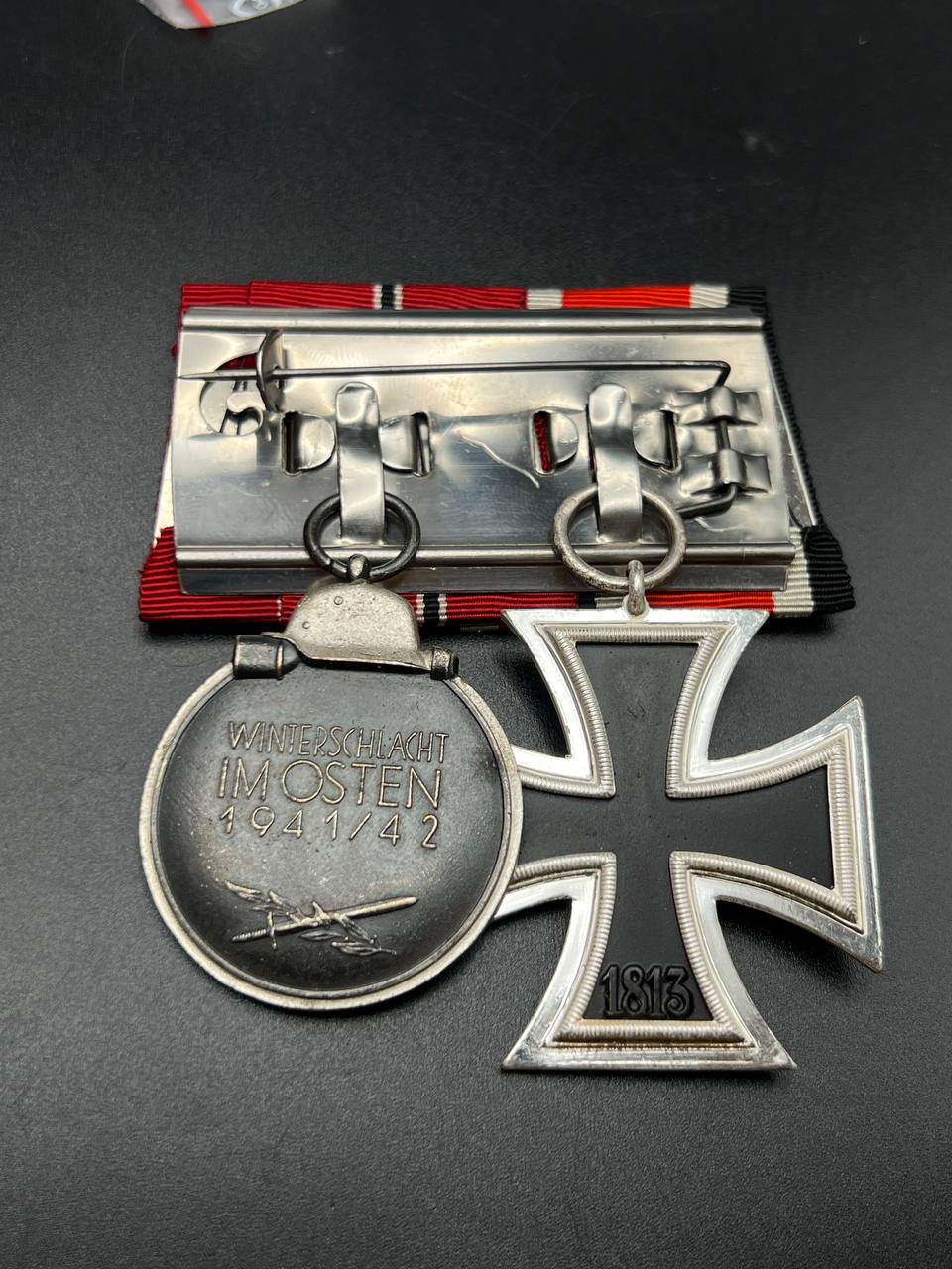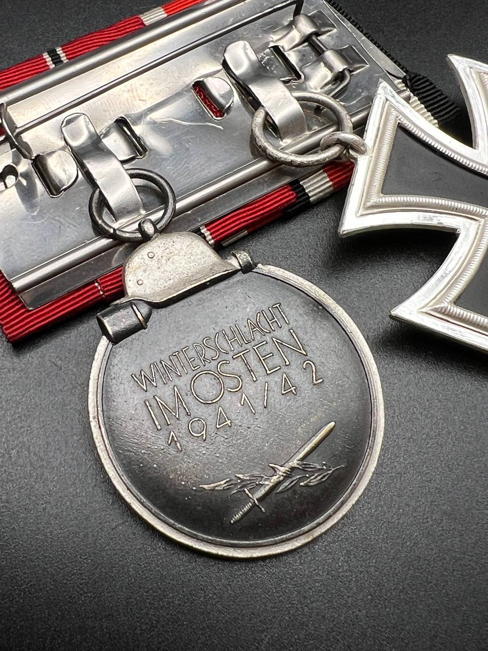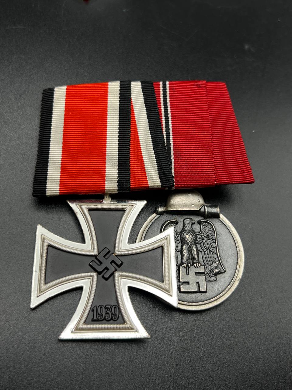 Both decorations show honest age patina; the EK2 enamel remains excellent with no damage, and the Ostmedaille retains strong details. Ribbons are vivid and intact. A well-assembled and representative medal bar.