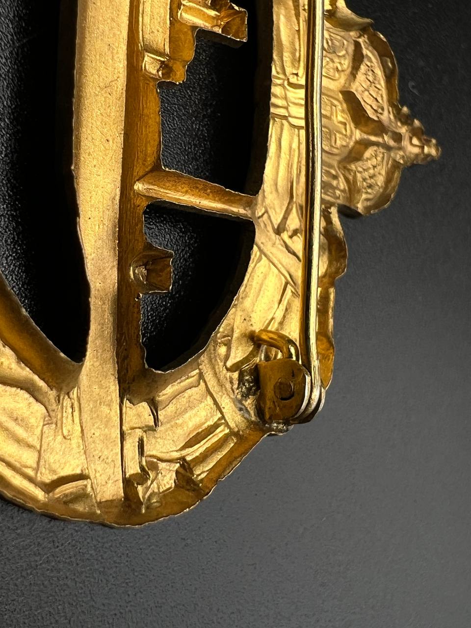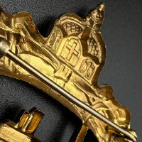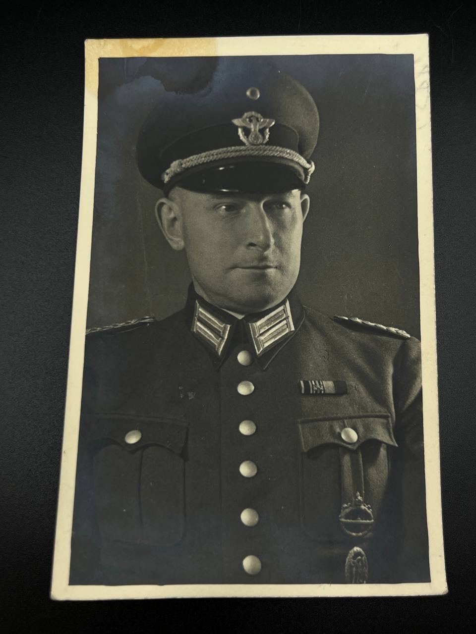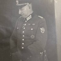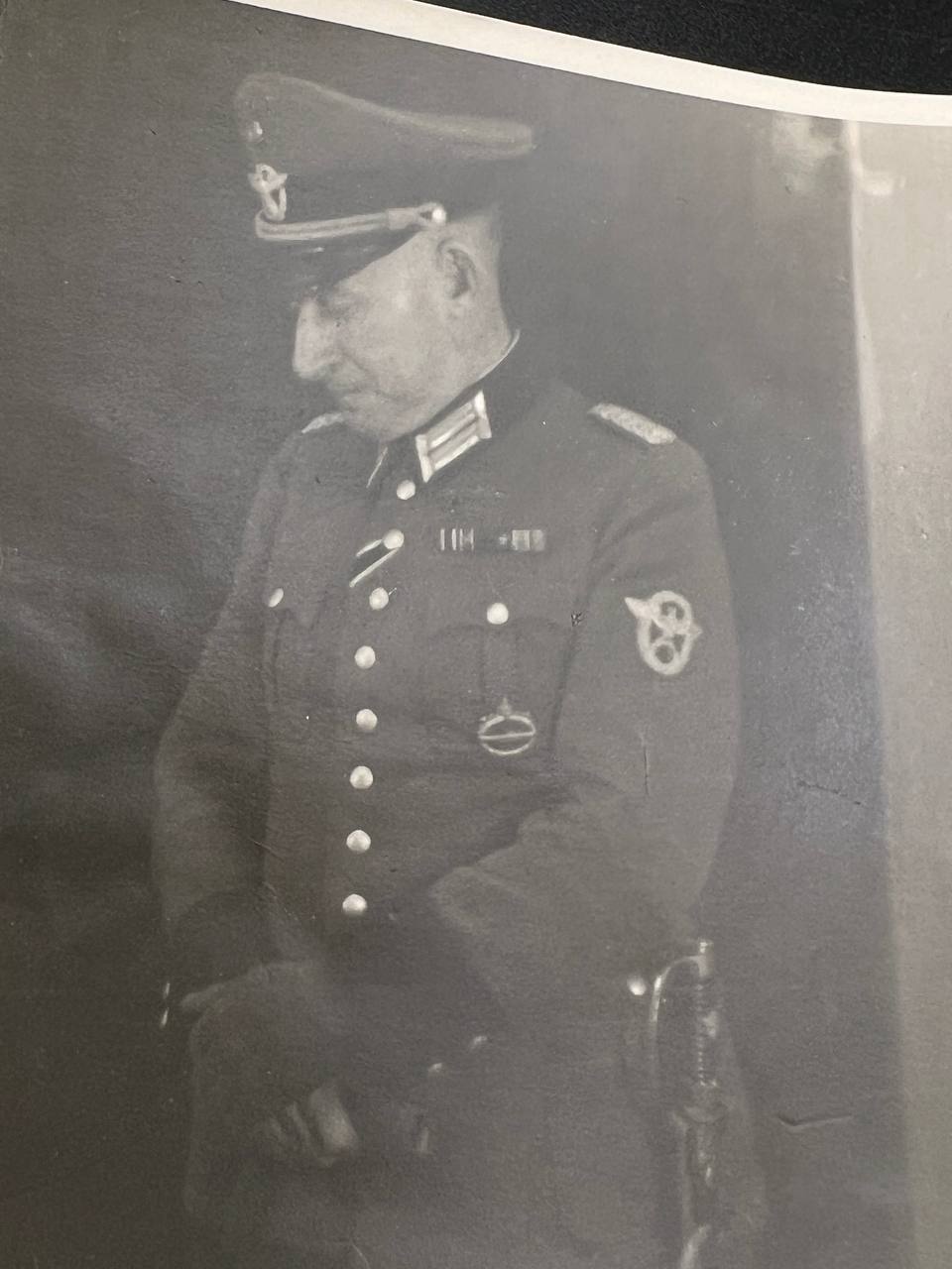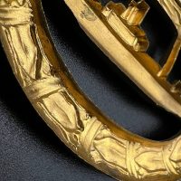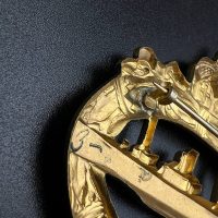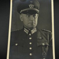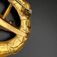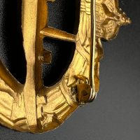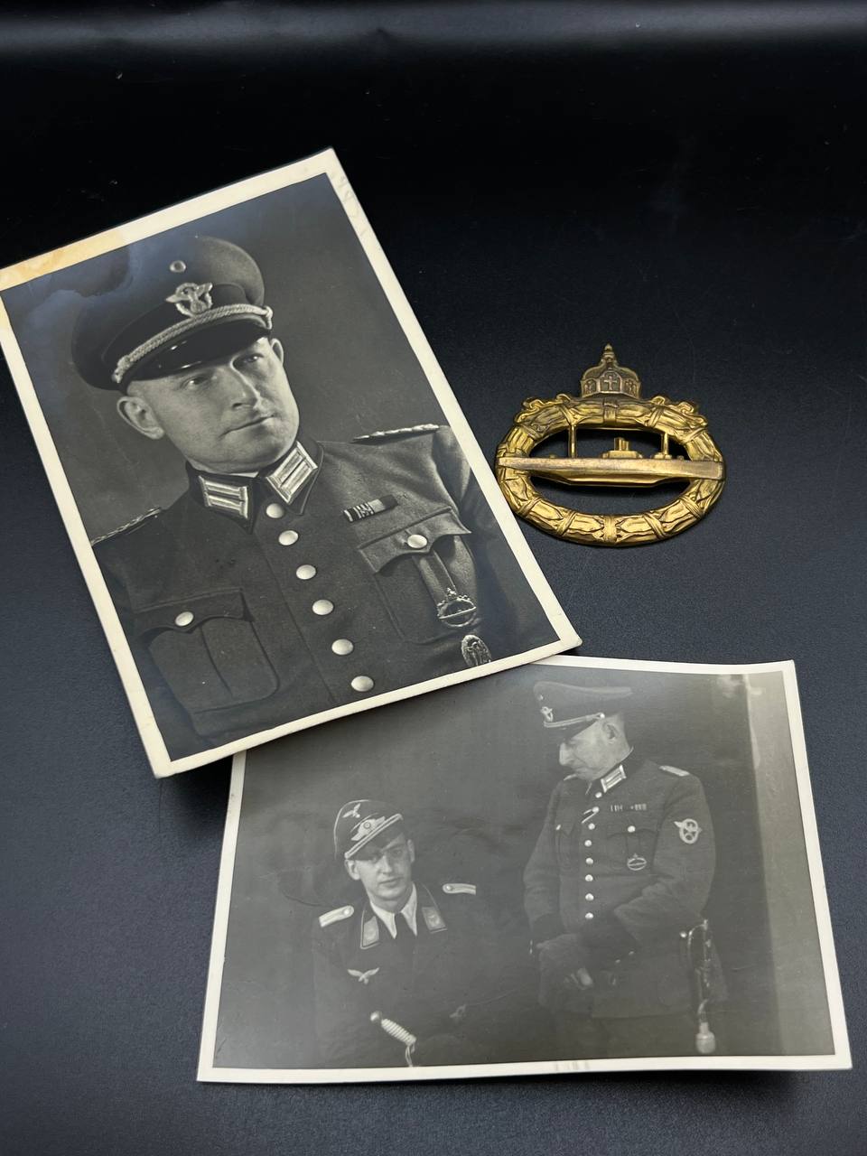 hollow embossed and gold-plated, thin horizontal pin on reverse, privately purchased piece from the 1920s. Accompanied by 2 photographs of a police officer in the rank of Major. Notation on reverse: “Flensburg 16.10.38 zur lieben Erinnerung, Adolf”
