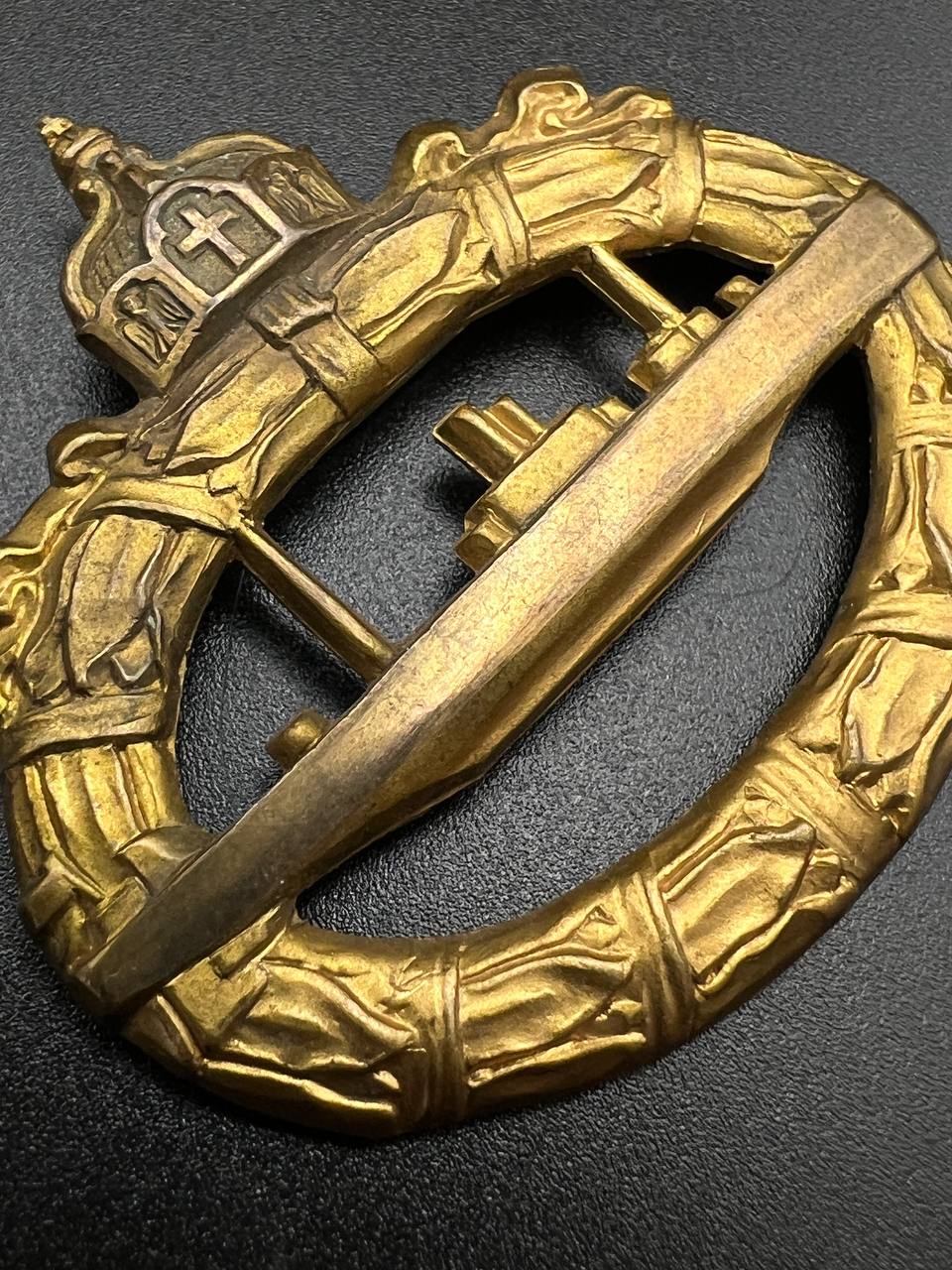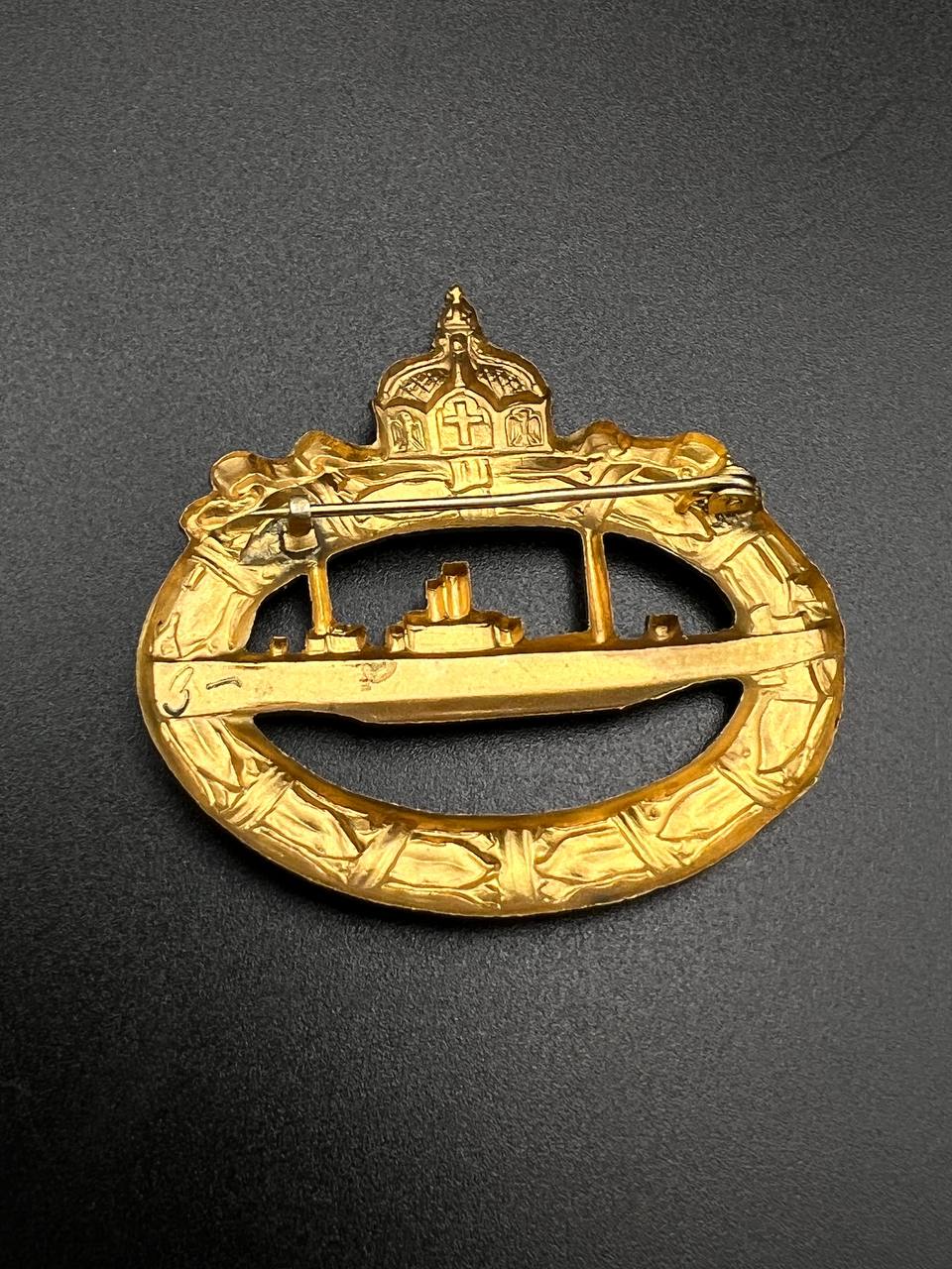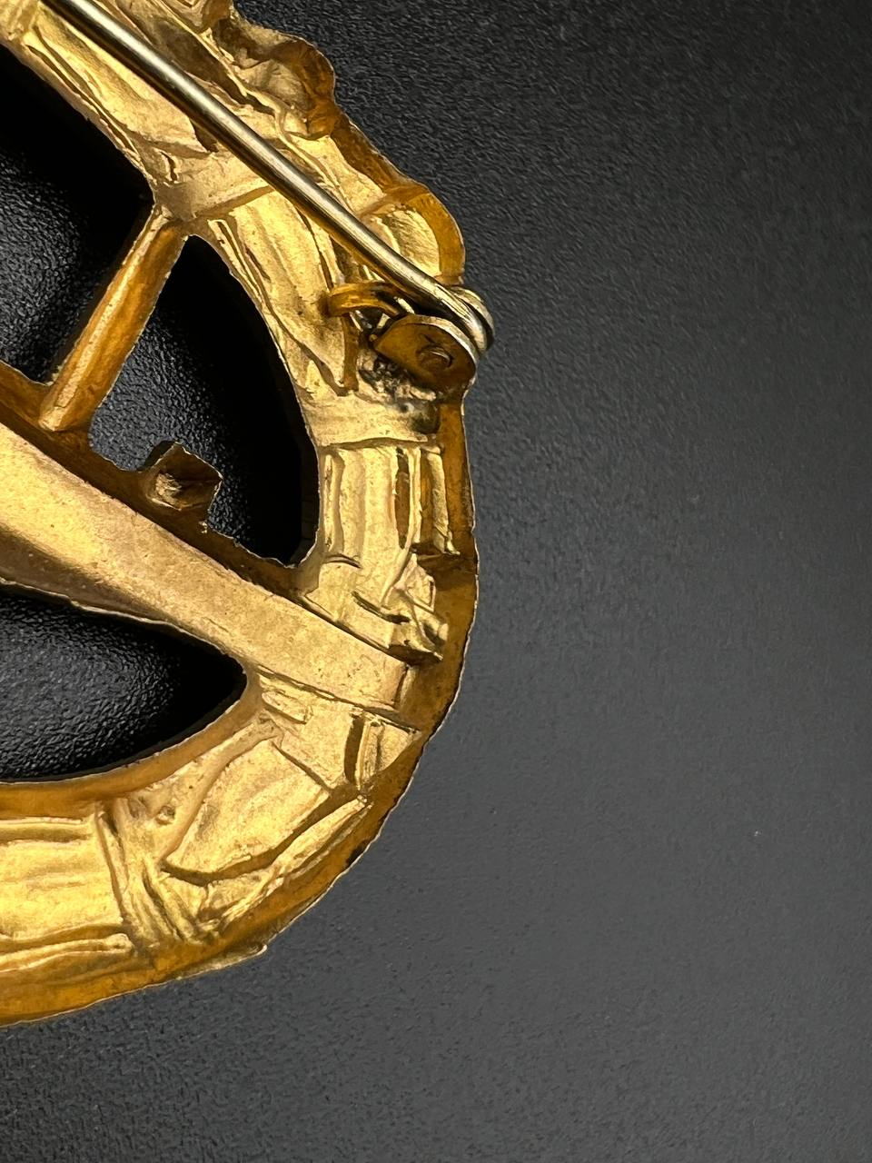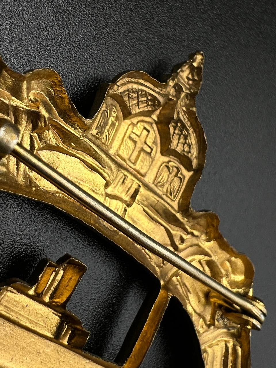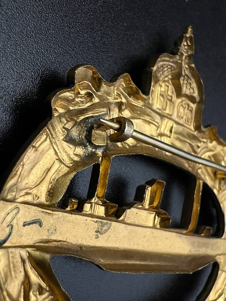 hollow embossed and gold-plated, thin horizontal pin on reverse, privately purchased piece from the 1920s. Accompanied by 2 photographs of a police officer in the rank of Major. Notation on reverse: “Flensburg 16.10.38 zur lieben Erinnerung, Adolf”