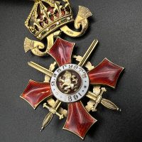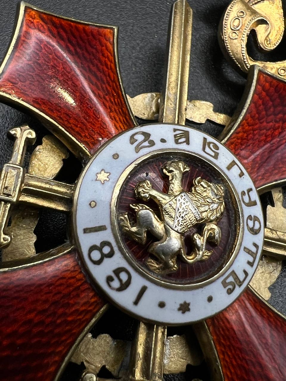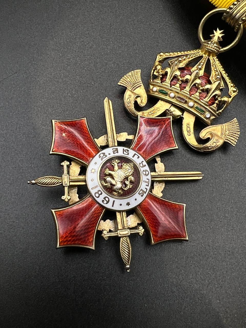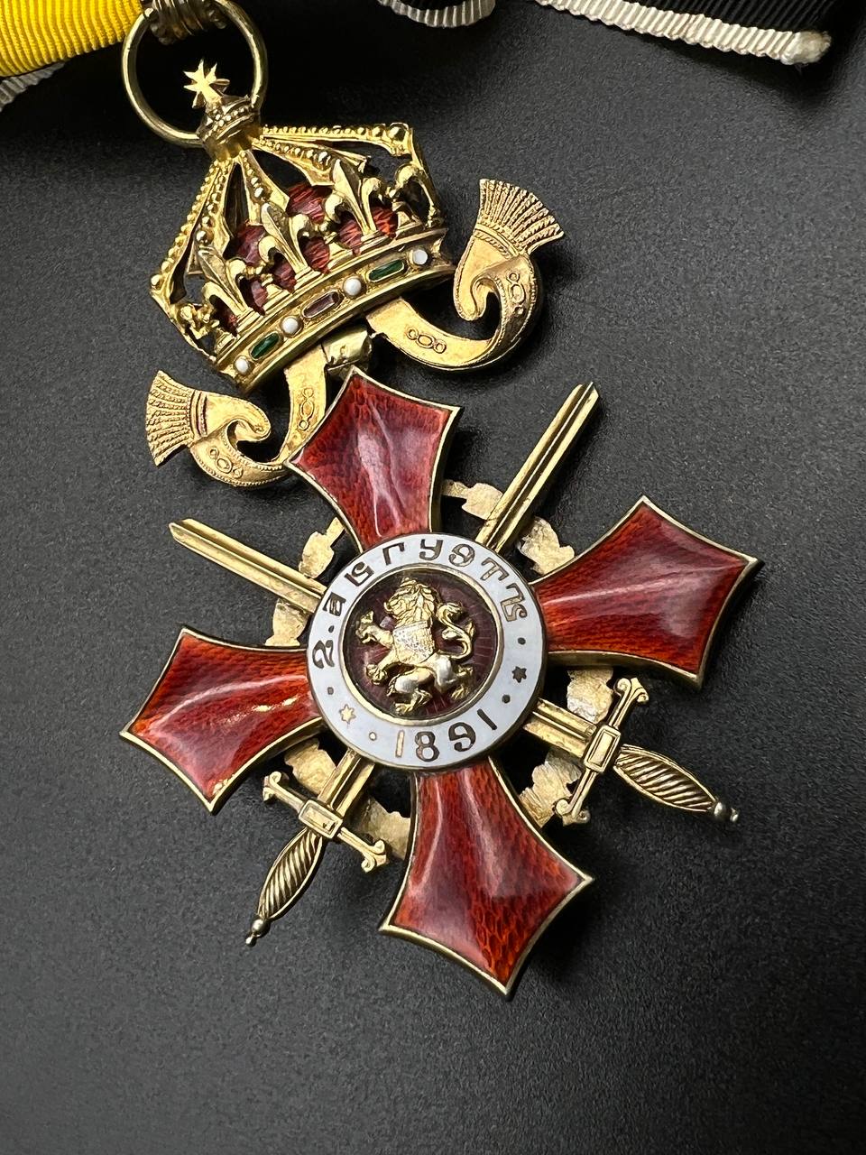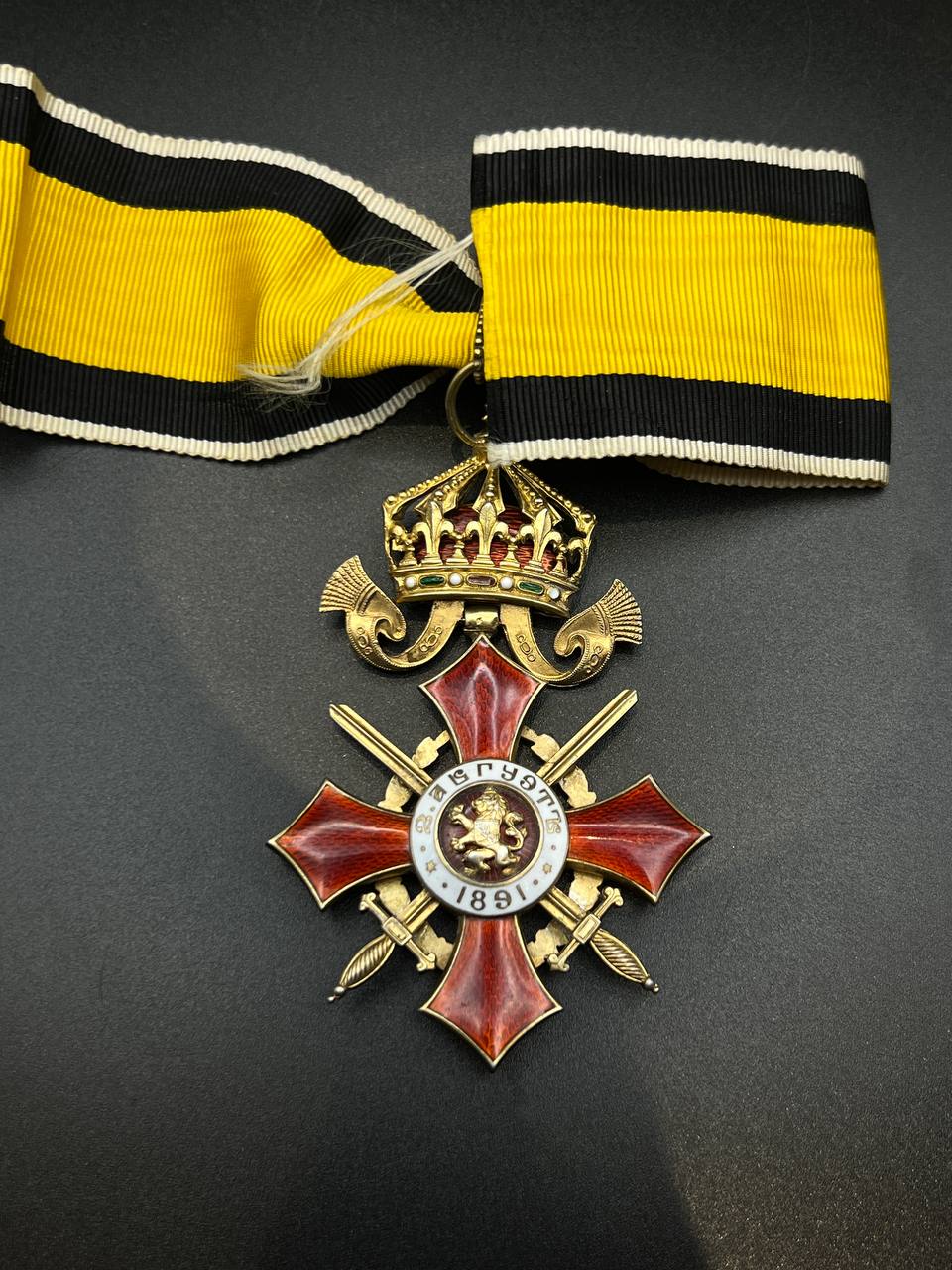 Commander’s Cross of the Order of Military Merit with Swords, suspended on a neck ribbon in black, yellow and white. The cross is covered in deep red enamel, overlaid with gilt swords and a laurel wreath. The central medallion features the Bulgarian rampant lion on a dark red enamel ground, within a white enamel ring inscribed “За военна заслуга” and dated “1891”. The suspension is formed as a royal crown with green and white enamel detailing. Fine quality execution typical of early issues.