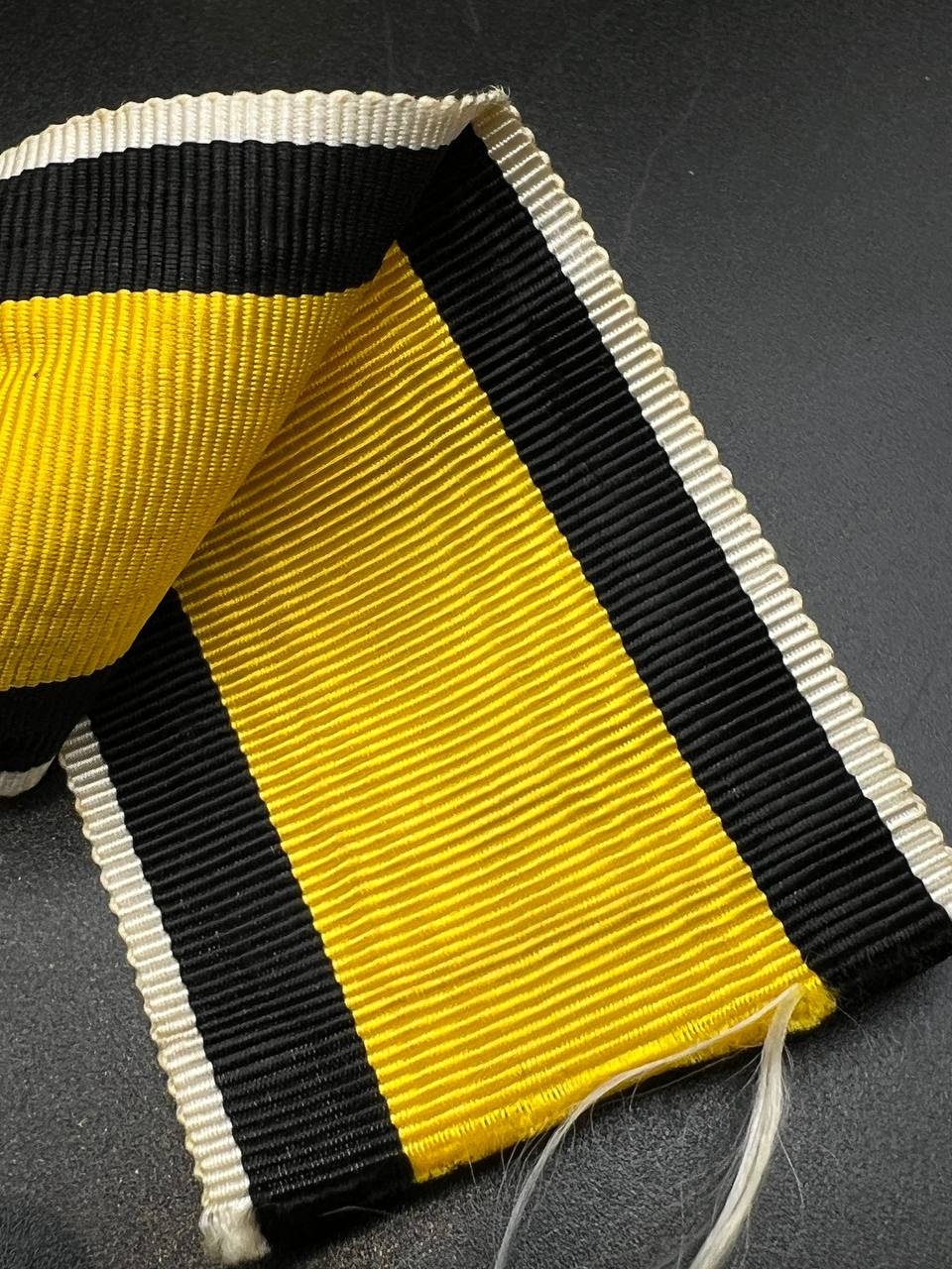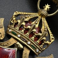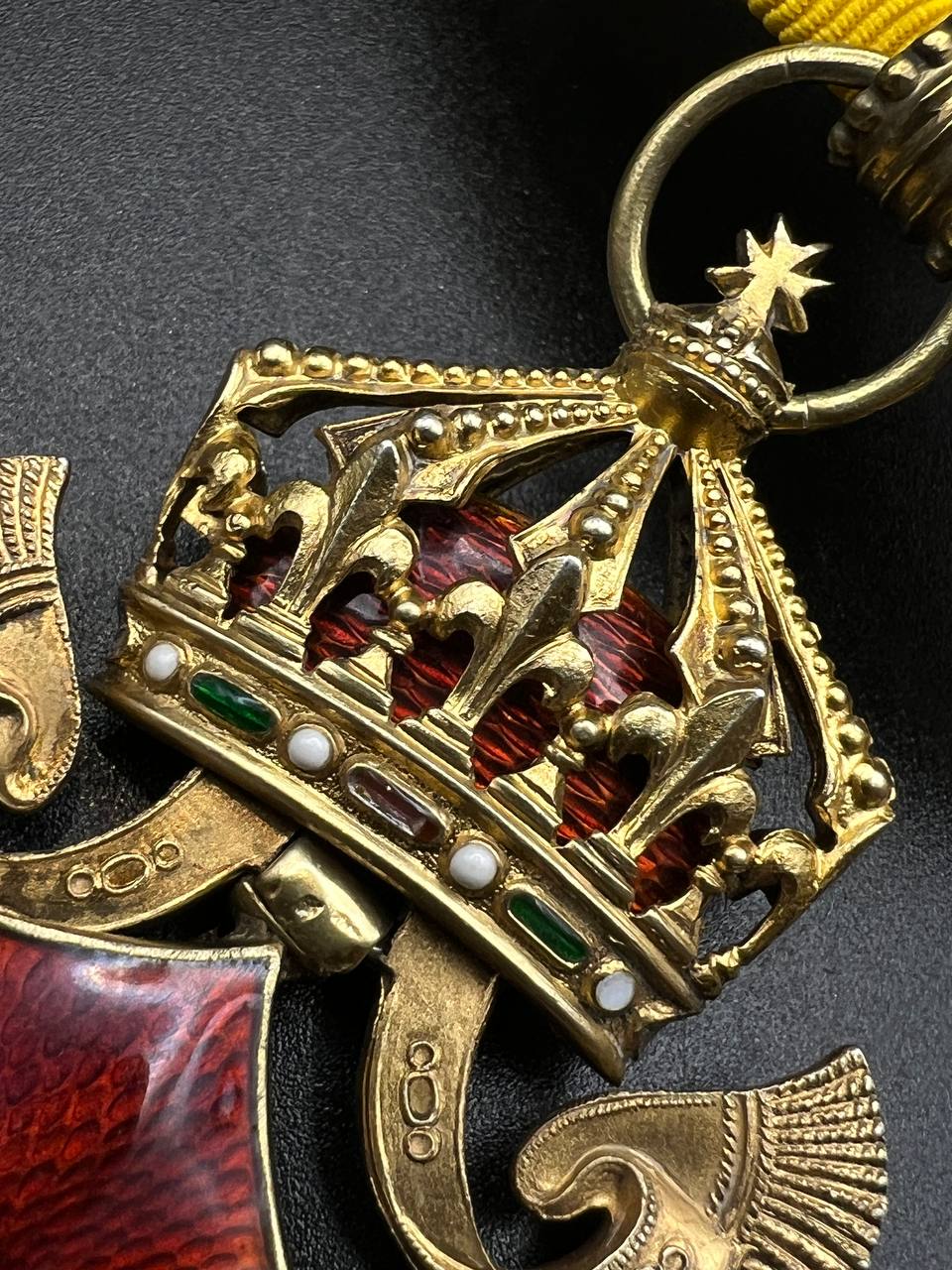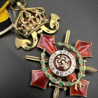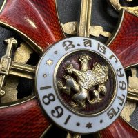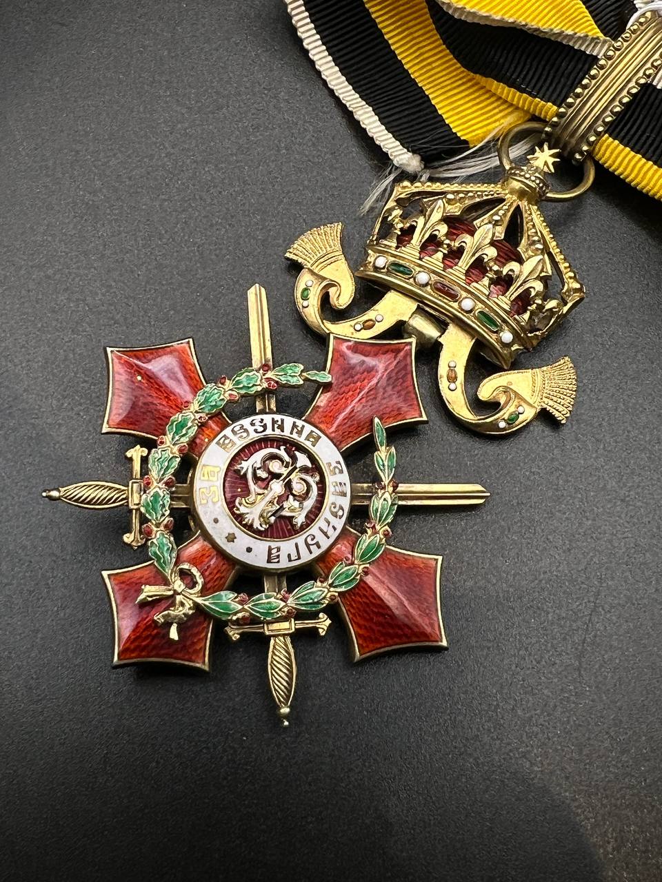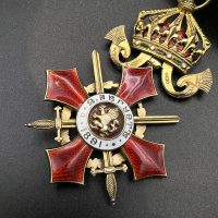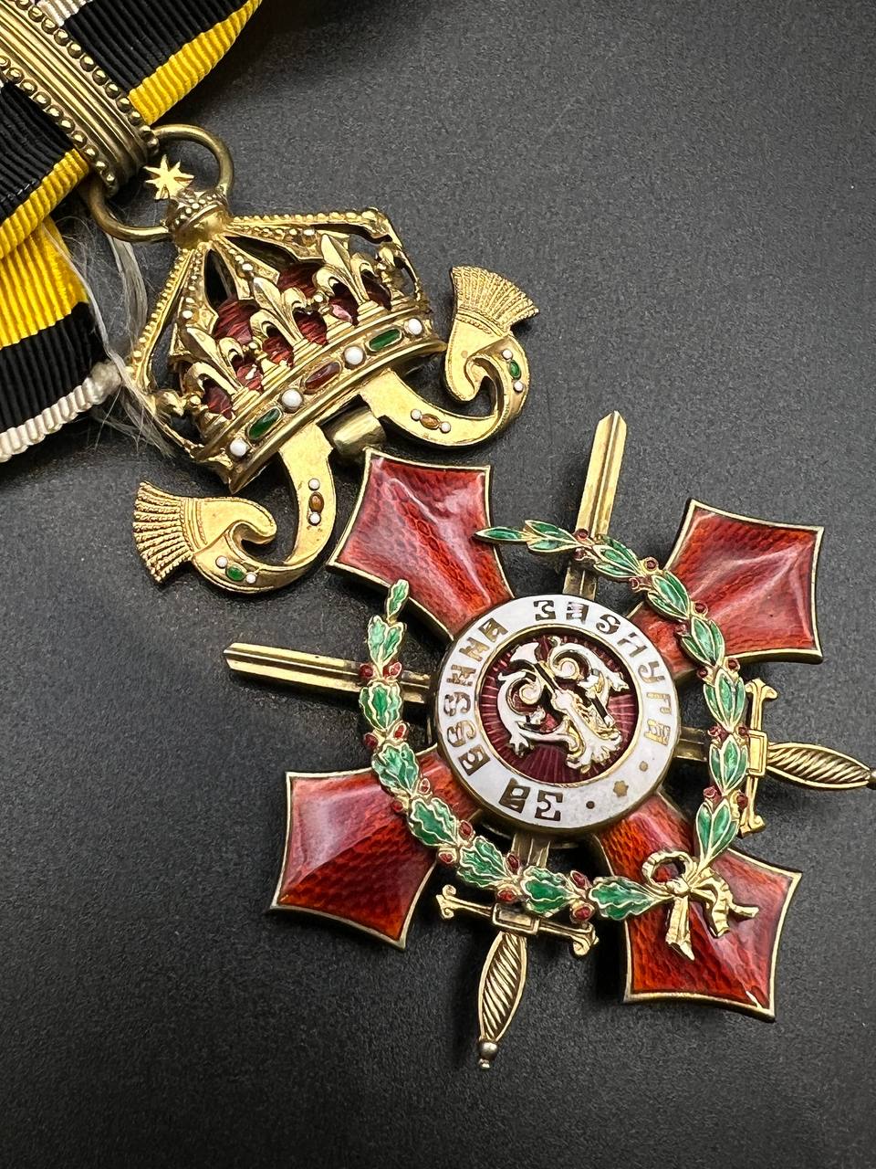 Commander’s Cross of the Order of Military Merit with Swords, suspended on a neck ribbon in black, yellow and white. The cross is covered in deep red enamel, overlaid with gilt swords and a laurel wreath. The central medallion features the Bulgarian rampant lion on a dark red enamel ground, within a white enamel ring inscribed “За военна заслуга” and dated “1891”. The suspension is formed as a royal crown with green and white enamel detailing. Fine quality execution typical of early issues.