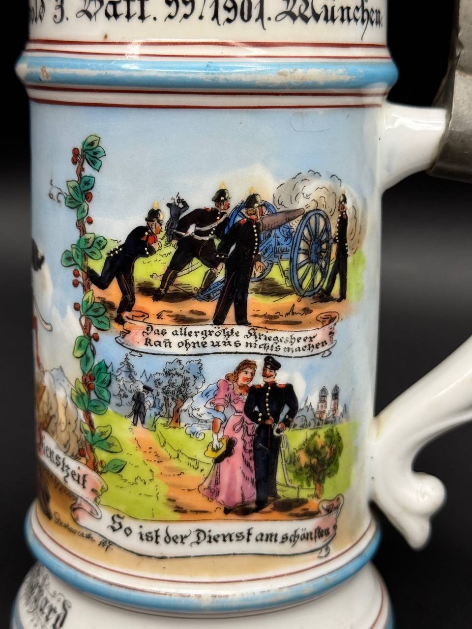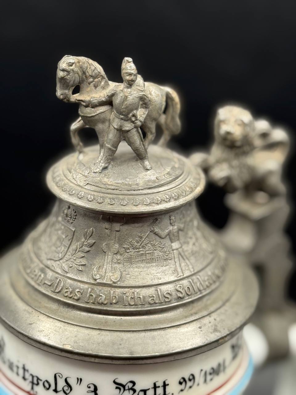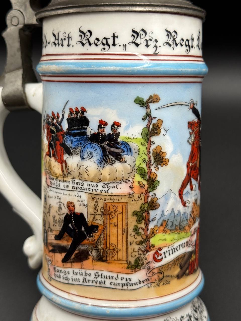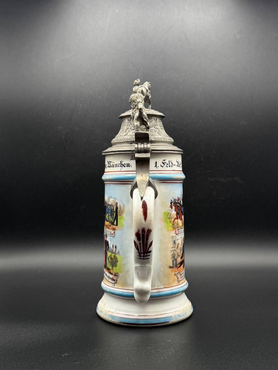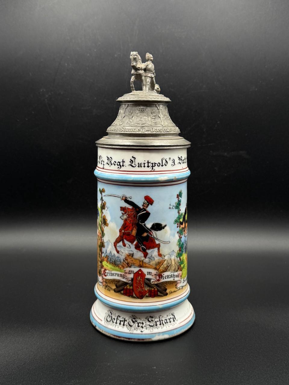 Beautifully hand-painted regimental stein commemorating the service of Gefreiter Fritz Erhard with the 3rd Battery, 2nd Bavarian Field Artillery Regiment “Prinz Luitpold”, stationed in Munich. The front panel depicts a mounted artilleryman charging with sabre against an Alpine backdrop; side scenes show cannon drill, barracks life, and farewells in vibrant colors. Pewter lid features a sculpted horse and soldier, Bavarian crest reliefs, and the traditional toast “Mein Trost in trüben Stunden – Das hübsche Mäd’l aus Bayernland.”