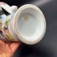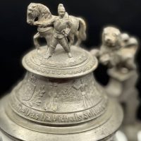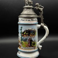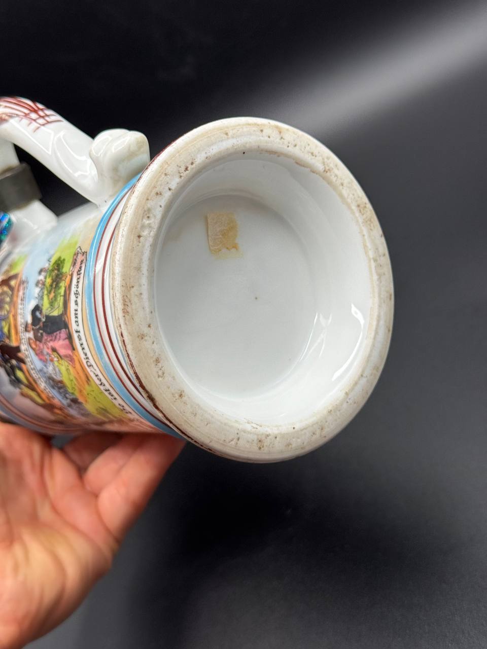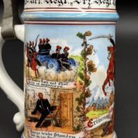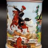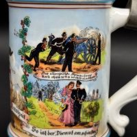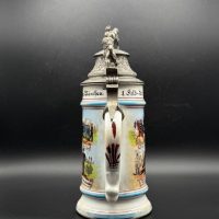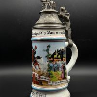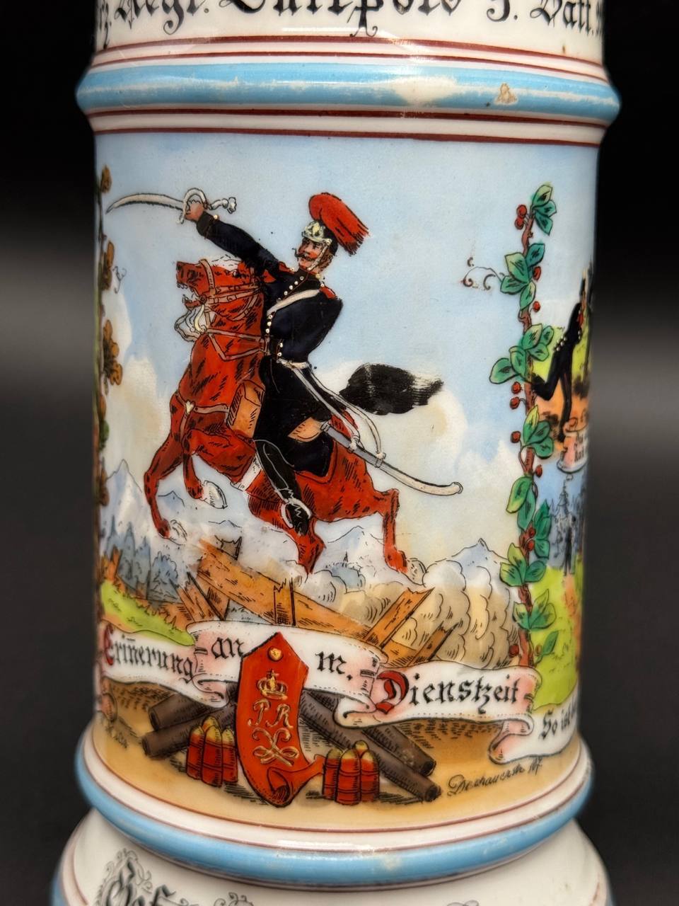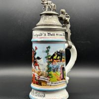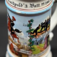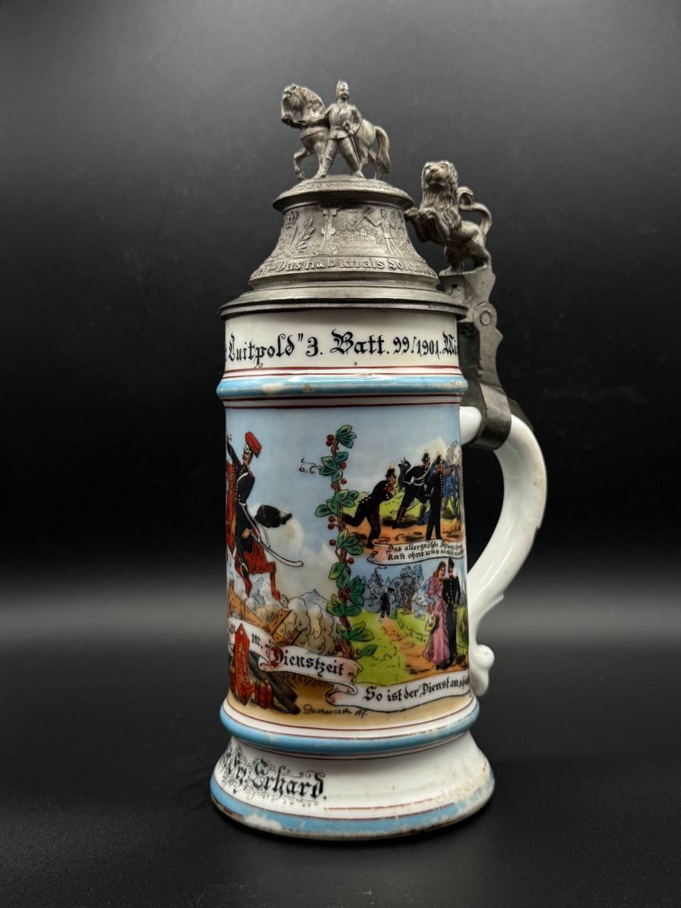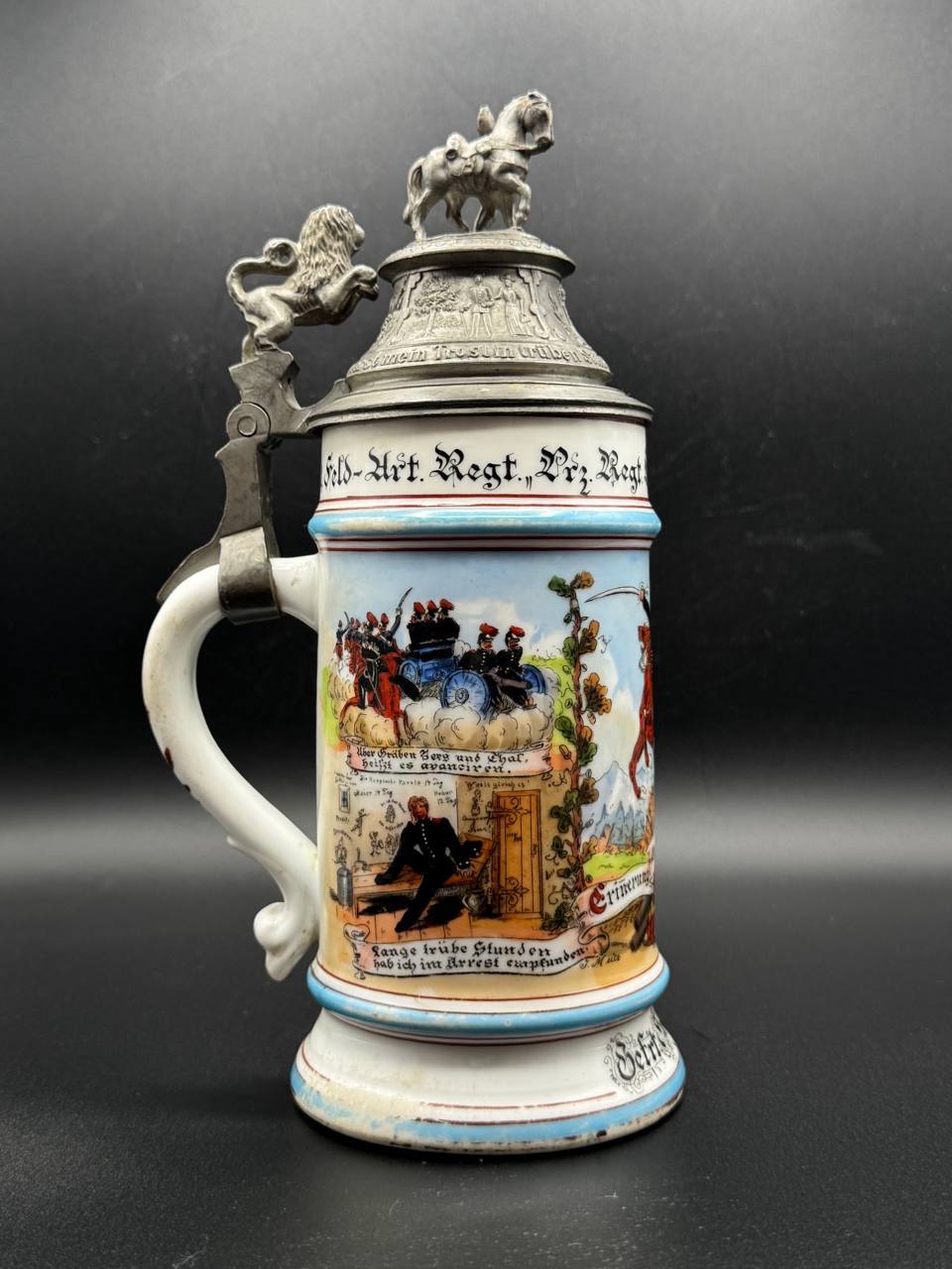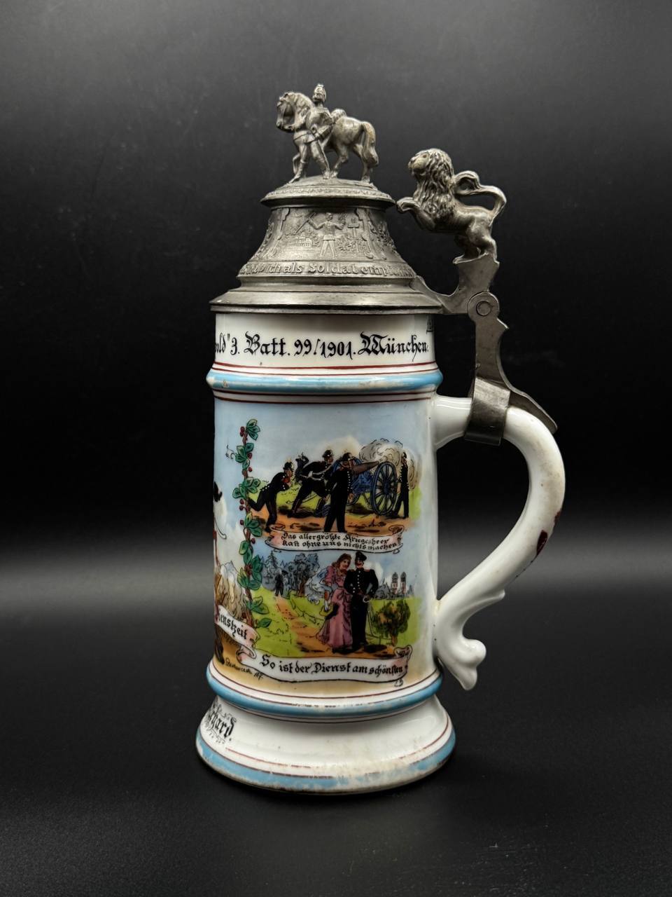 Beautifully hand-painted regimental stein commemorating the service of Gefreiter Fritz Erhard with the 3rd Battery, 2nd Bavarian Field Artillery Regiment “Prinz Luitpold”, stationed in Munich. The front panel depicts a mounted artilleryman charging with sabre against an Alpine backdrop; side scenes show cannon drill, barracks life, and farewells in vibrant colors. Pewter lid features a sculpted horse and soldier, Bavarian crest reliefs, and the traditional toast “Mein Trost in trüben Stunden – Das hübsche Mäd’l aus Bayernland.”