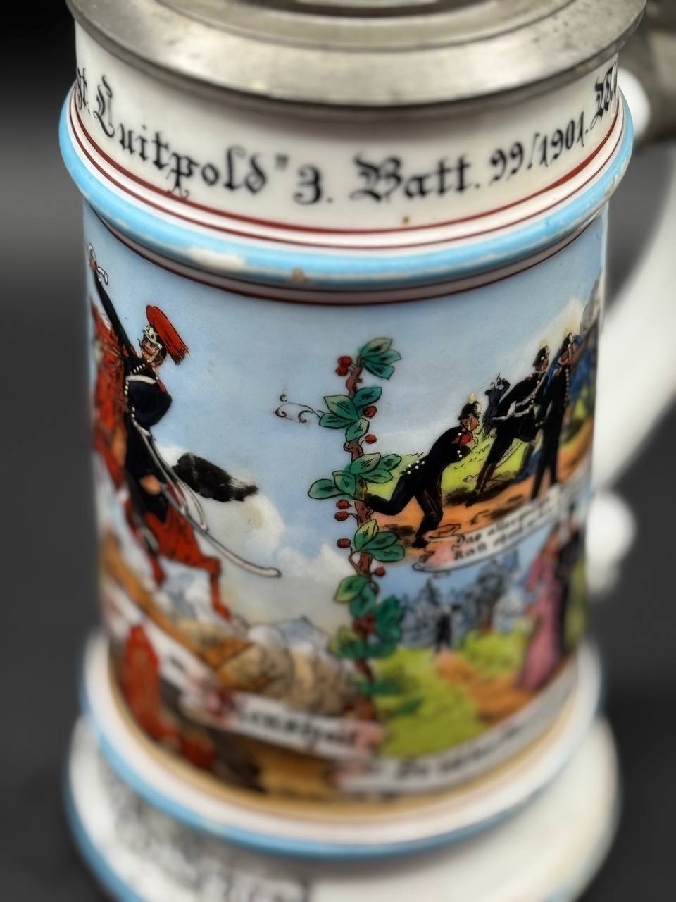 A fine and expressive example of early 20th-century Bavarian craftsmanship, combining humor, color, and regimental pride.