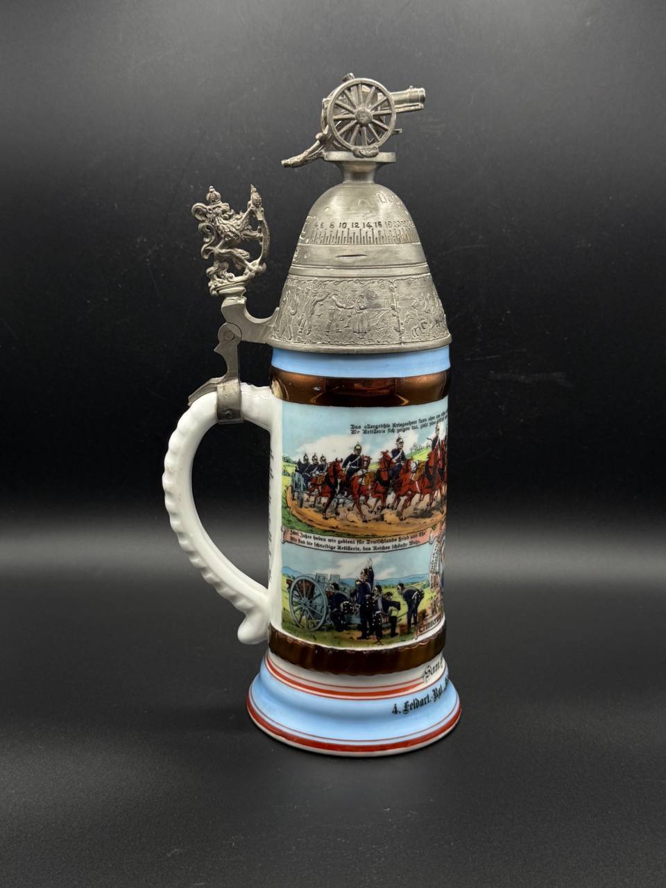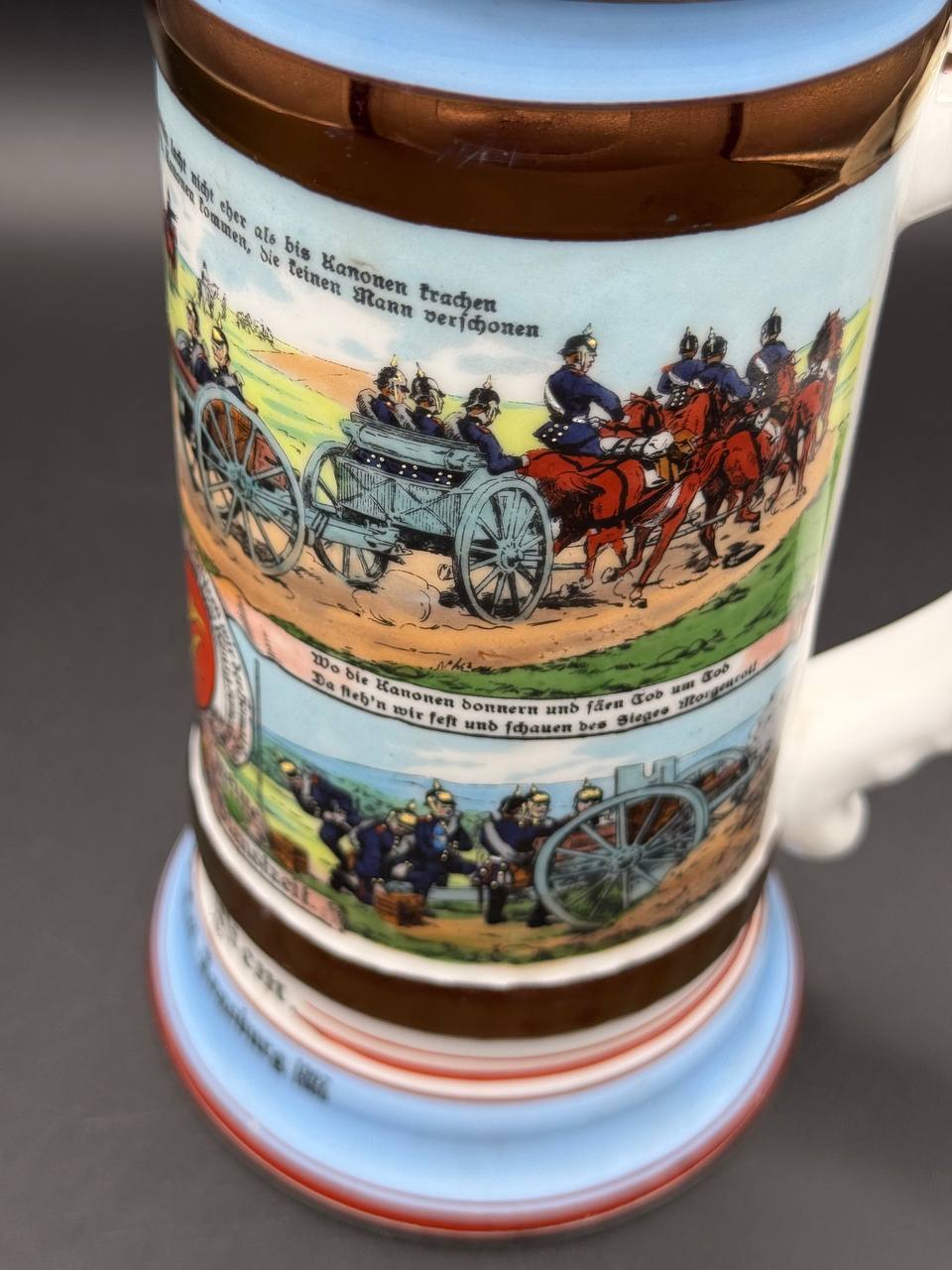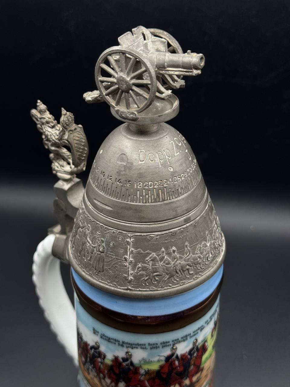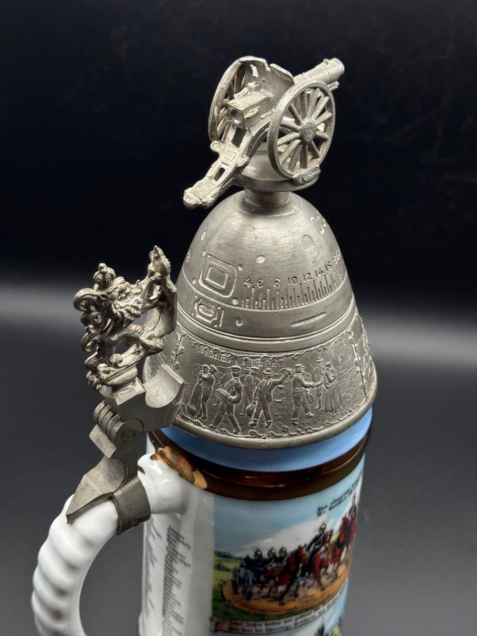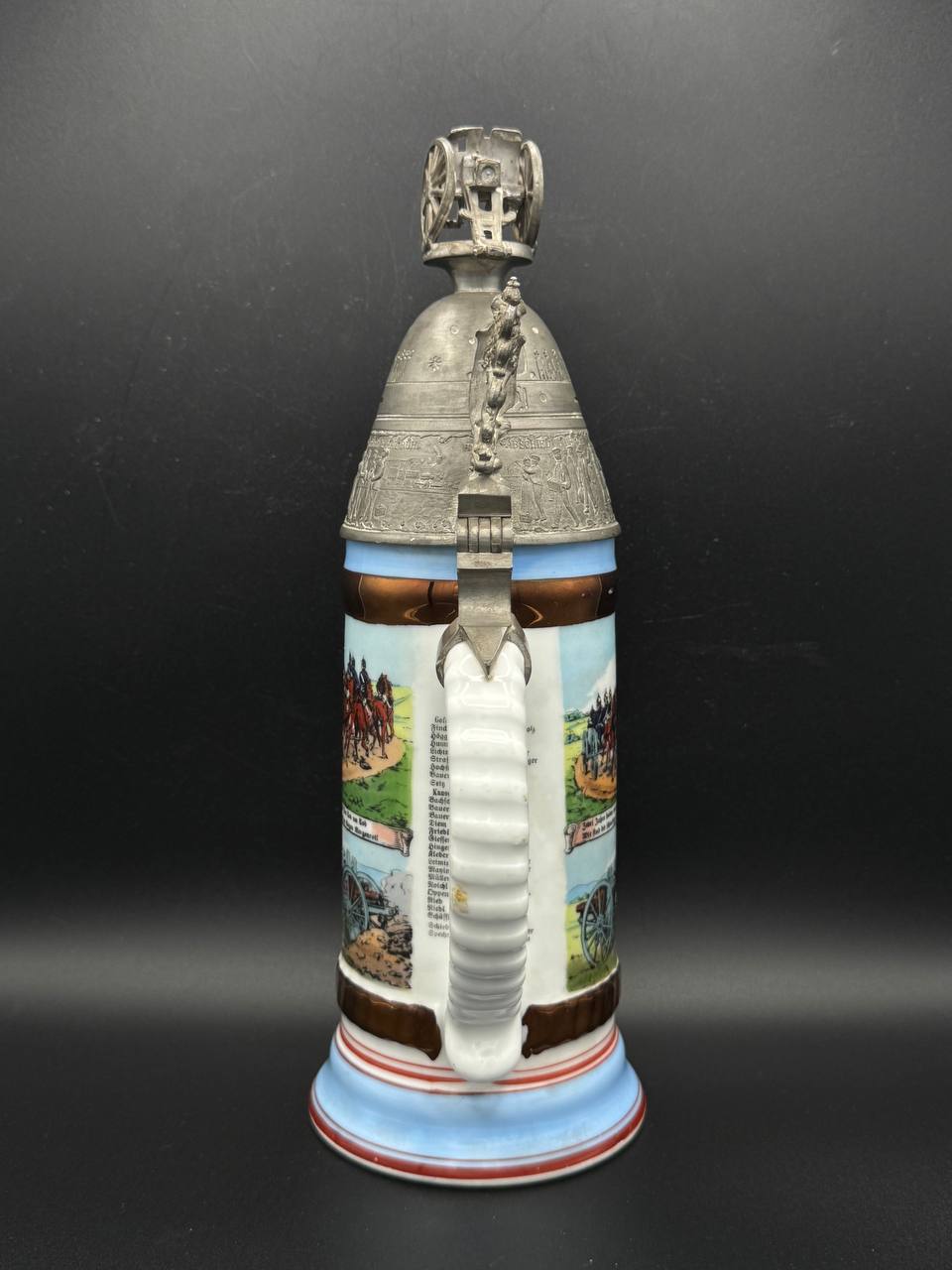 Vibrant hand-painted panels show galloping artillery teams and gun crews in action, framed by patriotic mottos such as “Two years we served for Germany’s peace and honor.” Pewter lid shaped like a shell, topped by a detailed cannon finial and relief war scenes. Handle with Bavarian lion thumb lift, interior lithophane depicting soldier and sweetheart.