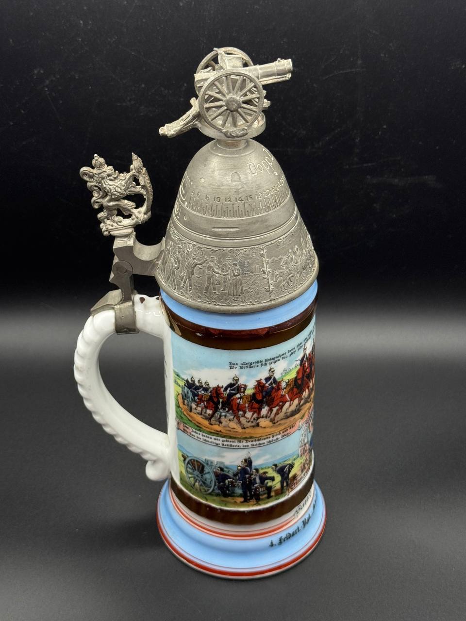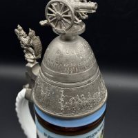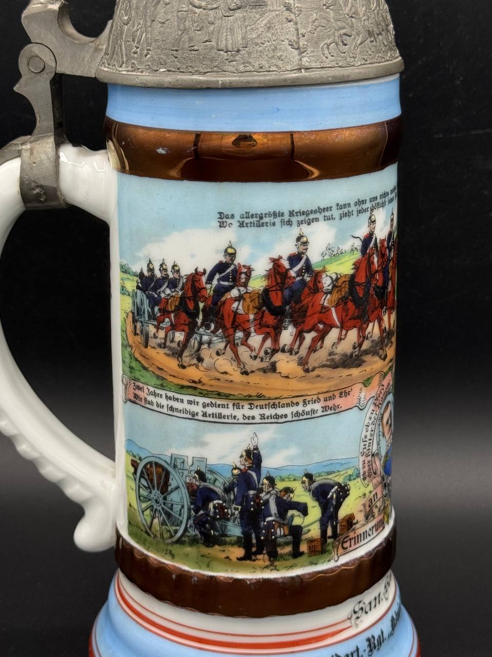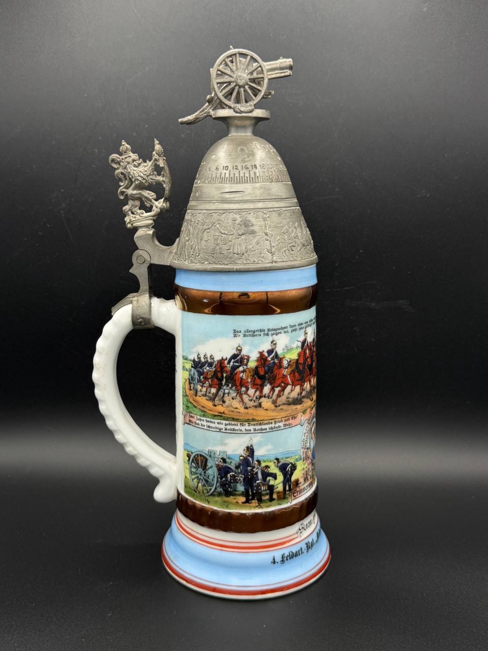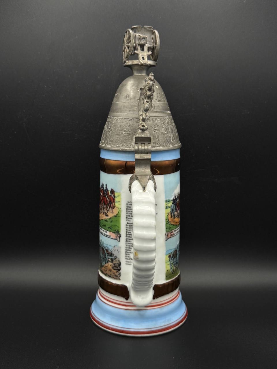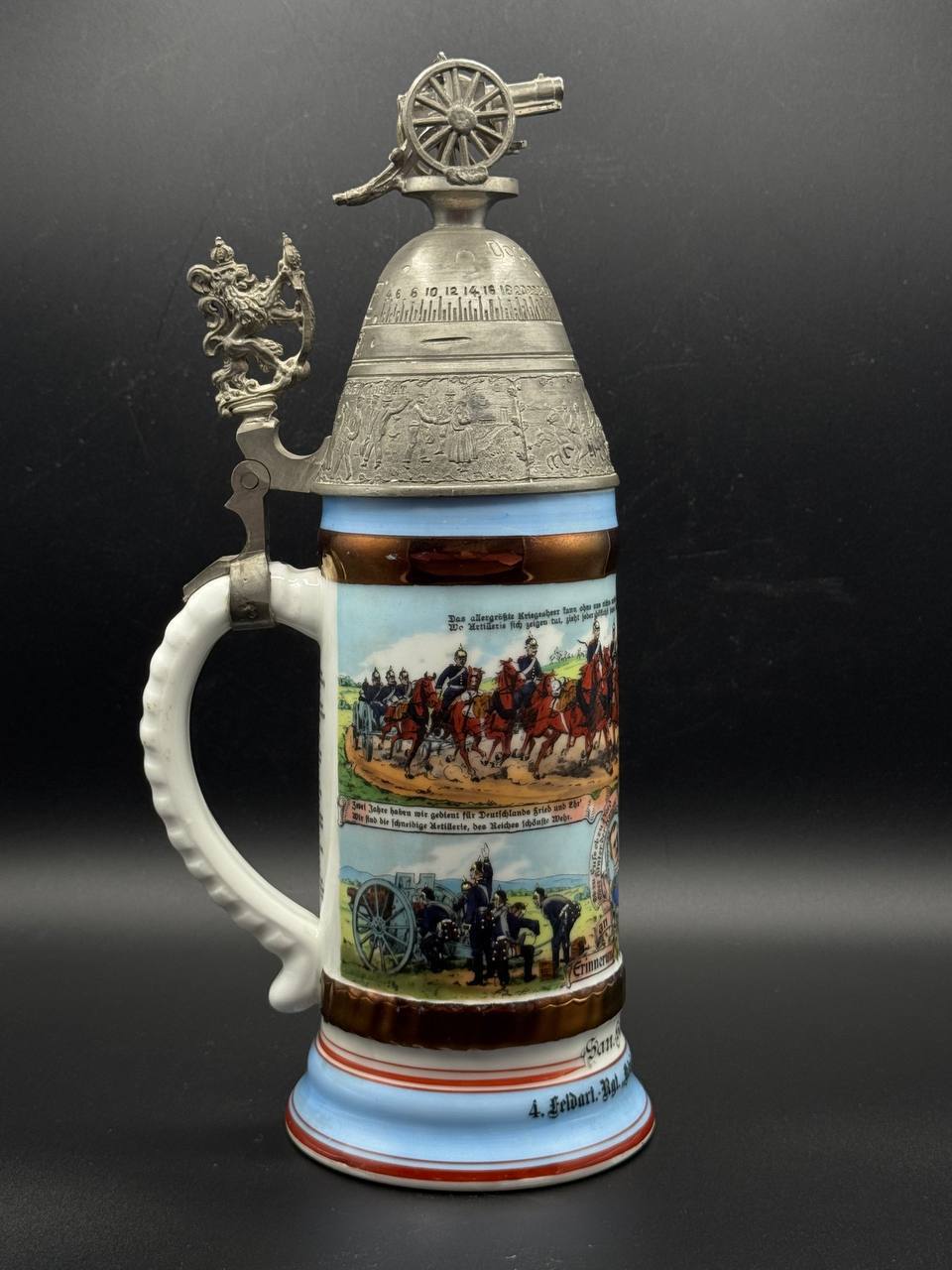 Vibrant hand-painted panels show galloping artillery teams and gun crews in action, framed by patriotic mottos such as “Two years we served for Germany’s peace and honor.” Pewter lid shaped like a shell, topped by a detailed cannon finial and relief war scenes. Handle with Bavarian lion thumb lift, interior lithophane depicting soldier and sweetheart.