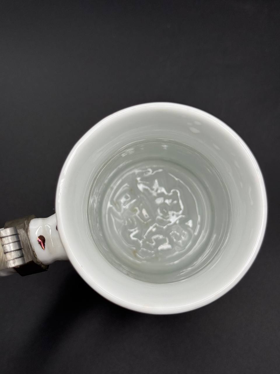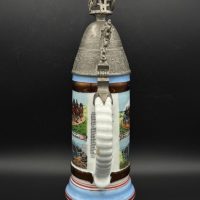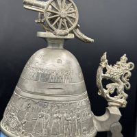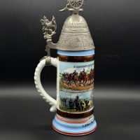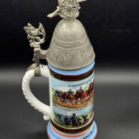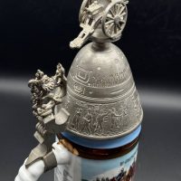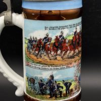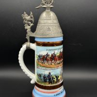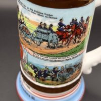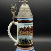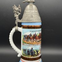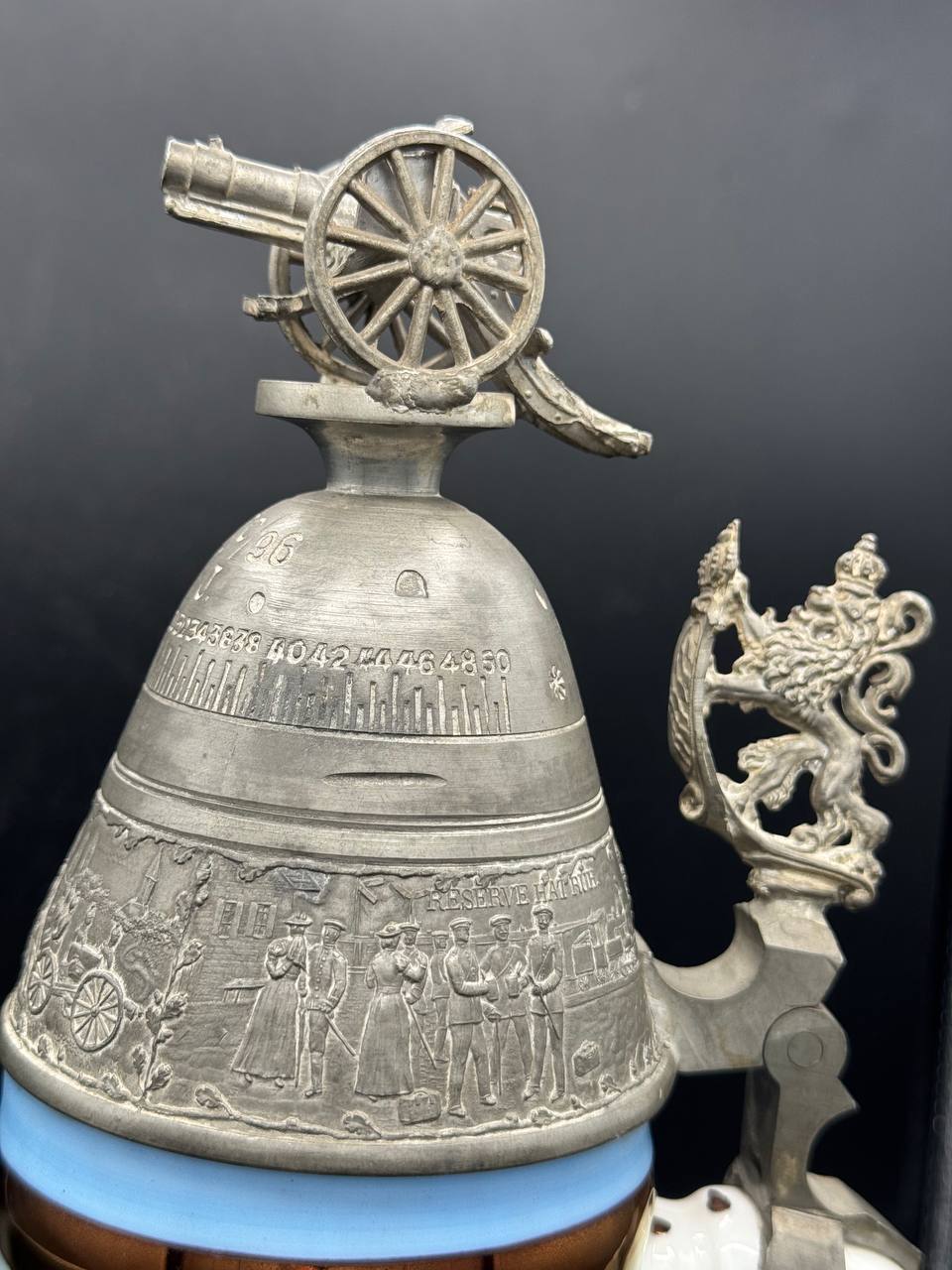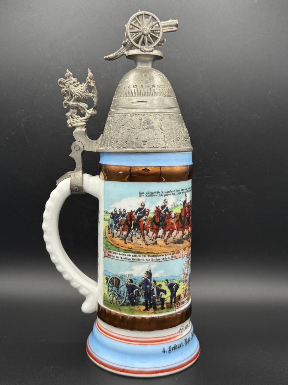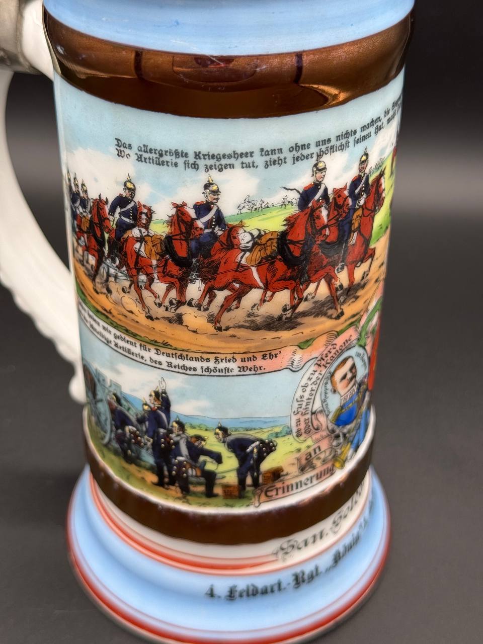 Vibrant hand-painted panels show galloping artillery teams and gun crews in action, framed by patriotic mottos such as “Two years we served for Germany’s peace and honor.” Pewter lid shaped like a shell, topped by a detailed cannon finial and relief war scenes. Handle with Bavarian lion thumb lift, interior lithophane depicting soldier and sweetheart.
