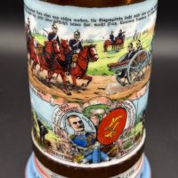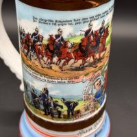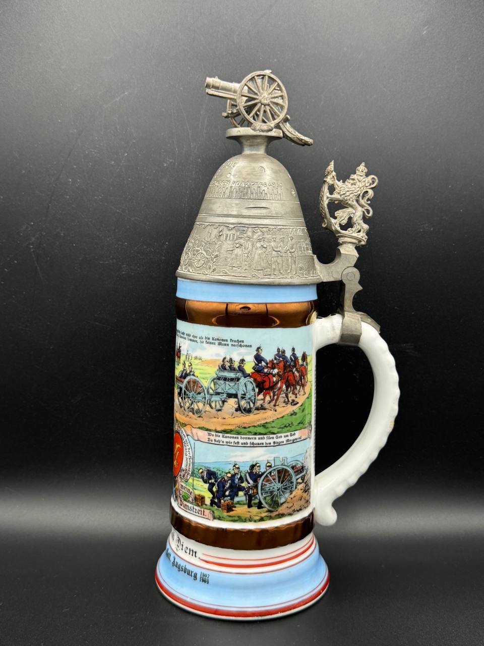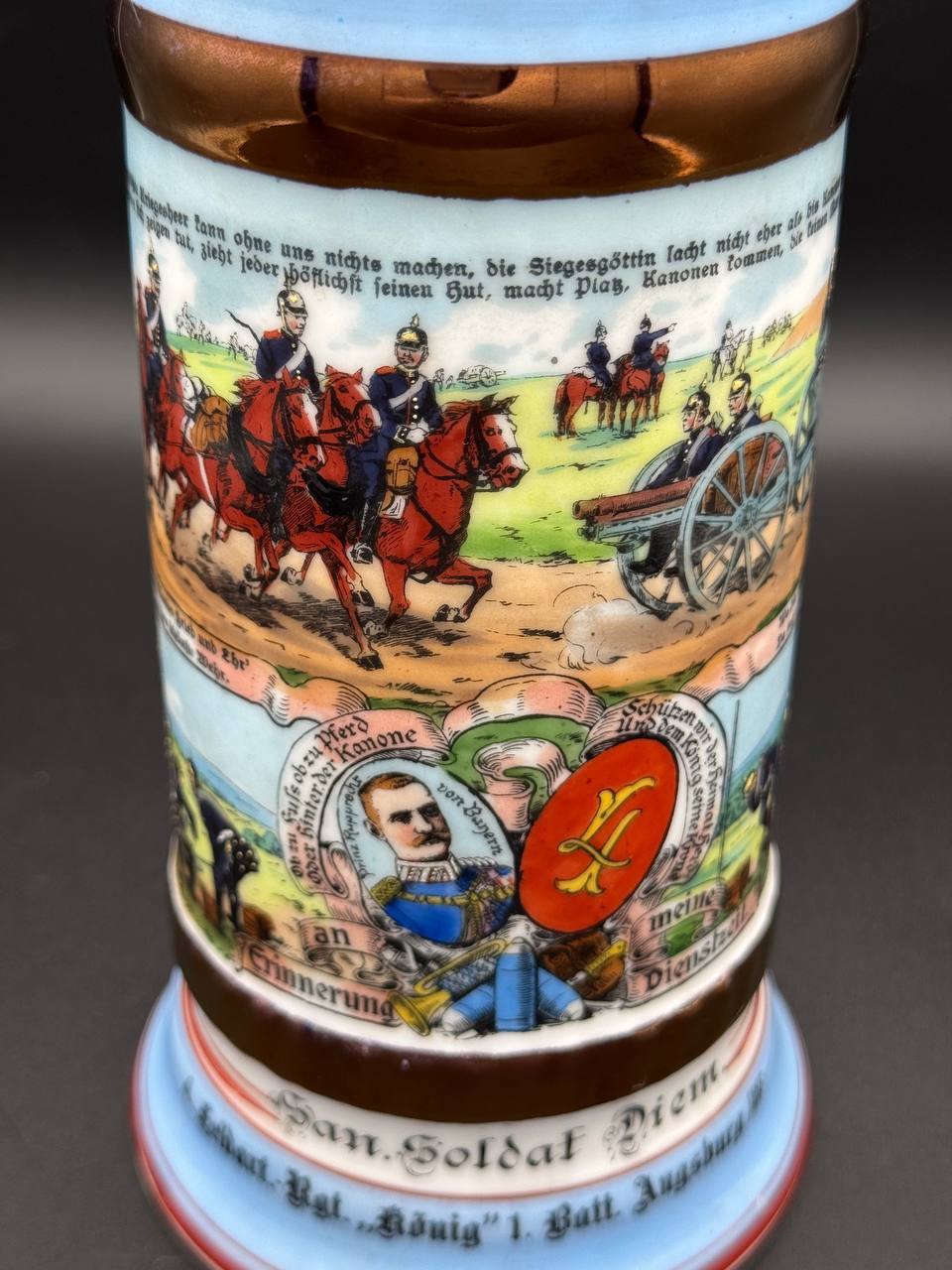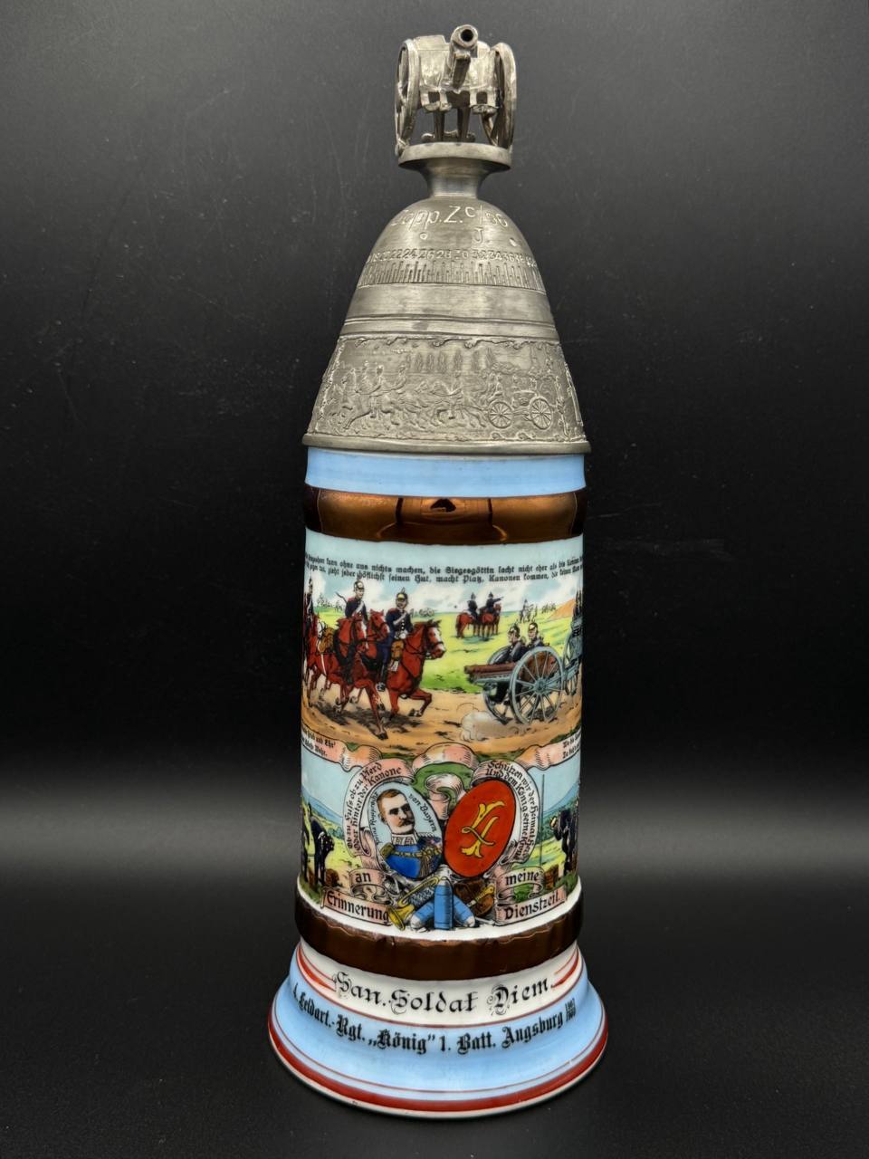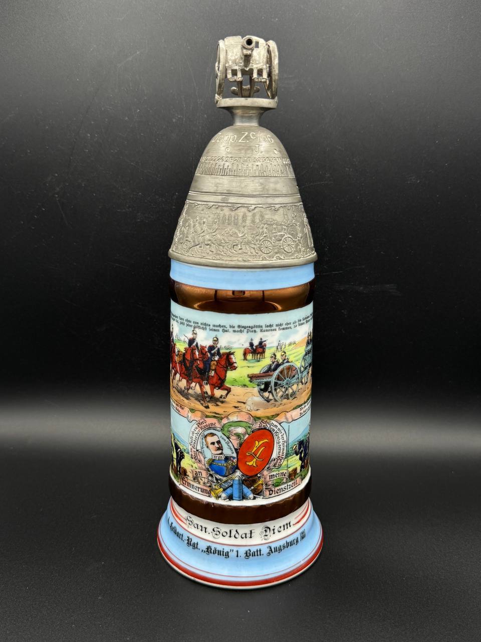 A superb regimental stein commemorating the service of Sanitäts-Soldat Diem with the 4th Bavarian Field Artillery Regiment “König,” 1st Battery, stationed in Augsburg.