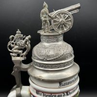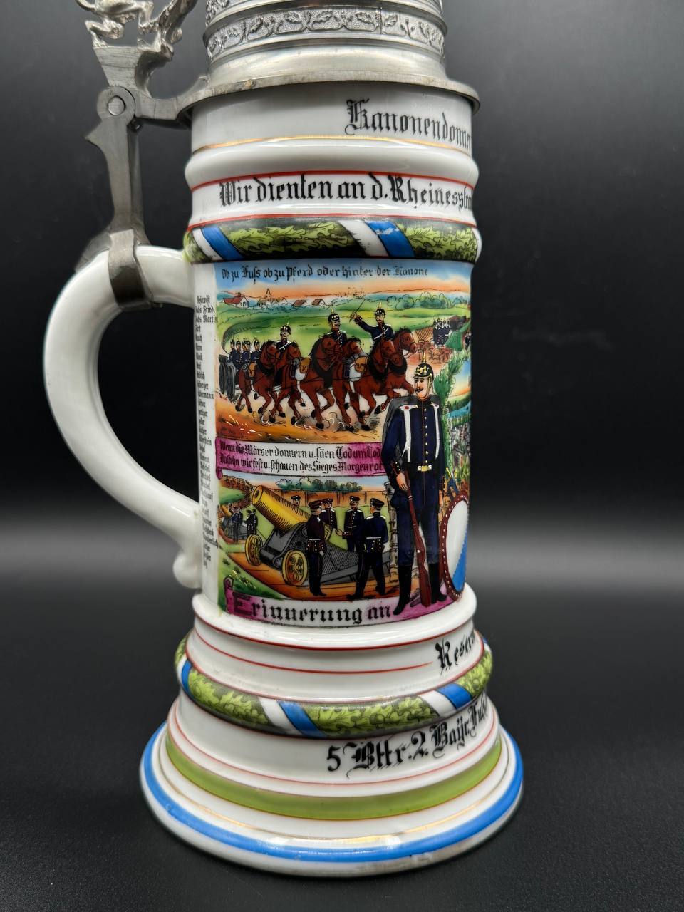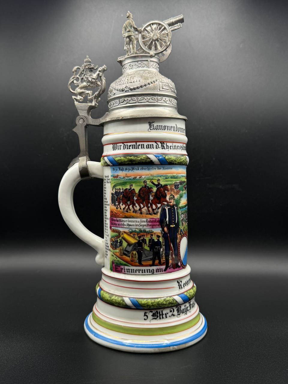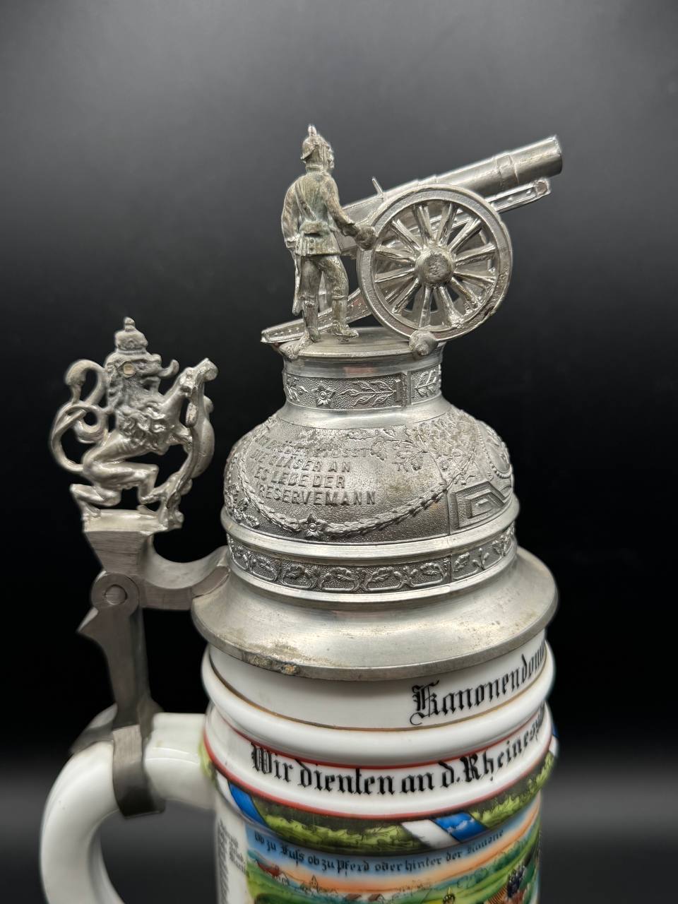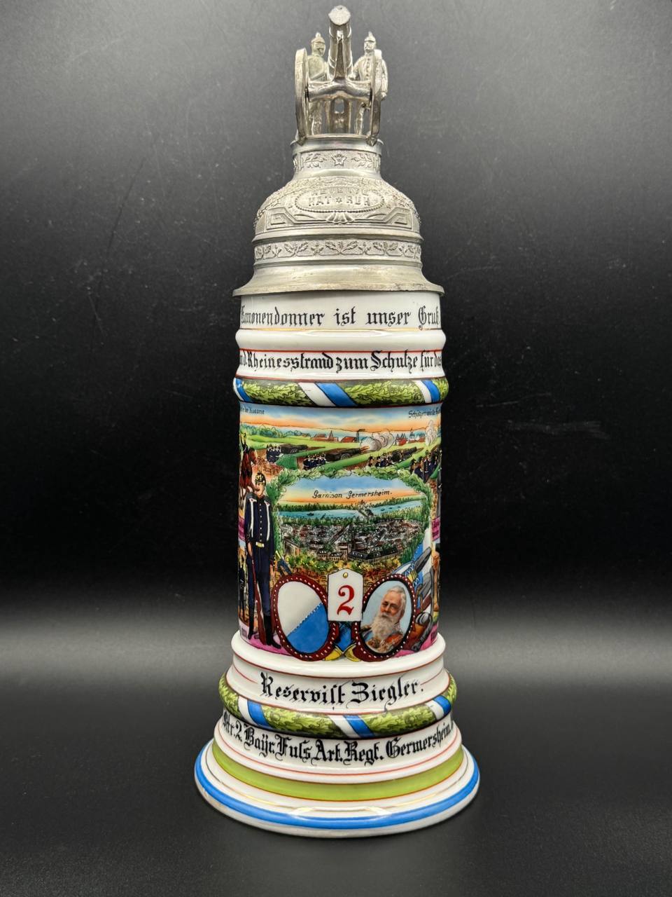 A superb early 20th-century regimental stein commemorating the service of Reservist Ziegler with the 5th Battery of the 2nd Bavarian Foot Artillery Regiment stationed at Germersheim, on the Rhine. The richly hand-painted body depicts heavy artillery crews in training, horse teams in the field, and a panoramic view of the Germersheim fortress. The motto “Wir dienen am d. Rheinesstrand zum Schutze für das Vaterland” (“We serve on the banks of the Rhine for the defense of the Fatherland”) runs around the top border. The pewter lid features an artilleryman with a field gun and a Bavarian lion thumb lift, symbolizing the proud Bavarian artillery tradition.