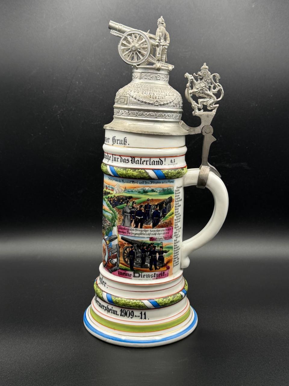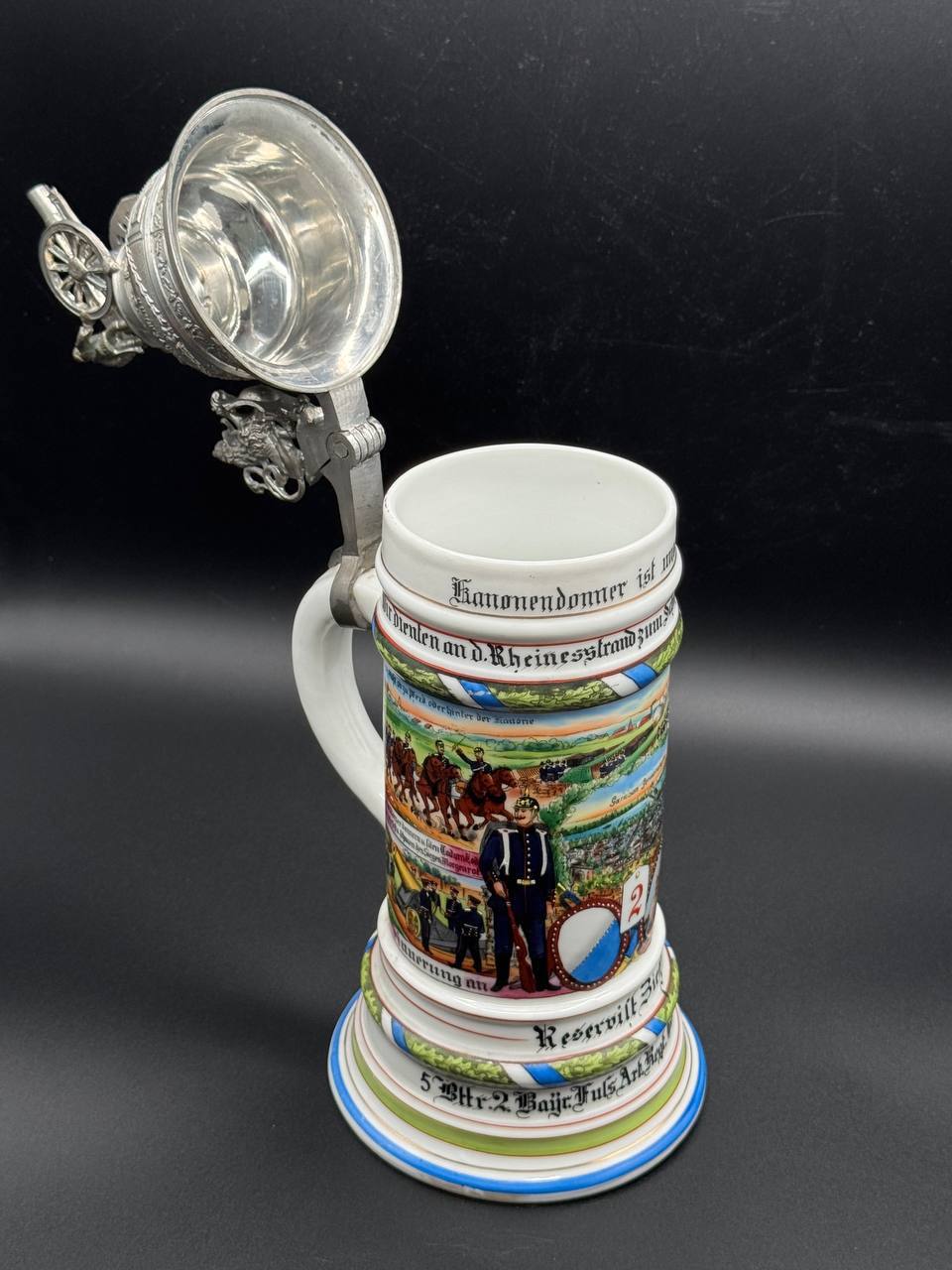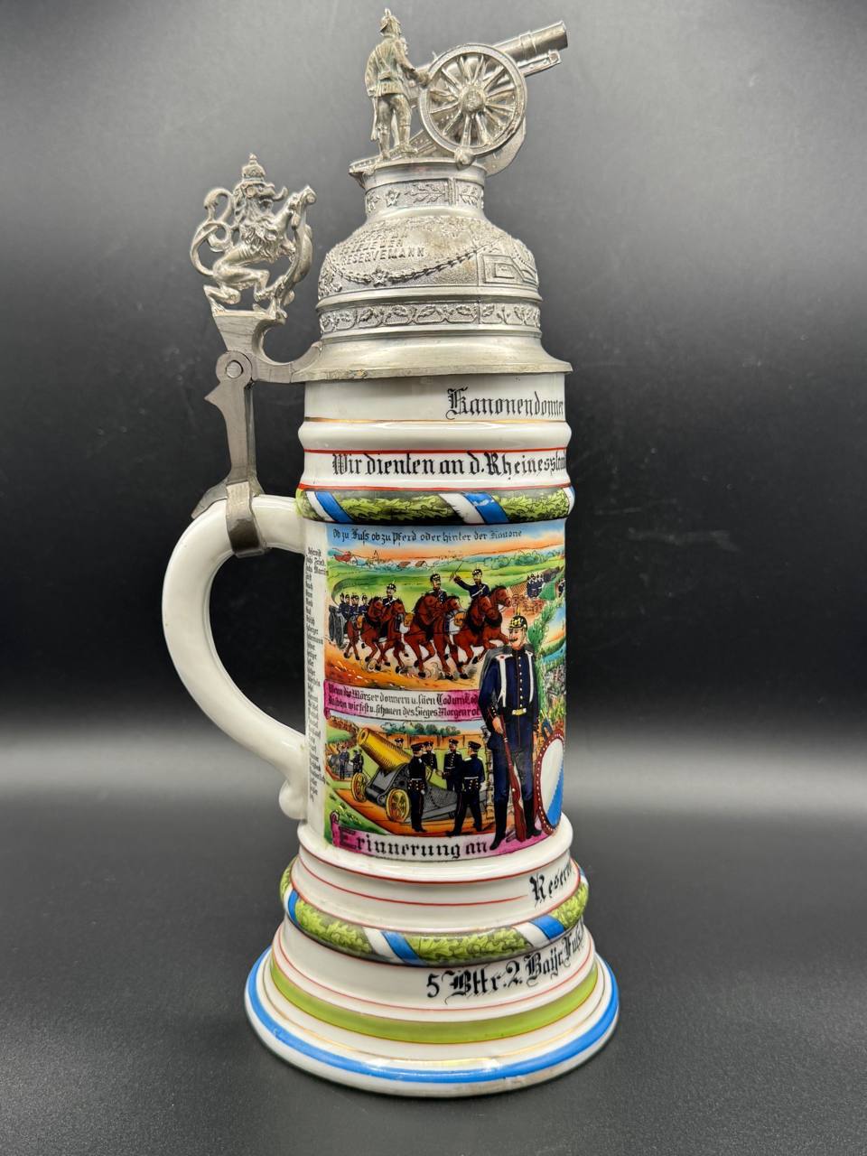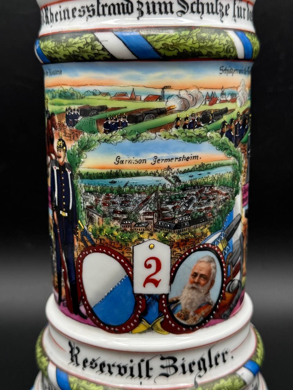A superb early 20th-century regimental stein commemorating the service of Reservist Ziegler with the 5th Battery of the 2nd Bavarian Foot Artillery Regiment stationed at Germersheim, on the Rhine. The richly hand-painted body depicts heavy artillery crews in training, horse teams in the field, and a panoramic view of the Germersheim fortress. The motto “Wir dienen am d. Rheinesstrand zum Schutze für das Vaterland” (“We serve on the banks of the Rhine for the defense of the Fatherland”) runs around the top border. The pewter lid features an artilleryman with a field gun and a Bavarian lion thumb lift, symbolizing the proud Bavarian artillery tradition.