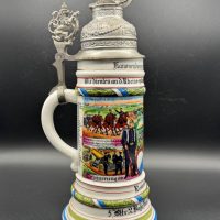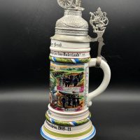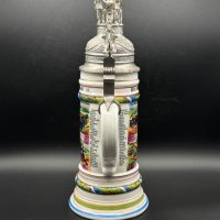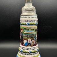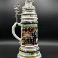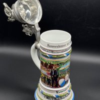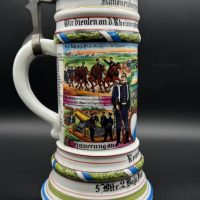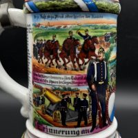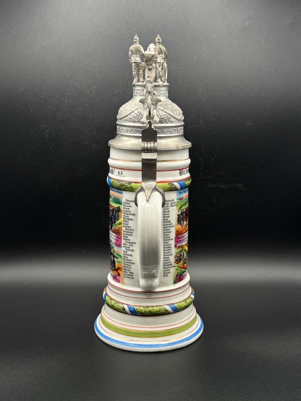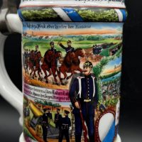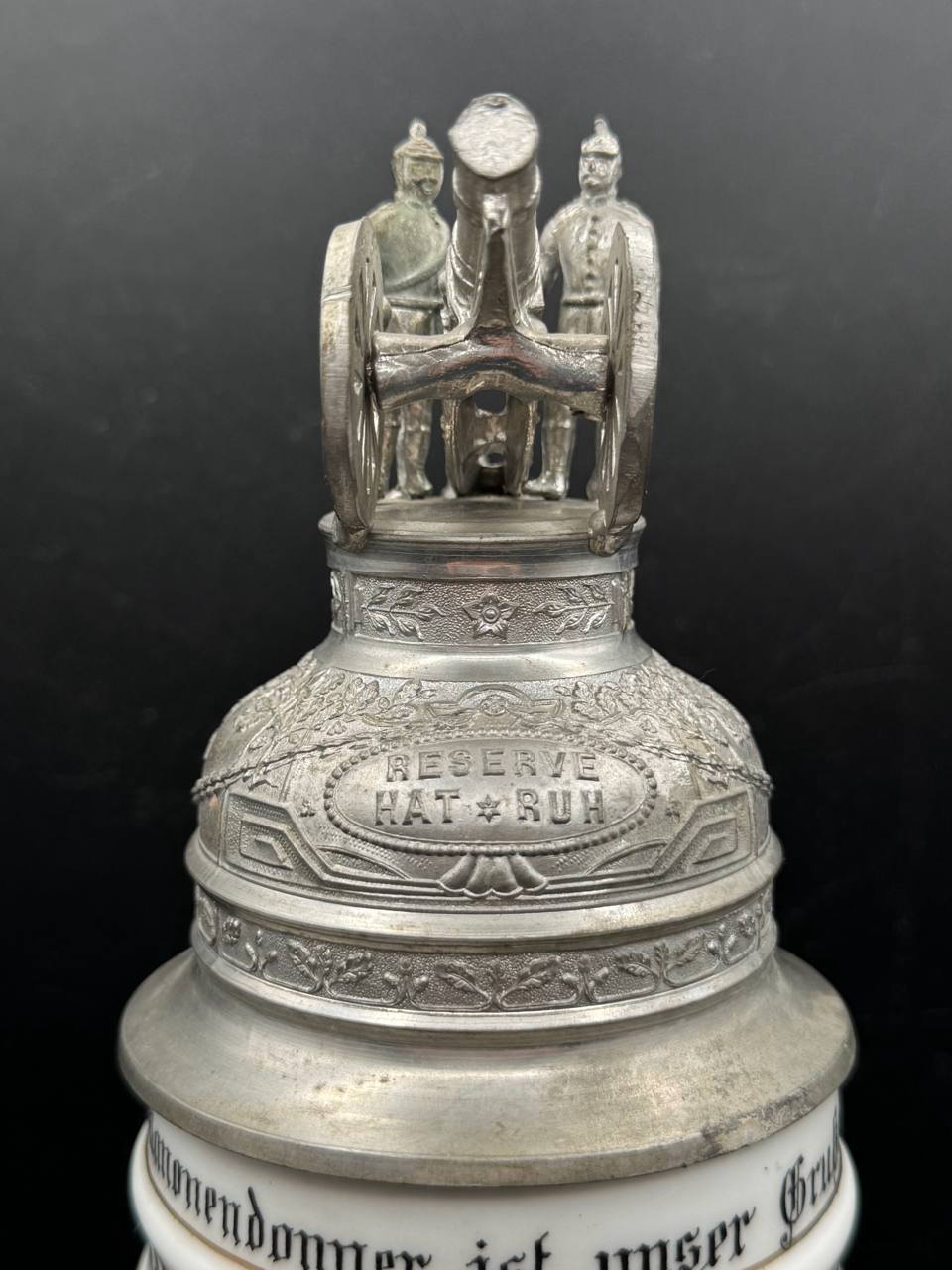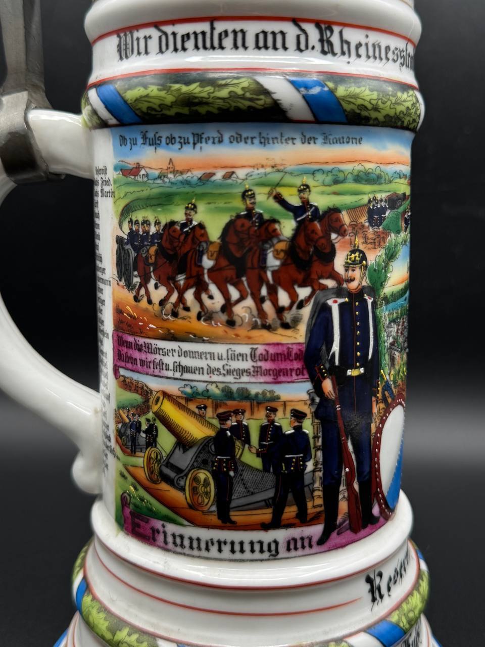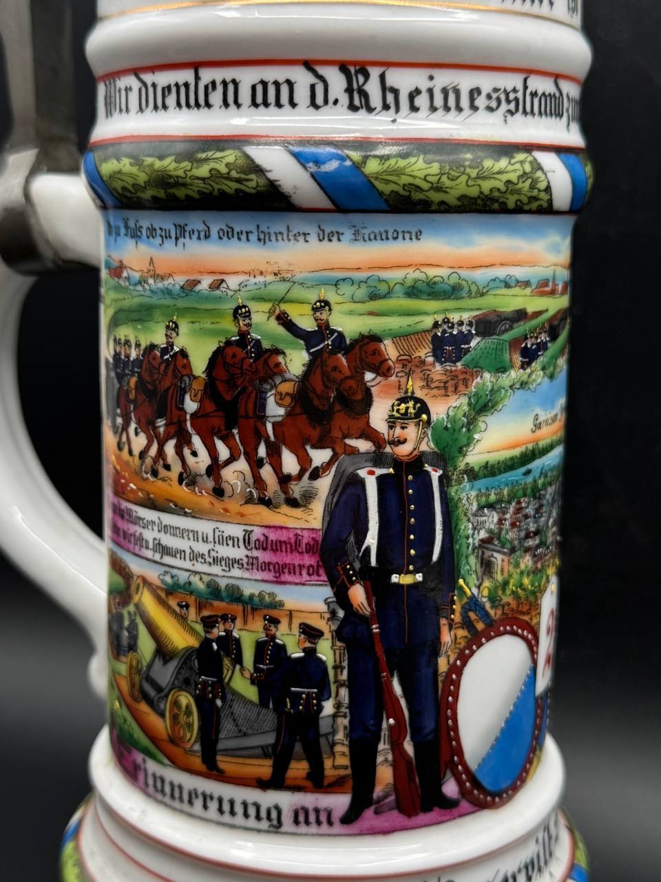 A superb early 20th-century regimental stein commemorating the service of Reservist Ziegler with the 5th Battery of the 2nd Bavarian Foot Artillery Regiment stationed at Germersheim, on the Rhine. The richly hand-painted body depicts heavy artillery crews in training, horse teams in the field, and a panoramic view of the Germersheim fortress. The motto “Wir dienen am d. Rheinesstrand zum Schutze für das Vaterland” (“We serve on the banks of the Rhine for the defense of the Fatherland”) runs around the top border. The pewter lid features an artilleryman with a field gun and a Bavarian lion thumb lift, symbolizing the proud Bavarian artillery tradition.