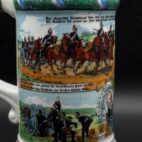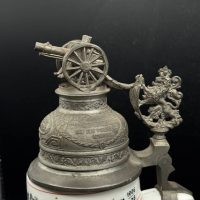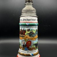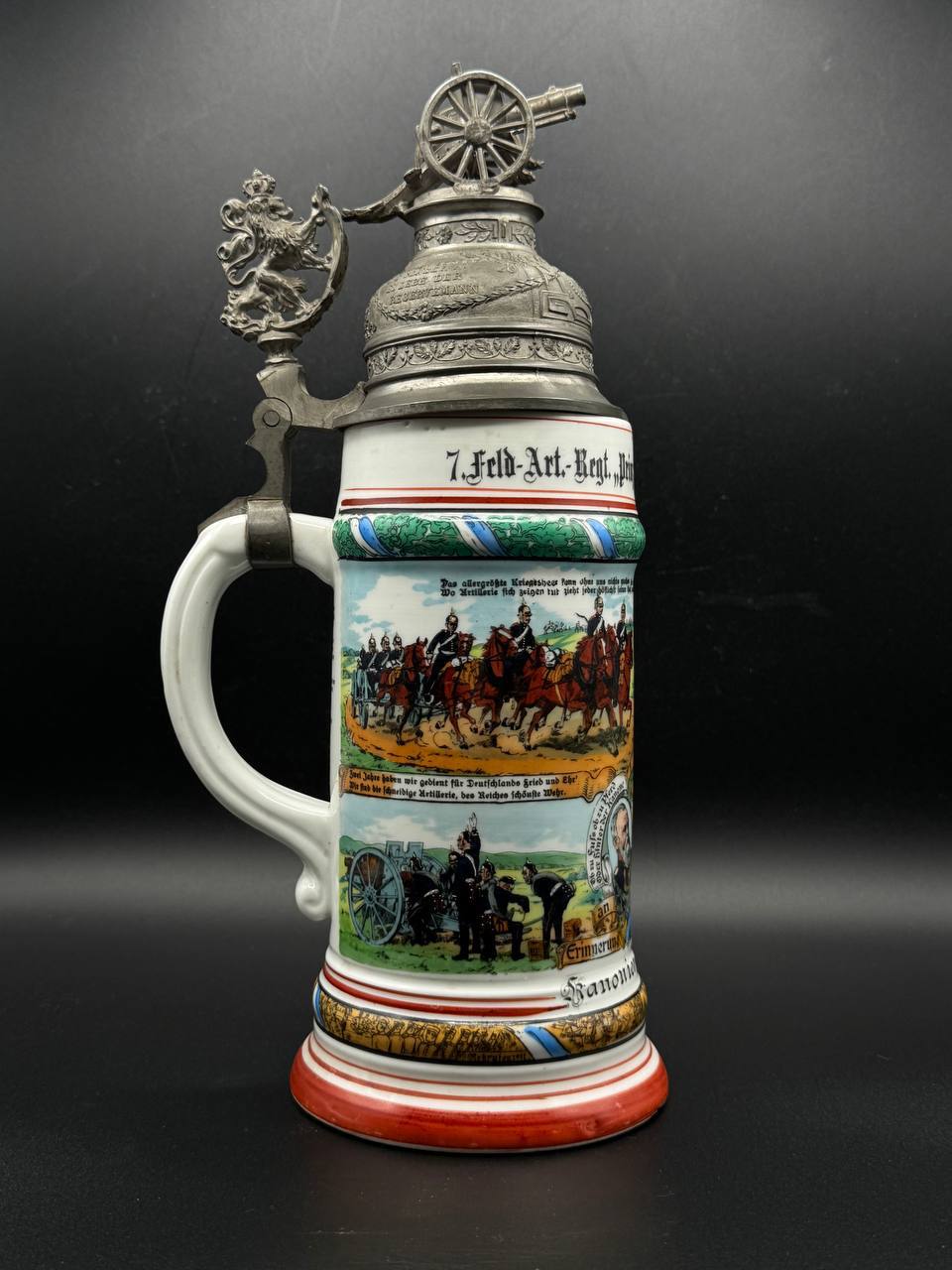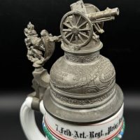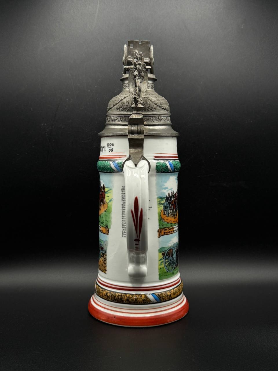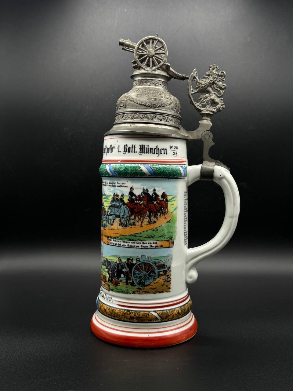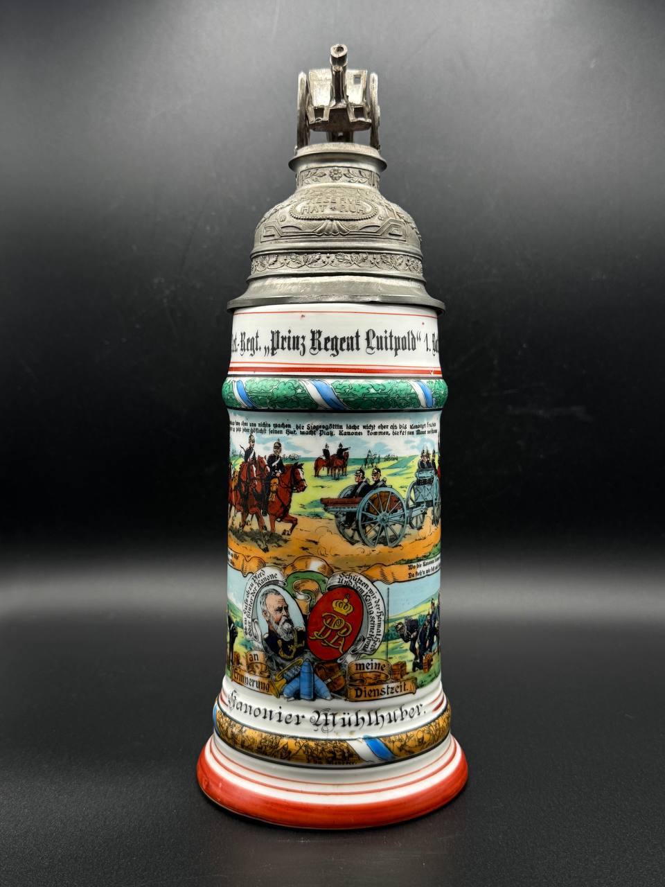 A fine early 20th-century regimental stein belonging to Gunner Mühlhuber, commemorating his service in the 7th Field Artillery Regiment “Prinzregent Luitpold”, 1st Battery, based in Munich during 1906–1908. The hand-painted porcelain body vividly depicts mounted artillery units in training and gun crews in action, with the patriotic motto “Drei Jahre haben wir gedient für Deutschlands Fried’ und Ehr’” (“Three years we served for Germany’s peace and honor”).