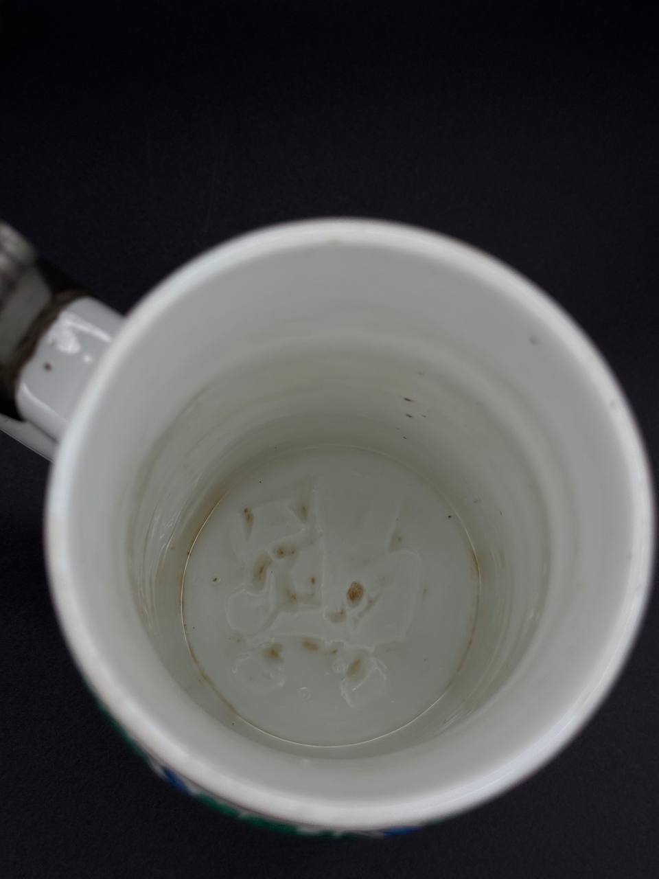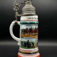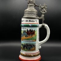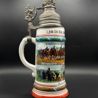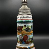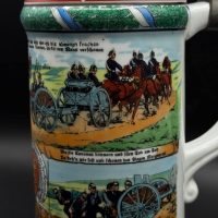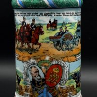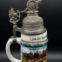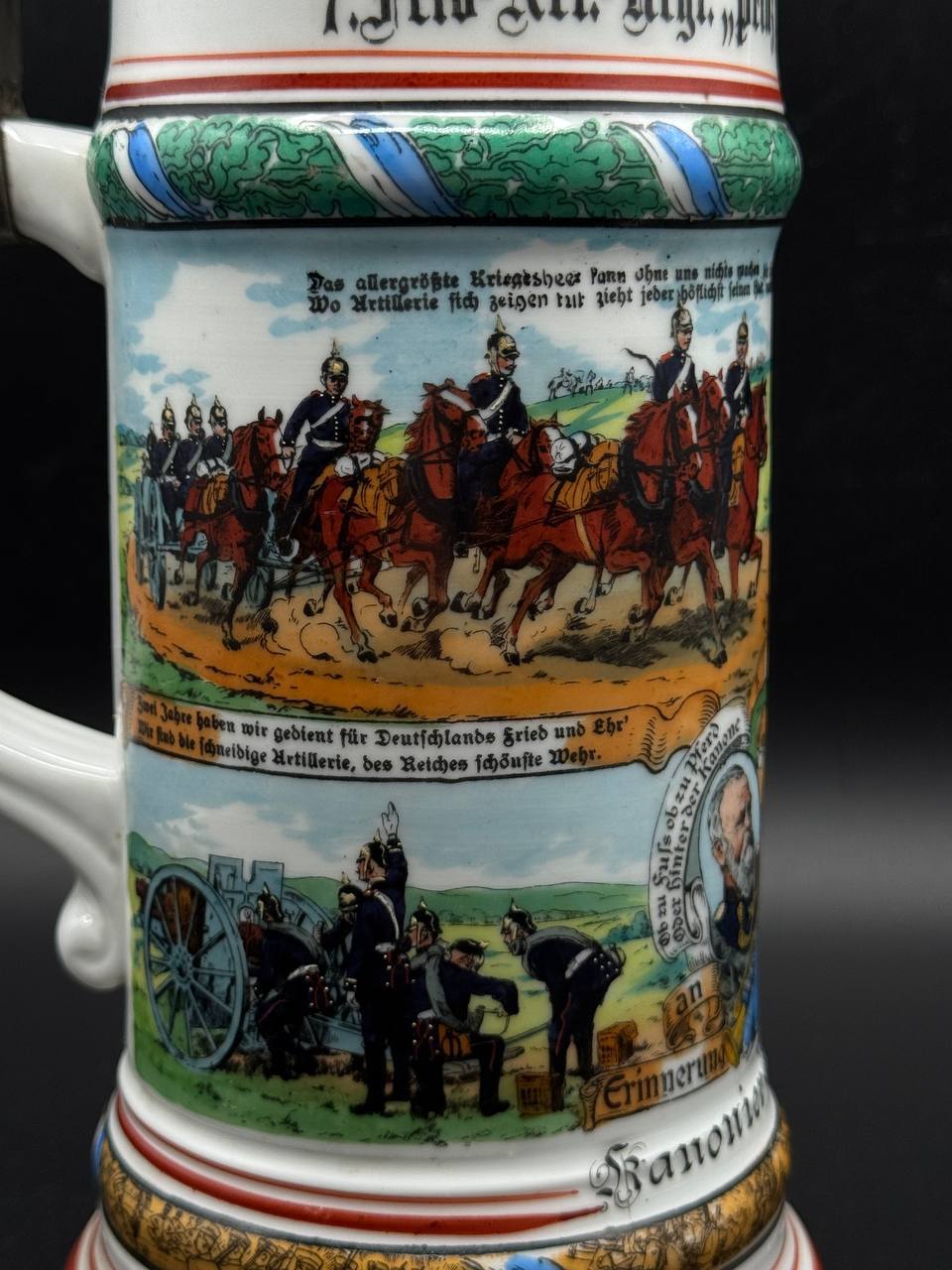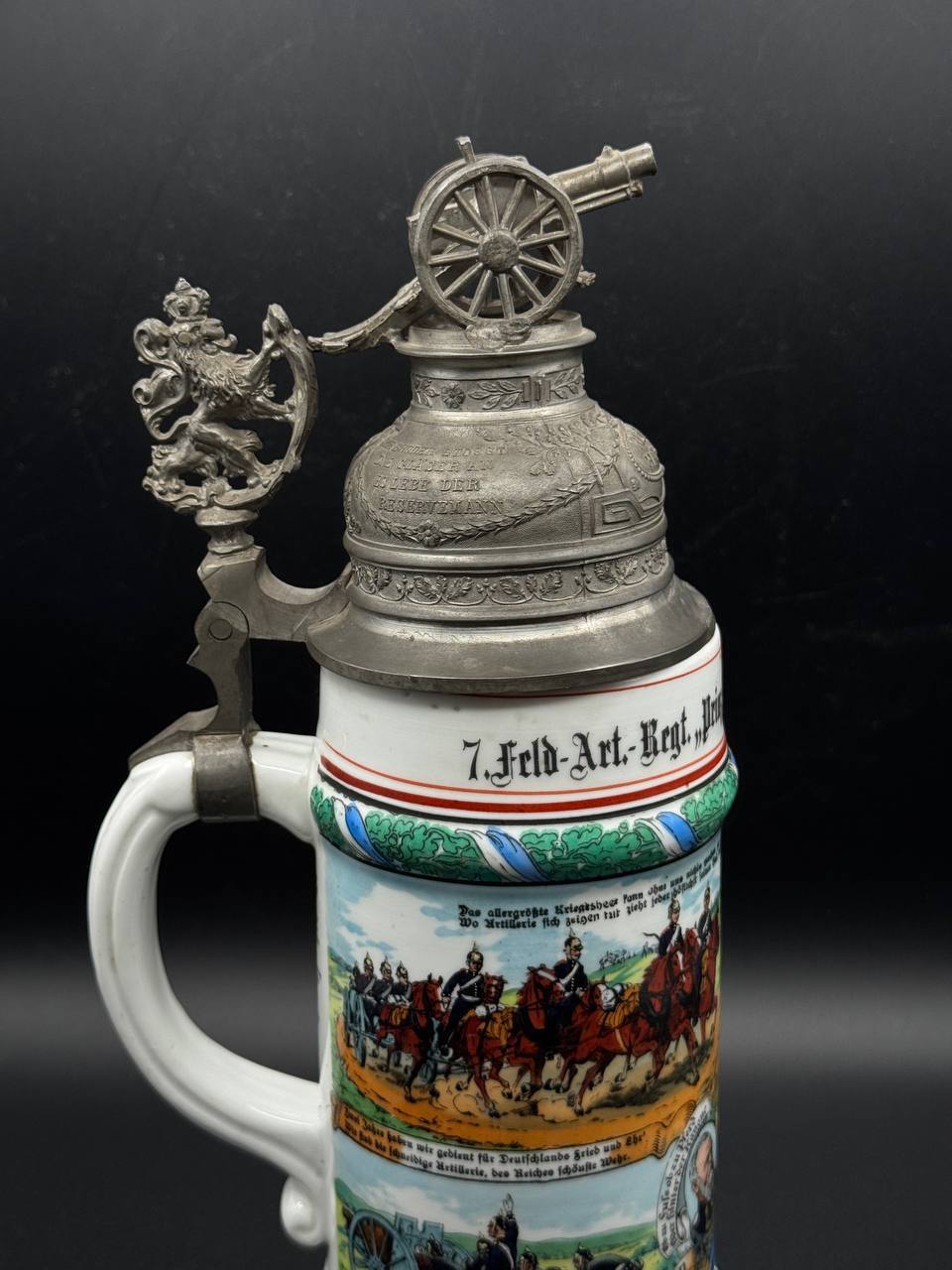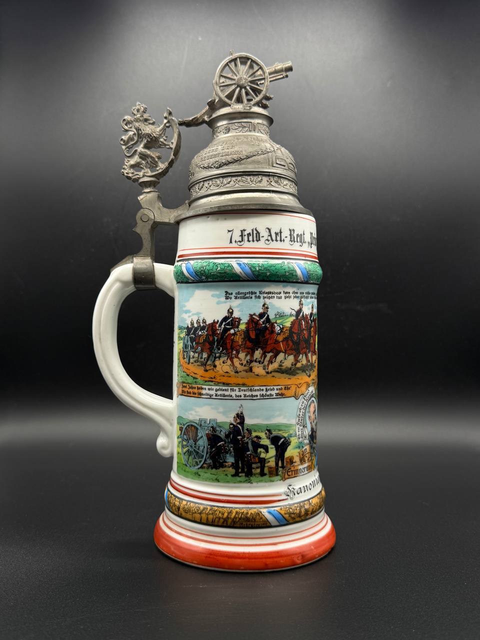 A fine early 20th-century regimental stein belonging to Gunner Mühlhuber, commemorating his service in the 7th Field Artillery Regiment “Prinzregent Luitpold”, 1st Battery, based in Munich during 1906–1908. The hand-painted porcelain body vividly depicts mounted artillery units in training and gun crews in action, with the patriotic motto “Drei Jahre haben wir gedient für Deutschlands Fried’ und Ehr’” (“Three years we served for Germany’s peace and honor”).