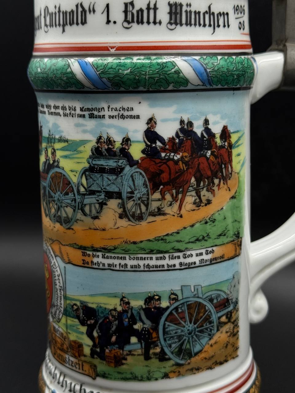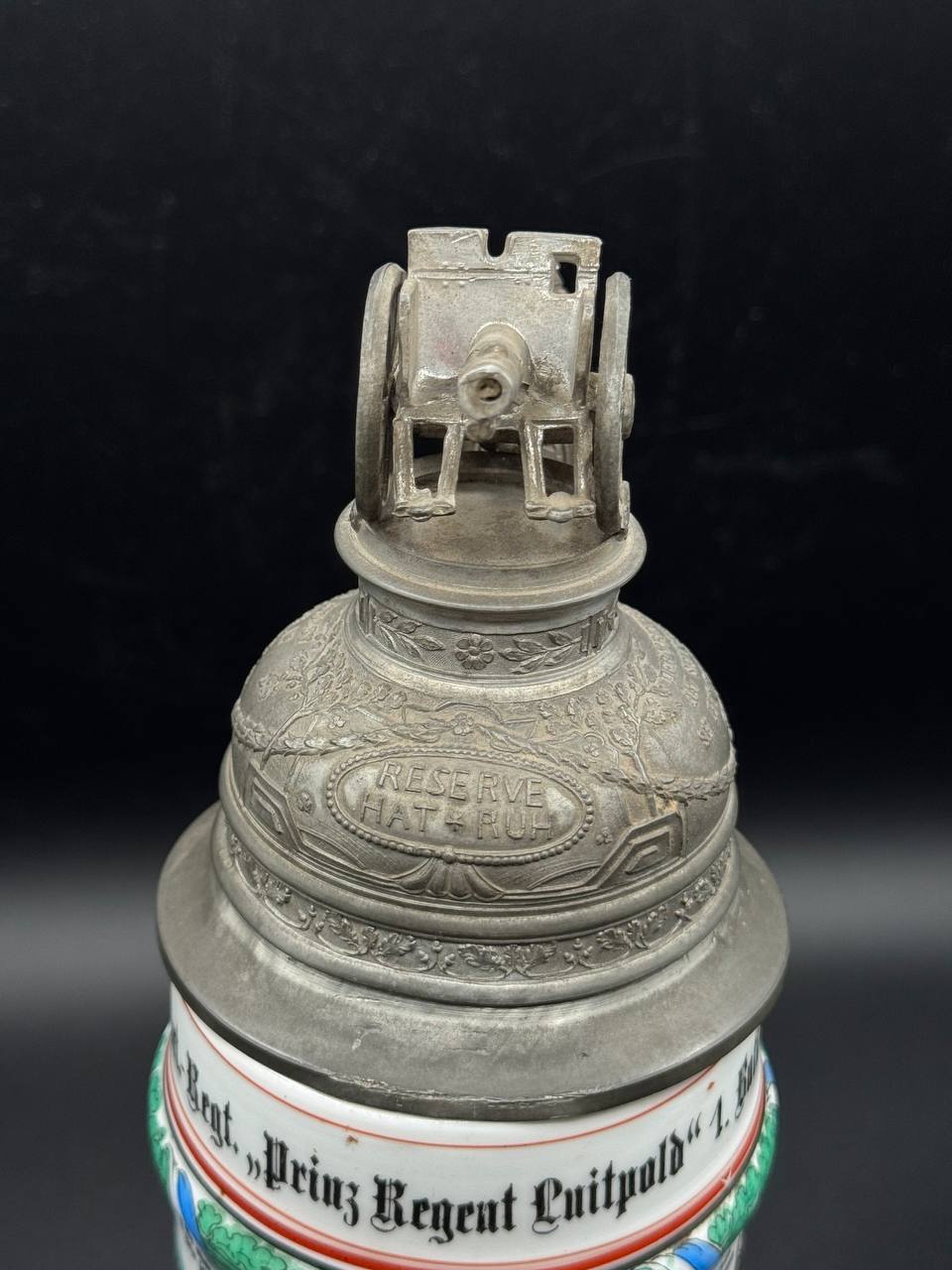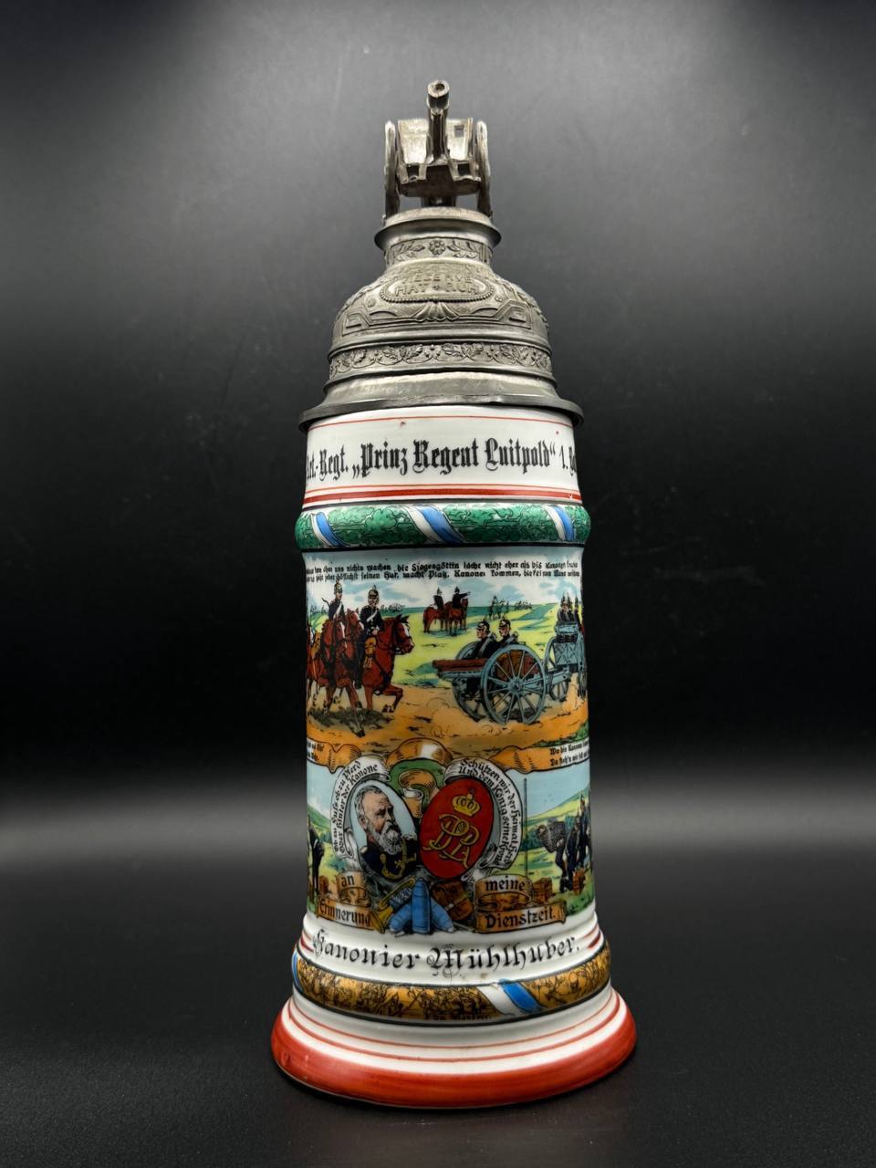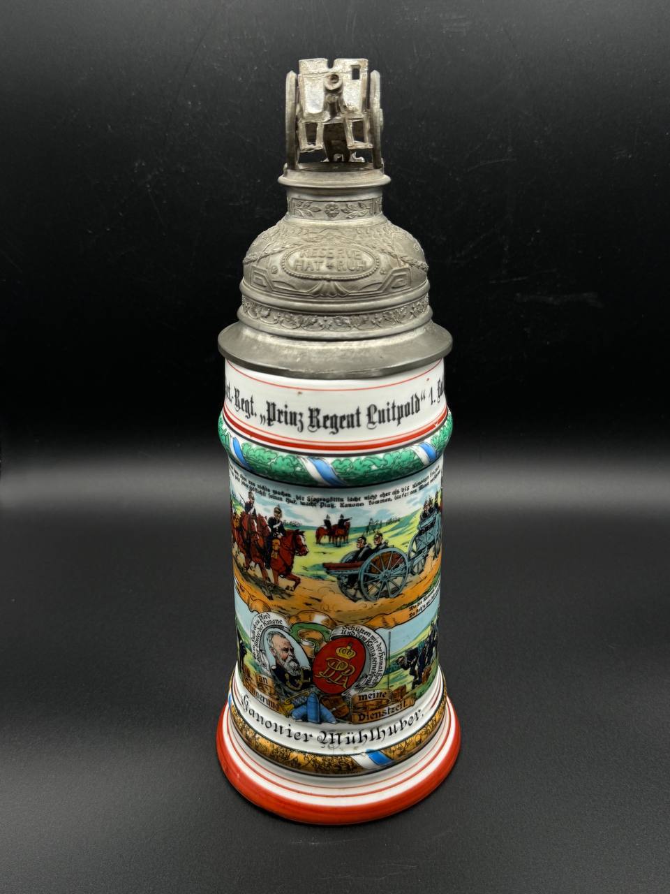 The front features the crowned initials PL of Prince Regent Luitpold, surrounded by ornamental motifs and regimental banners. Pewter lid with artilleryman and cannon finial, Bavarian lion thumb lift, and lithophane inside showing the classic “soldier’s farewell” scene. Rich color, fine detail, and strong glaze make this an outstanding example of Munich-produced reservist art from the pre-WWI period.